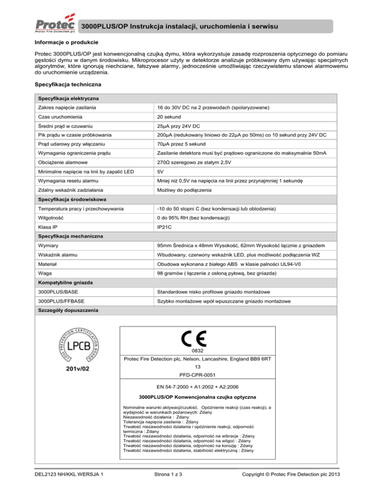 3000PLUS/OP Instrukcja instalacji, uruchomienia i serwisu Informacje o produkcie Protec 3000PLUS/OP jest konwencjonalną czujką dymu, która wykorzystuje zasadę rozproszenia optycznego do pomiaru gęstości dymu w danym środowisku. Mikroprocesor użyty w detektorze analizuje próbkowany dym używając specjalnych algorytmów, które ignorują niechciane, fałszywe alarmy, jednocześnie umożliwiając rzeczywistemu stanowi alarmowemu do uruchomienie urządzenia. Specyfikacja techniczna Specyfikacja elektryczna Zakres napięcie zasilania 16 do 30V DC na 2 przewodach (spolaryzowane) Czas uruchomienia 20 sekund Średni prąd w czuwaniu 25µA przy 24V DC Pik prądu w czasie próbkowania 200µA (redukowany liniowo do 22µA po 50ms) co 10 sekund przy 24V DC Prąd udarowy przy włączaniu 70µA przez 5 sekund Wymagania ograniczenia prądu Zasilanie detektora musi być prądowo ograniczone do maksymalnie 50mA Obciążenie alarmowe 270Ω szeregowo ze stałym 2,5V Minimalne napięcie na linii by zapalić LED 5V Wymagania resetu alarmu Mniej niż 0,5V na napięcia na linii przez przynajmniej 1 sekundę Zdalny wskaźnik zadziałania Możliwy do podłączenia Specyfikacja środowiskowa Temperatura pracy i przechowywania -10 do 50 stopni C (bez kondensacji lub oblodzenia) Wilgotność 0 do 95% RH (bez kondensacji) Klasa IP IP21C Specyfikacja mechaniczna Wymiary 95mm Średnica x 48mm Wysokość, 62mm Wysokość łącznie z gniazdem Wskaźnik alarmu Wbudowany, czerwony wskaźnik LED, plus możliwość podłączenia WZ Materiał Obudowa wykonana z białego ABS w klasie palności UL94-V0 Waga 98 gramów ( łączenie z osłoną pyłową, bez gniazda) Kompatybilne gniazda 3000PLUS/BASE Standardowe nisko profilowe gniazdo montażowe 3000PLUS/FFBASE Szybko montażowe wpół wpuszczane gniazdo montażowe Szczegóły dopuszczenia 0832 Protec Fire Detection plc, Nelson, Lancashire, England BB9 6RT 13 201v/02 PFD-CPR-0051 EN 54-7:2000 + A1:2002 + A2:2006 3000PLUS/OP Konwencjonalna czujka optyczna Nominalne warunki aktywacji/czułość. Opóźnienie reakcji (czas reakcji), a wydajność w warunkach pożarowych: Zdany Niezawodność działania : Zdany Tolerancja napięcia zasilania : Zdany Trwałość niezawodności działania i opóźnienie reakcji, odporność termiczna : Zdany Trwałość niezawodności działania, odporność na wibracje : Zdany Trwałość niezawodności działania, odporność na wilgoć : Zdany Trwałość niezawodności działania, odporność na korozję : Zdany Trwałość niezawodności działania, stabilność elektryczną : Zdany DEL2123 NH/KKL WERSJA 1 Strona 1 z 3 Copyright © Protec Fire Detection plc 2013 3000PLUS/OP Instrukcja instalacji, uruchomienia i serwisu Procedura instalacji i uruchomienia 1. Wytyczne co do montażu czujek (odległości pomiędzy czujkami, odległości od lamp) zgodne w wymogami krajowym. 2. Stosując odpowiednie gniazdo do czujek 3000PLUS podłączamy plusowy, zasilający przewód wejściowy pod zacisk X, a plusowy przewód wyjściowy pod zacisk Y. Oba minusowe przewody podłączamy pod jeden zacisk W. Jeżeli jest wymagany wyniesiony wskaźnik zadziałania to podłączamy go pomiędzy zacisk Y (plus wskaźnika LED), a zacisk Z (minus wskaźnika LED). 3. Upewnij się, czy okablowanie nie jest uszkodzone i nie koliduje z miejscem montażu czujki. Sprawdź zaciski śrubowe okablowania w gnieździe - czy są dokręcone i czy stabilnie trzymają przewód. Umieść czujkę w gnieździe i przekręć ją / obracaj nią zgodnie z ruchem wskazówek zegara, aż czujka wskoczy we właściwe położenie. Następnie przekręć jeszcze o ćwierć obrotu, aż detektor całkowicie zostanie umieszczony w podstawie. Upewnij się, że osłona pyłowa została ściągnięta do testów. 4. W trakcie testów pamiętaj, aby sprawdzić, że gdy usuniesz detektor z gniazdem, pozostałe czujki umieszone na linii wprowadzą włączoną centralę w alarm. Rysunek 1. 3000PLUS/OP – połączenia w gnieździe Wy + (Y) We + (X) + Opcjonalny wyniesiony Wskaźnik Zadziałania (Y do Z) Zacisk ciągłości ekranu Wy - (W) We - (W) Wymagania serwisowe Śruby krzyżakowe Usuń górną komorę i oczyść siatkę oraz plastik Czyść tutaj używając miękkiego pędzelka Dno komory Rysunek 2 – Rozmieszczenie śrub krzyżakowych DEL2123 NH/KKL WERSJA 1 Rysunek 3 – Usunięcie obudowy zewnętrznej, odsłonięcie komory Strona 2 z 3 Copyright © Protec Fire Detection plc 2013 3000PLUS/OP Instrukcja instalacji, uruchomienia i serwisu 3000PLUS/OP Szczegóły serwisu i konserwacji Usuń Czujkę z gniazda, sprawdź na centrali czy zasygnalizowała błąd urządzenia. Usuń dwie śruby krzyżakowe pokazane na rysunku 2. Usuń obudowę zewnętrzną. Usuń deflektor oraz górną osłonę komory, trzymając siatkę w miejscu na górnej osłonie. Upewnij się, że rurka lampki nie zginie. Oczyść osłonę i siatkę miękkim pędzelkiem, użyj również miękkiego pędzelka do czyszczenia w środku dolnej osłony komory (zob. rys. 3) Za pomocą pędzelka wyczyść deflektor. Oczyść osłonę zewnętrzną czujki za pomocą szmatki. By złożyć - na początku umieść deflektor na górnej osłonie komory ustawiając położenie strzałki na środku komory optycznej. Upewnij się, że siatka płasko przylega do osłony komory. Upewnij się, że rurka od lampki jest na swoim miejscu. Upewnij się, że oba obiektywy są umieszone na spodniej osłonie komory. Umieść zespół komory/deflektora na dolnej osłonie komory. Umieść obudowę zewnętrzną używając rurki od lampki jako wskaźnik położenia. Skręć ciasno obudowę przy pomocy dwóch śrub krzyżakowych, uważaj by nie zerwać gwintu na obudowie zewnętrznej. Umieść czujkę z powrotem w gnieździe. Poczekaj na ponowne zalogowanie się czujki w centrali. Następnie aktywuj sensor optyczny by sprawdzić czy centrala się zaktywuje. DEL2123 NH/KKL WERSJA 1 Strona 3 z 3 Copyright © Protec Fire Detection plc 2013