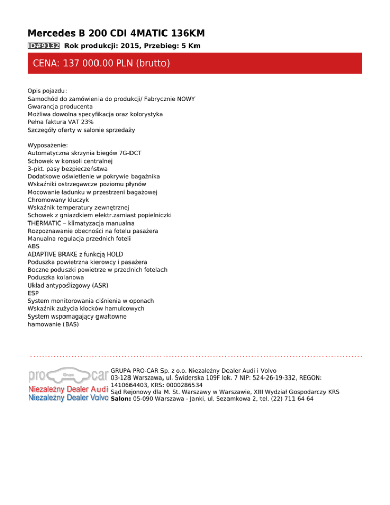 Mercedes B 200 CDI 4MATIC 136KM ID#9132 Rok produkcji: 2015, Przebieg: 5 Km CENA: 137 000.00 PLN (brutto) Opis pojazdu: Samochód do zamówienia do produkcji/ Fabrycznie NOWY Gwarancja producenta Możliwa dowolna specyfikacja oraz kolorystyka Pełna faktura VAT 23% Szczegóły oferty w salonie sprzedaży Wyposażenie: Automatyczna skrzynia biegów 7G-DCT Schowek w konsoli centralnej 3-pkt. pasy bezpieczeństwa Dodatkowe oświetlenie w pokrywie bagażnika Wskaźniki ostrzegawcze poziomu płynów Mocowanie ładunku w przestrzeni bagażowej Chromowany kluczyk Wskaźnik temperatury zewnętrznej Schowek z gniazdkiem elektr.zamiast popielniczki THERMATIC – klimatyzacja manualna Rozpoznawanie obecności na fotelu pasażera Manualna regulacja przednich foteli ABS ADAPTIVE BRAKE z funkcją HOLD Poduszka powietrzna kierowcy i pasażera Boczne poduszki powietrze w przednich fotelach Poduszka kolanowa Układ antypoślizgowy (ASR) ESP System monitorowania ciśnienia w oponach Wskaźnik zużycia klocków hamulcowych System wspomagający gwałtowne hamowanie (BAS) GRUPA PRO-CAR Sp. z o.o. Niezależny Dealer Audi i Volvo 03-128 Warszawa, ul. Świderska 109F lok. 7 NIP: 524-26-19-332, REGON: 1410664403, KRS: 0000286534 Sąd Rejonowy dla M. St. Warszawy w Warszawie, XIII Wydział Gospodarczy KRS Salon: 05-090 Warszawa - Janki, ul. Sezamkowa 2, tel. (22) 711 64 64