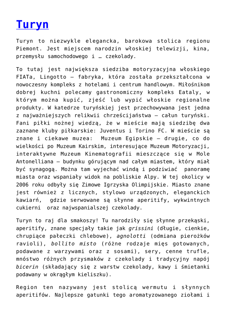 Turyn Turyn to niezwykle elegancka, barokowa stolica regionu Piemont. Jest miejscem narodzin włoskiej telewizji, kina, przemysłu samochodowego i … czekolady. To tutaj jest największa siedziba motoryzacyjna włoskiego FIATa, Lingotto – fabryka, która została przekształcona w nowoczesny kompleks z hotelami i centrum handlowym. Miłośnikom dobrej kuchni polecamy gastronomiczny kompleks Eataly, w którym można kupić, zjeść lub wypić włoskie regionalne produkty. W katedrze turyńskiej jest przechowywana jest jedna z najważniejszych relikwii chrześcijaństwa – całun turyński. Fani piłki nożnej wiedzą, że w mieście mają siedzibę dwa zaznane kluby piłkarskie: Juventus i Torino FC. W mieście są znane i ciekawe muzea: Muzeum Egipskie – drugie, co do wielkości po Muzeum Kairskim, interesujące Muzeum Motoryzacji, interaktywne Muzeum Kinematografii mieszczące się w Mole Antonelliana – budynku górującym nad całym miastem, który miał być synagogą. Można tam wyjechać windą i podziwiać panoramę miasta oraz wspaniały widok na pobliskie Alpy. W tej okolicy w 2006 roku odbyły się Zimowe Igrzyska Olimpijskie. Miasto znane jest również z licznych, stylowo urządzonych, eleganckich kawiarń, gdzie serwowane są słynne aperitify, wykwintnych cukierni oraz najwspanialszej czekolady. Turyn to raj dla smakoszy! Tu narodziły się słynne przekąski, aperitify, znane specjały takie jak grissini (długie, cienkie, chrupiące pałeczki chlebowe), agnolotti (odmiana pierożków ravioli), bollito misto (różne rodzaje mięs gotowanych, podawane z warzywami oraz z sosami), sery, cenne trufle, mnóstwo różnych przysmaków z czekolady i tradycyjny napój bicerin (składający się z warstw czekolady, kawy i śmietanki podawany w okrągłym kieliszku). Region ten nazywany jest stolicą wermutu i słynnych aperitifów. Najlepsze gatunki tego aromatyzowanego ziołami i przyprawami alkoholu to Carpano, Cinzano i Martini Rossi, najbardziej znane czerwone wina to Barolo, Barbaresco, Nebbiolo, Dolcetto, Barbera oraz białe, ekskluzywne Moscato d’Asti DOCG. 1 dzień: przylot na lotnisko w Turynie, transfer do hotelu. Czas wolny. Nocleg. 2 dzień: śniadanie w hotelu. Zwiedzanie miasta z przewodnikiem (2 godz.) spacer ulicami po centrum miasta oraz po licznych placach. W trakcie spaceru podziwianie m.in. dzieł znanych artystów, arcydzieł baroku Pałacu Królewskiego, Palazzo Madama i Palazzo Carignano, spacer słynnymi arkadami, odwiedzenie historycznych kawiarń i cukierni. Po południu sugerujemy zwiedzanie Muzeum Egipskiego, Muzeum Kinematografii lub Muzeum Motoryzacji. Powrót do hotelu. Nocleg. 3 dzień: śniadanie w hotelu. Czas wolny lub proponujemy zwiedzanie: Venaria Reale i wizyta w Pałacu Królewskim. Podczas wizyty poznać można historię najstarszej, zwiedzanie Royal Palace oraz katedry turyńskiej wraz z całunem turyńskim. Choco pass, wycieczka po mieście z przewodnikiem szlakiem najbardziej znanych kawiarń, cukierni i sklepów z prawdziwymi czekoladowymi przysmakami, wyrabianymi według tradycyjnych receptur wraz z historią miasta Powrót do hotelu. Nocleg. 4 dzień: śniadanie w hotelu. Transfer na lotnisko w Turynie. Powrót do kraju. Hotel ****, położony w centrum miasta Osoba w pokoju 2 osobowym 180 Euro Hotel ***/**** położony blisko centrum Osoba w pokoju 2 osobowym 142 Euro Cena zawiera: 3 noclegi ze śniadaniem (bufet), od osoby przy min. 2 os (za wyjątkiem terminów w których odbywają się targi), transfer z i na lotnisko, zwiedzanie z przewodnikiem (2 godz.). Cena nie obejmuje: biletu lotniczego – po potwierdzeniu terminu podamy konkretny koszt, taksy klimatycznej (płatna na miejscu). */zdjęcia są własnością Piemonte Region.