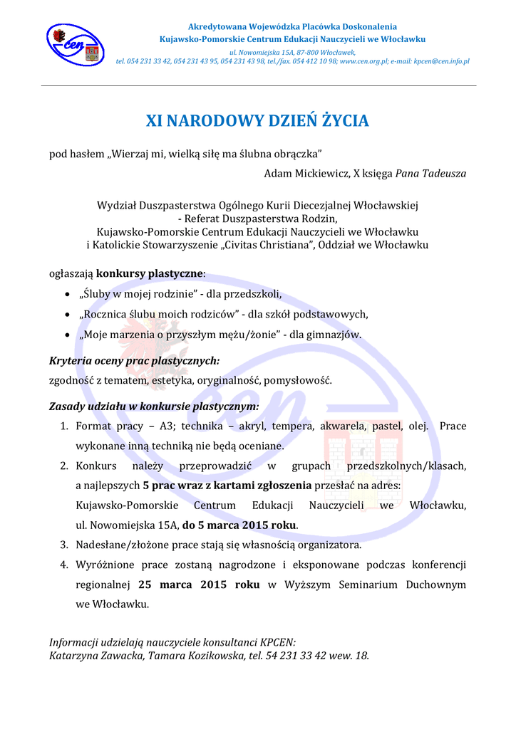 AkredytowanaWojewódzkaPlacówkaDoskonalenia Kujawsko‐PomorskieCentrumEdukacjiNauczycieliweWłocławku ul.Nowomiejska15A,87‐800Włocławek, tel.0542313342,0542314395,0542314398,tel./fax.0544121098;www.cen.org.pl;e‐mail:[email protected] XINARODOWYDZIEŃŻYCIA podhasłem„Wierzajmi,wielkąsiłęmaślubnaobrączka” AdamMickiewicz,XksięgaPanaTadeusza WydziałDuszpasterstwaOgólnegoKuriiDiecezjalnejWłocławskiej ‐ReferatDuszpasterstwaRodzin, Kujawsko‐PomorskieCentrumEdukacjiNauczycieliweWłocławku iKatolickieStowarzyszenie„CivitasChristiana”,OddziałweWłocławku ogłaszająkonkursyplastyczne: „Ślubywmojejrodzinie”‐dlaprzedszkoli, „Rocznicaślubumoichrodziców”‐dlaszkółpodstawowych, „Mojemarzeniaoprzyszłymmężu/żonie”‐dlagimnazjów. Kryteriaocenypracplastycznych: zgodnośćztematem,estetyka,oryginalność,pomysłowość. Zasadyudziałuwkonkursieplastycznym: 1. Format pracy – A3; technika – akryl, tempera, akwarela, pastel, olej. Prace wykonaneinnątechnikąniebędąoceniane. 2. Konkurs należy przeprowadzić w grupach przedszkolnych/klasach, anajlepszych5pracwrazzkartamizgłoszeniaprzesłaćnaadres: Kujawsko‐Pomorskie Centrum Edukacji Nauczycieli we Włocławku, ul.Nowomiejska15A,do5marca2015roku. 3. Nadesłane/złożonepracestająsięwłasnościąorganizatora. 4. Wyróżnione prace zostaną nagrodzone i eksponowane podczas konferencji regionalnej 25 marca 2015 roku w Wyższym Seminarium Duchownym weWłocławku. InformacjiudzielająnauczycielekonsultanciKPCEN: KatarzynaZawacka,TamaraKozikowska,tel.542313342wew.18.
