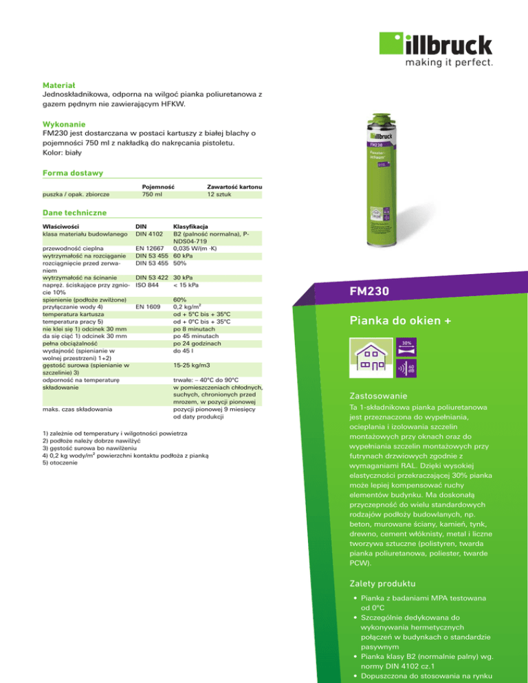 Materiał Jednoskładnikowa, odporna na wilgoć pianka poliuretanowa z gazem pędnym nie zawierającym HFKW. Wykonanie FM230 jest dostarczana w postaci kartuszy z białej blachy o pojemności 750 ml z nakładką do nakręcania pistoletu. Kolor: biały Forma dostawy puszka / opak. zbiorcze Pojemność 750 ml Zawartość kartonu 12 sztuk Dane techniczne Właściwości klasa materiału budowlanego DIN DIN 4102 Klasyfikacja B2 (palność normalna), PNDS04-719 EN 12667 0,035 W/(m ·K) DIN 53 455 60 kPa DIN 53 455 50% przewodność cieplna wytrzymałość na rozciąganie rozciągnięcie przed zerwaniem wytrzymałość na ścinanie DIN 53 422 napręż. ściskające przy zgnio- ISO 844 cie 10% spienienie (podłoże zwilżone) przyłączanie wody 4) EN 1609 temperatura kartusza temperatura pracy 5) nie klei się 1) odcinek 30 mm da się ciąć 1) odcinek 30 mm pełna obciążalność wydajność (spienianie w wolnej przestrzeni) 1+2) gęstość surowa (spienianie w szczelinie) 3) odporność na temperaturę składowanie maks. czas składowania 30 kPa < 15 kPa 60% 0,2 kg/m² od + 5°C bis + 35°C od + 0°C bis + 35°C po 8 minutach po 45 minutach po 24 godzinach do 45 l FM230 Pianka do okien + 15-25 kg/m3 trwałe: – 40°C do 90°C w pomieszczeniach chłodnych, suchych, chronionych przed mrozem, w pozycji pionowej pozycji pionowej 9 miesięcy od daty produkcji 1) zależnie od temperatury i wilgotności powietrza 2) podłoże należy dobrze nawilżyć 3) gęstość surowa bo nawilżeniu 4) 0,2 kg wody/m² powierzchni kontaktu podłoża z pianką 5) otoczenie Zastosowanie Ta 1-składnikowa pianka poliuretanowa jest przeznaczona do wypełniania, ocieplania i izolowania szczelin montażowych przy oknach oraz do wypełniania szczelin montażowych przy futrynach drzwiowych zgodnie z wymaganiami RAL. Dzięki wysokiej elastyczności przekraczającej 30% pianka może lepiej kompensować ruchy elementów budynku. Ma doskonałą przyczepność do wielu standardowych rodzajów podłoży budowlanych, np. beton, murowane ściany, kamień, tynk, drewno, cement włóknisty, metal i liczne tworzywa sztuczne (polistyren, twarda pianka poliuretanowa, poliester, twarde PCW). Zalety produktu • Pianka z badaniami MPA testowana od 0°C • Szczególnie dedykowana do wykonywania hermetycznych połączeń w budynkach o standardzie pasywnym • Pianka klasy B2 (normalnie palny) wg. normy DIN 4102 cz.1 • Dopuszczona do stosowania na rynku FM230 Pianka do okien + Przygotowanie • Podłoża muszą być czyste i nośne. Należy usunąć luźne cząstki, kurz i tłuszcz. • Powierzchnie stykające się z pianką przed wypełnieniem zwilżyć. • Powierzchnie przyległe oraz pokrycia ścian i podłóg w rejonie prac należy zabezpieczyć. Użycie • Przed użyciem kartusz należy co najmniej 20 razy silnie wstrząsnąć. • Nakręcić na kartusz pistolet. • Kartusz cały czas należy trzymać zaworem do dołu. Ilość wypływającej piany dozuje się dźwignią spustową i śrubą regulacyjną pistoletu. • Pianę należy dozować oszczędnie i układać w pasma. Szczególnie w przypadku fug i pustych przestrzeni o szerokości powyżej 30 mm zaleca się nakładać pianę warstwami, nawilżając każdą nałożoną warstwę. Należy zwracać uwagę, aby w podłożu nie było zlodowaceń. Optymalna temperatura pracy to 20°C; w niższych temperaturach należy liczyć się z mniejszym uzyskiem piany. Przy wypełnianiu pianą przestrzeni graniczących z elementami podatnymi na odkształcenia, np. parapetami czy ramami okiennymi, należy elementy te dostatecznie wzmocnić. Ilustracja 1: Zwilżyć podłoże Ilustracja 2: Kartusz z pianką silnie wstrząsnąć Ilustracja 3: Wypełnić pianką fugę okienną Czyszczenie Ewentualne nadlewki pianki po stwardnieniu należy obciąć. Plamy/bryzgi z pianki należy natychmiast usunąć środkiem do czyszczenia pistoletów AA290 lub acetonem. Stwardniałą piankę da się usunąć tylko mechanicznie. Pistolet po użyciu należy dokładnie wyczyścić preparatem AA290 i potraktować sprayem pielęgnacyjnym AA291. Certyfikaty Pewne stosowanie już od 0 °C dzięki jakości zbadanej przez MPA (raport z badań nr 082492.1-Sz z 25.07.2008). Osiągalna ważona miara tłumienia akustycznego to 60 dB (raport /świadectwo z badania w ift (instytut techniki okiennej) nr 16735156). Chronić oczy, nosić rękawice ochronne i odzież roboczą. Nie poddawać pianki przez dłuższy czas wpływom atmosferycznym, gdyż nie jest ona odporna na promieniowanie ultrafioletowe. Zawory kartuszy z pianką firmy illbruck są dokładnie dostosowane do oferowanych przez nas pistoletów. Stosowanie tych pistoletów zapewnia optymalne otwarcie zaworu, a tym samym uzyskanie żądanej prędkości wypływu pianki i całkowite opróżnienie kartusza. Wskazówki bezpieczeństwa Najnowszą wersję karty charakterystyki znajdą Państwo na stronie www.tremco-illbruck.com Wskazówki Serwis techniczny Na życzenie klienta firma tremco illbruck udostępnia w każdej chwili fachową pomoc techniczną. Dodatkowe informacje Powyższe informacje mogą być tylko ogólnymi wskazówkami. Ze względu na to, że nie mamy wpływu na warunki obróbki i zastosowania, jak również z powodu różnorodności stosowanych materiałów, należy przeprowadzić odpowiednie próby we własnym zakresie, aby sprawdzić materiał pod kątem dopasowania produktu do konkretnego zastosowania. Zastrzega się możiwość zmian technicznych. Najnowszą wersję znajdziecie Państwo na stronie www.tremcoillbruck.com tremco illbruck Sp. z o.o. Kuźnicy Kołłątajowskiej 13 31-234 Kraków Polska T:+48 12 665 33 08 F:+48 12 665 33 09 [email protected] www.tremco-illbruck.com 123302 | 2014-05 Produkt stosować tylko w pomieszczeniach o powierzchni powyżej 5 m² (wysokość 2,5 m) z dobrą wentylacją. Nie palić!