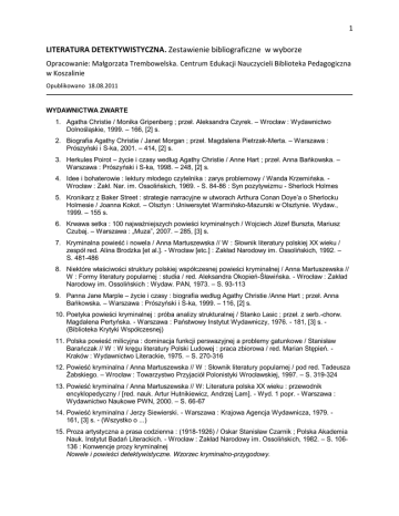 1 LITERATURA DETEKTYWISTYCZNA. Zestawienie bibliograficzne w wyborze Opracowanie: Małgorzata Trembowelska. Centrum Edukacji Nauczycieli Biblioteka Pedagogiczna w Koszalinie Opublikowano 18.08.2011 WYDAWNICTWA ZWARTE 1. Agatha Christie / Monika Gripenberg ; przeł. Aleksandra Czyrek. – Wrocław : Wydawnictwo Dolnośląskie, 1999. – 166, [2] s. 2. Biografia Agathy Christie / Janet Morgan ; przeł. Magdalena Pietrzak-Merta. – Warszawa : Prószyński i S-ka, 2001. – 414, [2] s. 3. Herkules Poirot – życie i czasy według Agathy Christie / Anne Hart ; przeł. Anna Bańkowska. – Warszawa : Prószyński i S-ka, 1998. – 248, [2] s. 4. Idee i bohaterowie : lektury młodego czytelnika : zarys problemowy / Wanda Krzemińska. Wrocław : Zakł. Nar. im. Ossolińskich, 1969. - S. 84-86 : Syn pozytywizmu - Sherlock Holmes 5. Kronikarz z Baker Street : strategie narracyjne w utworach Arthura Conan Doye’a o Sherlocku Holmesie / Joanna Kokot. – Olsztyn : Uniwersytet Warmińsko-Mazurski w Olsztynie. Wydaw., 1999. – 155 s. 6. Krwawa setka : 100 najważniejszych powieści kryminalnych / Wojciech Józef Burszta, Mariusz Czubaj. – Warszawa : „Muza”, 2007. – 285, [3] s. 7. Kryminalna powieść i nowela / Anna Martuszewska // W : Słownik literatury polskiej XX wieku / zespół red. Alina Brodzka [et al.]. - Wrocław [etc.] : Zakład Narodowy im. Ossolińskich, 1992. – S. 481-486 8. Niektóre właściwości struktury polskiej współczesnej powieści kryminalnej / Anna Martuszewska // W : Formy literatury popularnej : studia / red. Aleksandra Okopień-Śławińska. - Wrocław : Zakład Narodowy im. Ossolińskich : Wydaw. PAN, 1973. – S. 93-113 9. Panna Jane Marple – życie i czasy : biografia według Agathy Christie /Anne Hart ; przeł. Anna Bańkowska. – Warszawa : Prószyński i S-ka, 1999. – 116, [2] s. 10. Poetyka powieści kryminalnej : próba analizy strukturalnej / Stanko Lasic ; przeł. z serb.-chorw. Magdalena Pertyńska. - Warszawa : Państwowy Instytut Wydawniczy, 1976. - 181, [3] s. (Biblioteka Krytyki Współczesnej) 11. Polska powieść milicyjna : dominacja funkcji perswazyjnej a problemy gatunkowe / Stanisław Barańczak // W : W kręgu literatury Polski Ludowej : praca zbiorowa / red. Marian Stępień. Kraków : Wydawnictwo Literackie, 1975. – S. 270-316 12. Powieść kryminalna / Anna Martuszewska // W : Słownik literatury popularnej / pod red. Tadeusza Żabskiego. – Wrocław : Towarzystwo Przyjaciół Polonistyki Wrocławskiej, 1997. – S. 319-324 13. Powieść kryminalna / Anna Martuszewska // W: Literatura polska XX wieku : przewodnik encyklopedyczny / [red. nauk. Artur Hutnikiewicz, Andrzej Lam]. - Wyd. 1 popr. - Warszawa : Wydawnictwo Naukowe PWN, 2000. – S. 66-67 14. Powieść kryminalna / Jerzy Siewierski. - Warszawa : Krajowa Agencja Wydawnicza, 1979. 161, [3] s. - (Wszystko o ...) 15. Proza artystyczna a prasa codzienna : (1918-1926) / Oskar Stanisław Czarnik ; Polska Akademia Nauk. Instytut Badań Literackich. - Wrocław : Zakład Narodowy im. Ossolińskich, 1982. – S. 106136 : Konwencje prozy kryminalnej Nowele i powieści detektywistyczne. Wzorzec kryminalno-przygodowy. 2 16. Raymond Chandler : biografia / Tom Hiney ; przeł. Zbigniew Gieniewski. – Warszawa : Prószyński i S-ka, 2000. – 374, [2] s. 17. Słownik postaci literackich / Andrzej Z. Makowiecki. - Warszawa : Państwowy Instytut Wydawniczy, 2000. – S. 313-314 : Holmes Sherlock 18. Słownik postaci literackich / Andrzej Z. Makowiecki. - Warszawa : Państwowy Instytut Wydawniczy, 2000. – S. 607 : Poirot Hercule ARTYKUŁY Z CZASOPISM 1. Agata / Jacek Klinowski // Życie Literackie. - 1980, nr 5, s. 16 Życie i twórczość Agaty Christie. 2. Bronię kryminału! : renesans powieści detektywistycznych / Wojciech Józef Burszta // Polityka. – 2005, nr 11, dod. „Niezbędnik Inteligenta”, s. 34-38 3. Chandler perfekcjonista / Maciej Parowski // Przegląd Techniczny. – 1982, nr 9, s. 44 4. "Chciałbym się napić piwa z takim człowiekiem jak Eberhard Mock" / Marek Krajewski ; rozm. przepr. Sławomir Kufel. // Pro Libris. - 2007, nr 2, s. 6-8 5. Conan Doyle – oszukany spirytysta? / Agnieszka Kawula // Nowa Fantastyka. – 2005, nr 3, s. 7-8 6. Czekając na zbrodnię / Krzysztof Varga // Polityka. – 1996, nr 26, s. 45-46 Polska powieść kryminalna. 7. Czy Eberhard Mock był nazistą / Krzysztof Masłoń // Rzeczpospolita. – 2007, nr 293, s. A26 Detektyw z powieści Marka Krajewskiego. 8. Czytają „Festung Breslau” / Andrzej Zawada // Przegląd Polityczny. – 2006, nr 79/80, s. 88-94 9. Detektyw w tunice / Mariusz Czubaj // Polityka. - 2004, nr 31, s. 58-59 10. Dotyk Ręki Tajemnic / Mariusz Czubaj // Polityka. – 2010, nr 3, s. 54-56 O powieści Dana Browna „Zaginiony symbol”. 11. Ewangelia Dana Browna / Tomasz P. Terlikowski // Newsweek Polska. – 2006, nr 19, s. 84-92 12. Fryderyka Durrenmatta requiem dla opowieści kryminalnej / Włodzimierz Bialik // Nurt. – 1972, nr 7, s. 34-37 13. Holmes XXI wieku / Dorota Maj // Wprost. - 2010, nr 4, s. 84-87 14. Jak to w kryminale! : (słów kilka o powieściach detektywistycznych Agaty Christie) / Anna Kondracka-Zielińska // Język Polski w Liceum. – 2005/2006, nr 1, s. 25-42 15. Jak to w kryminale! : kilka słów o powieściach detektywistycznych Agaty Christie / Anna Kondracka-Zielińska. // Kultura Popularna. - 2006, nr 1, s. 23-33 16. Jak to w kryminale! : słów kilka o powieściach detektywistycznych Agaty Christie / Anna Kondracka-Zielińska. // Albo albo. - 2005, z. 4, s. 95-112 17. Jak zabija starsza pani / Krystyna Held-Olsińska // Polityka. – 1997, nr 41, s. 54-55 O powieściach kryminalnych Agaty Christie. 18. Już żadnych sentymentów : o powieściach Raymonda Chandlera / Jerzy Borowczyk. - Bibliogr. // Czas Kultury. - R. 24, nr 3 (2008), s. 51-63 19. Kilka uwag na temat Chestertona // Kultura. – 1990, nr 6, s. 11-12 O twórczości G. K. Chestertona twórcy Browna księdza detektywa.