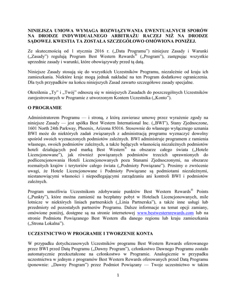 NINIEJSZA UMOWA WYMAGA ROZWIĄZYWANIA EWENTUALNYCH SPORÓW NA DRODZE INDYWIDUALNEGO ARBITRAŻU RACZEJ NIŻ NA DRODZE SĄDOWEJ. KWESTIA TA ZOSTAŁA SZCZEGÓŁOWO OMÓWIONA PONIŻEJ. Ze skutecznością od 1 stycznia 2016 r. („Data Programu”) niniejsze Zasady i Warunki („Zasady”) regulują Program Best Western Rewards® („Program”), zastępując wszystkie uprzednie zasady i warunki, które obowiązywały przed tą datą. Niniejsze Zasady stosują się do wszystkich Uczestników Programu, niezależnie od kraju ich zamieszkania. Niektóre kraje mogą jednak nakładać na ten Program dodatkowe ograniczenia. Dla tych przypadków na końcu niniejszych Zasad zawarto szczegółowe zasady specjalne. Określenia „Ty” i „Twój” odnoszą się w niniejszych Zasadach do poszczególnych Uczestników zarejestrowanych w Programie z utworzonym Kontem Uczestnika („Konto”). O PROGRAMIE Administratorem Programu — i stroną, z którą zawierasz umowę przez wyrażenie zgody na niniejsze Zasady — jest spółka Best Western International Inc. („BWI”), Stany Zjednoczone, 1601 North 24th Parkway, Phoenix, Arizona 85016. Stosownie do własnego wyłącznego uznania BWI może do niektórych zadań związanych z administracją programu wyznaczyć dowolny spośród swoich wyznaczonych podmiotów zależnych. BWI administruje programem z ramienia własnego, swoich podmiotów zależnych, a także będących własnością niezależnych podmiotów hoteli działających pod marką Best Western® na obszarze całego świata („Hotele Licencjonowane”), jak również powiązanych podmiotów trzecich uprawnionych do podlicencjonowania Hoteli Licencjonowanych poza Stanami Zjednoczonymi, na obszarze rozmaitych krajów i terytoriów całego świata („Podmioty Powiązane”). Prosimy o zwrócenie uwagi, że Hotele Licencjonowane i Podmioty Powiązane są podmiotami niezależnymi, niestanowiącymi własności i niepodlegającymi zarządzaniu ani kontroli BWI i podmiotów zależnych. Program umożliwia Uczestnikom zdobywanie punktów Best Western Rewards® Points („Punkty”), które można zamienić na bezpłatny pobyt w Hotelach Licencjonowanych, mile lotnicze w niektórych liniach partnerskich („Linia Partnerska”), a także inne usługi lub przedmioty od pozostałych partnerów Programu. Dalsze informacje na temat opcji zamiany, omówione poniżej, dostępne są na stronie internetowej www.bestwesternrewards.com lub na stronie Podmiotu Powiązanego Best Western dla danego regionu lub kraju zamieszkania („Strona Lokalna”). UCZESTNICTWO W PROGRAMIE I TWORZENIE KONTA W przypadku dotychczasowych Uczestników programu Best Western Rewards oferowanego przez BWI przed Datą Programu („Dawny Program”), członkostwo Dawnego Programu zostało automatycznie przekształcone na członkostwo w Programie. Analogicznie w przypadku uczestnictwa w jednym z programów Best Western Rewards oferowanych przed Datą Programu (ponownie: „Dawny Program”) przez Podmiot Powiązany — Twoje uczestnictwo w takim 1 Dawnym Programie zostało automatycznie przekształcone na członkostwo w Programie, o ile nie zabraniały tego stosowne przepisy prawa. Zasady Programu stanowią ulepszoną wersję zasad Dawnych Programów i, ogólnie rzecz biorąc, przewidują dla Uczestników dogodniejsze warunki i więcej korzyści. Osoby, które nie są jeszcze Uczestnikami Programu, mogą zarejestrować się przez Internet pod adresem: www.bestwestern.com lub za pośrednictwem Strony Lokalnej, poczty, telefonicznie pod numerem infolinii Best Western, za pomocą aplikacji mobilnej lub w recepcji Hotelu Licencjonowanego. Aby móc zostać Uczestnikiem Programu, musisz być osobą pełnoletnią w kraju zamieszkania. Aby stworzyć Konto Uczestnika rejestrujące Twoje Punkty i aktywność Konta, musisz podać kompletne, prawidłowe dane, w tym aktualny adres poczty elektronicznej, numer telefonu i adres pocztowy („Dane Konta”). Nie wolno posługiwać się Kontem innej osoby bez jej pozwolenia. WYRAŻENIE ZGODY NA NINIEJSZE ZASADY ORAZ ZASADY PRYWATNOŚCI BWI FAKT UCZESTNICZENIA W PROGRAMIE STANOWI TWOJĄ ZGODĘ NA NINIEJSZE ZASADY I WYRAŻA ICH AKCEPTACJĘ. STAJĄC SIĘ UCZESTNIKIEM LUB POZOSTAJĄC W PROGRAMIE, PRZEKAZUJESZ TWOJE DANE OSOBOWE SPÓŁCE BWI, KTÓRA DO PRZETWORZENIA TWOJEJ REJESTRACJI I UTRZYMANIA TWOJEGO KONTA WYKORZYSTUJE SYSTEMY ZLOKALIZOWANE W STANACH ZJEDNOCZONYCH. JEŻELI JESTEŚ REZYDENTEM OBSZARU NALEŻĄCEGO DO UNII EUROPEJSKIEJ, AZJI LUB DOWOLNEGO INNEGO REGIONU, PRZEZ STANIE SIĘ UCZESTNIKIEM PROGRAMU LUB NIM POZOSTANIE UDZIELASZ WYRAŹNEJ ZGODY NA PRZEKAZANIE TWOICH DANYCH OSOBOWYCH DO STANÓW ZJEDNOCZONYCH. JEŻELI REPREZENTUJESZ PODMIOT ZBIOROWY, ODPOWIADASZ ZA UPEWNIENIE SIĘ, ŻE KAŻDA OSOBA UCZESTNICZĄCA W PROGRAMIE JAKO PRACOWNIK TEGO PODMIOTU LUB WYKONAWCA, KTÓREJ DANE MOGĄ ZOSTAĆ PRZEKAZANE BWI, UDZIELIŁA WYRAŹNEJ ZGODY NA PRZEKAZANIE W TEN SPOSÓB JEJ DANYCH DO STANÓW ZJEDNOCZONYCH I TAM ICH PRZETWARZANIE. PRZEPISY PRAWA REGULUJĄCE PRZETWARZANIE DANYCH OSOBOWYCH W STANACH ZJEDNOCZONYCH MOGĄ BYĆ MNIEJ SUROWE NIŻ PRZEPISY OBOWIĄZUJĄCE W TWOIM KRAJU. PROSIMY O PRZECZYTANIE NASZYCH ZASAD PRYWATNOŚCI WIĘCEJ INFORMACJI O POSTĘPOWANIU BWI W SPRAWACH DOTYCZĄCYCH PRYWATNOŚCI, W TYM PRZEKAZYWANIA DANYCH ZA GRANICĘ ORAZ UCZESTNICTWA BWI W AMERYKAŃSKO-UNIJNYM I AMERYKAŃSKO-SZWAJCARSKIM PROGRAMIE OCHRONY DANYCH SAFE HARBOR, Z KTÓRYCH OBYDWA ZOSTAŁY UDOSTĘPNIONE PRZEZ FEDERALNY DEPARTAMENT HANDLU, PATRZ HTTP://WWW.EXPORT.GOV/SAFEHARBOR. NASZ CERTYFIKAT ZGODNOŚCI Z PROGRAMAMI SAFE HARBOR MOŻNA TAKŻE SPRAWDZIĆ POD ADRESEM: HTTP://WWW.EXPORT.GOV/SAFEHARBOR). STAJĄC SIĘ LUB POZOSTAJĄC 2 UCZESTNIKIEM PROGRAMU OŚWIADCZASZ BWI, ŻE ZNASZ I ROZUMIESZ NASZE ZASADY PRYWATNOŚCI. BWI ODPOWIADA WYŁĄCZNIE ZA UDOSTĘPNIANIE NINIEJSZEGO PROGRAMU UCZESTNIKOM. MOŻESZ TAKŻE W RÓŻNYCH CELACH PRZEKAZYWAĆ SWOJE DANE OSOBOWE PODMIOTOM POWIĄZANYM. WSZELKIE DANE OSOBOWE PRZEKAZANE PODMIOT