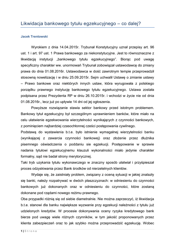 Likwidacja bankowego tytułu egzekucyjnego – co dalej? Jacek Trentowski Wyrokiem z dnia 14.04.2015r. Trybunał Konstytucyjny uznał przepisy art. 96 ust. 1 i art. 97 ust. 1 Prawa bankowego za niekonstytucyjne. Jest to równoznaczne z likwidacją instytucji „bankowego tytułu egzekucyjnego”. Biorąc pod uwagę specyficzny charakter ww. unormowań Trybunał zobowiązał ustawodawcę do zmiany prawa do dnia 01.08.2016r. Ustawodawca w dość zawrotnym tempie przeprowadził stosowną nowelizację i w dniu 25.09.2015r. Sejm uchwalił Ustawę o zmianie ustawy – Prawo bankowe oraz niektórych innych ustaw, która wyrugowała z polskiego porządku prawnego instytucję bankowego tytułu egzekucyjnego. Ustawa została podpisana przez Prezydenta RP w dniu 26.10.2015r. i wchodzi w życie nie od dnia 01.08.2016r., lecz już po upływie 14 dni od jej ogłoszenia. Powyższe rozwiązanie stawia sektor bankowy przed istotnym problemem. Bankowy tytuł egzekucyjny był szczególnym uprawnieniem banków, które miało na celu ułatwienie egzekwowania wierzytelności wynikających z czynności bankowych, z pominięciem najbardziej czasochłonnej cześci postępowania cywilnego. Podstawą do wystawienia b.t.e. było istnienie wymagalnej wierzytelności banku (wynikającej z zawarcia czynności bankowej) oraz złożenie przez dłużnika pisemnego oświadczenia o poddaniu sie egzekucji. Postępowanie w sprawie nadania tytułowi egzekucyjnemu klauzuli wykonalności miało jedynie charakter formalny, sąd nie badał strony merytorycznej. Taki tryb uzykania tytułu wykonawczego w znaczny sposób ułatwiał i przyśpieszał proces odzyskiwania przez Bank środków od nierzetelnych klientów. Wydaje się, że zaistniały problem, związany z oceną sytuacji w jakiej znalazły się banki, należy rozpatrywać w dwóch płaszczyznach: w odniesieniu do czynności bankowych już dokonanych oraz w odniesieniu do czynności, które zostaną dokonane pod rządami nowego reżimu prawnego. Oba przypadki różnią się od siebie diametralnie. Nie można zaprzeczyć, iż likwidacja b.t.e. stanowi dla banku największe wyzwanie przy egzekucji należności z tytułu już udzielonych kredytów. W procesie dokonywania oceny ryzyka kredytowego bank bierze pod uwagę wiele różnych czynników, w tym jakość proponowanych przez klienta zabezpieczeń oraz to jak szybko można przeprowadzić egzekucję. Wobec 1|Strona powyższego, usunięcie z systemu prawnego instytucji w znaczny sposób przyśpieszającej proces egzekucji należności stawia cały sektor bankowy w bardzo kłopotliwej sytuacji. Pozycja banku, jako wierzyciela uległa znacznemu osłabieniu. Mając na uwadze powyższe należy zadać sobie pytanie jakimi instrumentami dysponuje w takiej sytuacji bank? Jako pierwszy instrument należy wskazać ten, który jest najbardziej oczywisty, tj. dochodzenie przez insytucję kredytową wierzytelności w drodze przeprowadzenia pełnego przewodu sądowego. Takie rozwiązanie jest niestety złem koniecznym, wybawieniem od którego był bankowy tytuł egzekucyjny. Sprawy sądowe w Polsce potrafią ciągnąć się latami. W tym czasie w istotny sposób maleje szansa wierzyciela na wyegzekwowanie należności. Jest to spowodowane przede wszystkimi wydłużeniem okresu w którym dłużnik jest w stanie wyzbyć się majątku i tym samym uniemożliwić pomyślne zakończenie postępowania. Drugim instrumentem, który jest już wykorzystywany w praktyce i którego znaczenie może wzrosnąć jest sprzedaż wierzytelności. W szczególności może mieć to znaczenie w odniesieniu do niskokwotowych ekspozycji detalicznych. O możliwości zwiększenia się wolumentów spraw przeznaczonych do sprzedaży, po ogłoszeniu wyroku Trybunału Konstytucyjnego, wypowiadali się w mediach przedstawiciele branży windykacyjnej. Ostatnim instrumentem, ale być może najważniejszym, jest restrukturyzacja zadłużenia. Bank, w przypadku stwierdzenia opóźnień w spłacie zobowiązania powinien w pierwszej kolejności, szczególnie w przypadku, gdy następuje to na wniosek klienta, rozpatrzyć możliwość zmiany warunków umowy w sposób, który ułatwi mu terminowe wywiązywanie sie z jej warunków. Nie jest to oczywiście narzędzie, które można zastosować wobec wszystkich klientów, u których występują zaległości w spłacie. Każda sprawa wymaga indywidualnego podejścia. Stosowne regulacje dotyczące możliwości wnioskowania przez kredytobiorcę o przeprowadzenie restrukturyzacji zadłużenia zostały wprowadzone do Prawa bankowego na mocy nowelizacji z dnia 25.09.2015r., obligując banki do podjęcia negocjacji z klientami mającym problemy z bieżącą obsługą posiadanych zobowiązań. Można sobie również wyobrazić sytuację, w której kredytodawcy zaczną masowo zwracać się do klientów z żądaniem ustanowienia dodatkowych zabezpieczeń, jednakże taki scenariusz wydaje się być niemożliwy do przeprowadzenia. Spotkałoby 2|Strona się to ze znacznym oporem ze strony kredytobiorców i doprowadziłoby do wystapienia istotnego uszczerbku na i tak już nie najlepszym wizerunku całej branży. W dalszej części niniejszych rozważań należy się zastanowić, jakie działania mogą podjąć banki celem odpowiedniego zabezpieczenia przyszłych wierzytelności, czy też raczej zwiększenia szans na zwrot kredytów przez klientów? Po dokonaniu przez Sejm nowelizacji ustawy Prawo bankowe, w terminie dużo szybszym niż okres odroczenia niekonstytucyjności, można mówić o pewnym zaskoczeniu sektora bankowego tak szybkim usunięciem b.t.e. z systemu prawnego. W związku z powyższym można domniemywać, że nie wszystkie (albo żaden) banki zdążyły przygotować kompleksowe rozwiązania mające zaradzić tak drastycznej zmianie. Omówienie dostępnych możliwości należy rozpocząć od kwestii podstawowej, która została również poruszona w uzasadnieniu do wyroku Trybunału Konstytucyjnego. Mowa jest o zaostrzeniu przez b