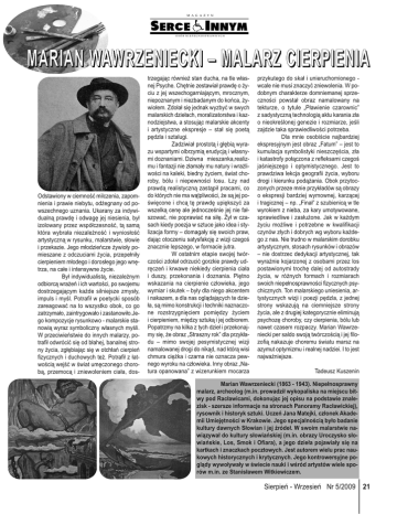 M A R I A N WAW R Z E N I E C K I – M A L A R Z C I E R P I E N I A Odstawiony w ciemność milczenia, zapomnienia i prawie niebytu, odżegnany od powszechnego uznania. Ukarany za indywidualną prawdę i odwagę jej niesienia, był izolowany przez współczesność, tą samą która wybrała niezależność i wyniosłość artystyczną w rysunku, malarstwie, słowie i przekazie. Jego młodzieńcze żywioły pomieszane z odczuciami życia, przepełniły cierpieniem młodego i dorosłego jego wnętrza, na całe i intensywne życie. Był indywidualistą, niezależnym odbiorcą wrażeń i ich wartości, po swojemu dostrzegającym każde silniejsze zmysły, impuls i myśl. Potrafił w poetycki sposób zareagować na to wszystko obok, co go zatrzymało, zaintrygowało i zastanowiło.Jego kompozycje rysunkowo - malarskie stanowią wyraz symboliczny własnych myśli. W przeciwieństwie do innych malarzy, potrafił odwrócić się od błahej, banalnej strony życia, zgłębiając się w otchłań cierpień fizycznych i duchowych też. Potrafił z łatwością wejść w świat umęczonego chorobą, przemocą i zniewoleniem ciała, dos- trzegając również stan ducha, na tle własnej Psyche. Chętnie zestawiał prawdę o życiu z jej wszechogarniającym, mrocznym, niepoznanym i niezbadanym do końca, żywiołem. Zdołał się jednak wyzbyć w swych malarskich dziełach, moralizatorstwa i kaznodziejstwa, a stosując malarskie akcenty i artystyczne ekspresje – stał się poetą pędzla i sztalugi. Zadziwiał prostotą i głębią wyrazu wspartymi olbrzymią erudycją i własnymi doznaniami. Dziwna mieszanka,realizmu i fantazji nie złamały mu natury i wrażliwości na kaleki, biedny życiem, świat choroby, bólu i niepewności losu. Łzy nad prawdą realistyczną zastąpił pracami, co do których nie ma wątpliwości, że są jej poświęcone i chcą tę prawdę upiększyć za wszelką cenę ale jednocześnie jej nie fałszować, nie poprawiać na siłę. Żył w czasach kiedy poezja w sztuce jako idea i stylizacja formy – domagały się swoich praw, dając otoczeniu satysfakcję z wizji czegoś znacznie lepszego, w formacie jutra. W ostatnim etapie swojej twórczości zdołał odrzucić gorzkie prawdy udręczeń i krwawe niekiedy cierpienia ciała i duszy, przekonania i doznania. Piętno wskazania na cierpienie człowieka, jego wymiar i skutek – były dla niego akcentem i nakazem, a dla nas oglądających te dzieła, są mimo konstrukcji i techniki naznaczone rozstrzygnięciem pomiędzy życiem i cierpieniem, między sztuką i jej odbiorem. Popatrzmy na kilka z tych dzieł i przekonajmy się, że obraz „Straszny rok” dla przykładu – mimo swojej pesymistycznej wizji namalowanej drogi do nikąd, nad którą wisi chmura ciężka i czarna nie oznacza pewnego wyroku na człowieka. Inny obraz „Natura opanowana” z wizerunkiem mocarza przykutego do skał i unieruchomionego wcale nie musi znaczyć zniewolenia. W podobnym charakterze domniemanej sprzeczności powstał obraz namalowany na tekturze, o tytule „Pławienie czarownic” z sadystyczną technologią aktu karania zła o nieokreślonej genezie i rozmiarze, jeśli zajdzie taka sprawiedliwości potrzeba. Dla mnie osobiście najbardziej ekspresyjnym jest obraz „Fatum” – jest to kumulacja symbolistyki nieszczęścia, zła i katastrofy połączona z refleksami czegoś jaśniejszego i optymistycznego. Jest to prawdziwa lekcja geografii życia, wyboru drogi i kierunku podążania. Obok przytoczonych przeze mnie przykładów są obrazy o ekspresji bardziej wymownej, karzącej i tragicznej – np. „Finał” z szubienicą w tle wyrokiem z nieba, za kary umotywowane, sprawiedliwe i zasłużone. Jak w każdym życiu możliwe i potrzebne w kwalifikacji czynów złych i dobrych wg wyboru każdego z nas. Nie trudno w malarskim dorobku artystycznym, stosach rysunków i obrazów – nie dostrzec dedykacji artystycznej, tak wyraźnie kojarzonej z osobami przez los postawionymi trochę dalej od autostrady życia, w różnych formach i rozmiarach swoich niepełnosprawności fizycznych psychicznych. Ton malarskiego uniesienia, artystycznych wizji i poezji pędzla, z jednej strony wskazują na ciemniejsze strony życia, ale z drugiej kategorycznie eliminują psychozę choroby, czy cierpienia, bólu lub nawet czasem rozpaczy. Marian Wawrzeniecki per saldo swoją twórczością i jej filozofią nakazuje choremu światu marsz na azymut optymizmu i realnej nadziei. I to jest najważniejsze. Tadeusz Kuszenin Marian Wawrzeniecki (1863 - 1943). Niepełnosprawny malarz, archeolog (m.in. prowadził wykopaliska na miejscu bitwy pod Racławicami, dokonując jej opisu na podstawie znalezisk - szersze informacje na stronach Panoramy Racławickiej), rysownik i historyk sztuki. Uczeń Jana Matejki, członek Akademii Umiejętności w Krakowie. Jego specjalnością było badanie kultury dawnych Słowian i jej źródeł. W swoim malarstwie nawiązywał do kultury słowiańskiej (m.in. obrazy Uroczysko słowiańskie, Los, Smok i Ofiara), a jego dzieła pojawiały się na kartkach i znaczkach pocztowych. Jest autorem wielu prac naukowych historycznych i krytycznych. Jego kontrowersyjne poglądy wywoływały w świecie nauki i wśród artystów wiele sporów m.in. ze Stanisławem Witkiewiczem. Sierpień - Wrzesień Nr 5/2009 21