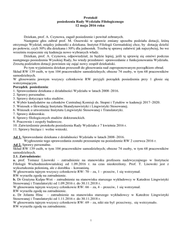 Protokół posiedzenia Rady Wydziału Filologicznego 12 maja 2016 roku Dziekan, prof. A. Ceynowa, zagaił posiedzenie i powitał zebranych. Następnie głos zabrał prof. M. Ossowski w sprawie zmiany sposobu podziału dotacji, którą otrzymuje Wydział, między jednostki a dziekana. Instytut Filologii Germańskiej chce, by dotację dzielić po połowie, czyli 50% dla dziekana i 50% dla jednostek. Trzeba tę sprawę załatwić jak najszybciej, bo we wrześniu rozpocznie się kadencja nowo wybranych władz. Dziekan, prof. A. Ceynowa, odpowiedział, że będzie lepiej, jeśli tę sprawię się omówi podczas następnego posiedzenia Wysokiej Rady, bo wtedy przedstawi sprawozdanie z funkcjonowania Wydziału. Zresztą podziałem dotacji powinien się zająć nowy zespół dziekański. Po tym wyjaśnieniu dziekan przeszedł do głosowania nad zaproponowanym porządkiem obrad. Skład RW 139 osób, w tym 104 pracowników samodzielnych; obecne 74 osoby, w tym 68 pracowników samodzielnych. W głosowaniu jawnym wszyscy członkowie RW przyjęli porządek posiedzenia przy 1 głosie się wstrzymującym. Porządek posiedzenia: 1. Sprawozdanie dziekana z działalności Wydziału w latach 2008–2016. 2. Sprawy personalne. 3. Sprawy dotyczące toku studiów. 4. Wybór kandydatów na członków Centralnej Komisji ds. Stopni i Tytułów w kadencji 2017–2020. 5. Wniosek o likwidację Instytutu Skandynawistyki i Lingwistyki Stosowanej. 6. Wniosek o utworzenie Instytutu Lingwistyki Stosowanej i Translatoryki. 7. Sprawy doktorskie. 8. Sprawy filologicznych studiów doktoranckich. 9. Pracownie i zespoły badawcze. 10. Zatwierdzenie protokołu posiedzenia Rady Wydziału z 7 kwietnia 2016 r. 11. Sprawy bieżące i wolne wnioski. Ad 1. Sprawozdanie dziekana z działalności Wydziału w latach 2008–2016. Wygłoszenie tego sprawozdania zostało przesunięte na posiedzenie RW 2 czerwca 2016 r. Ad 2. Sprawy personalne. Skład RW 139 osób, w tym 104 pracowników samodzielnych; obecne 74 osoby, w tym 68 pracowników samodzielnych. 2.1. Zatrudnienie: a. prof. Tomasz Lisowski – zatrudnienie na stanowisku profesora nadzwyczajnego w Instytucie Filologii Wschodniosłowiańskiej od 1.09.2016 r. na czas nieokreślony. Prof. T. Lisowski jest z wykształcenia polonistą, ale z dorobku – koreanistą. W głosowaniu tajnym wszyscy członkowie RW: 70 – za, 1 – przeciw, 1 się wstrzymał. RW wyraziła zgodę na zatrudnienie. b. Dr Grażyna Kulpa-Woś – zatrudnienie na stanowisku starszego wykładowcy w Katedrze Lingwistyki Stosowanej i Translatoryki od 1.09.2016 r. do 30.11.2018 r. W głosowaniu tajnym wszyscy członkowie RW: 66 – za, 4 – przeciw, 1 się wstrzymał. RW wyraziła zgodę na zatrudnienie. c. Dr Jolanta Hinc – zatrudnienie na stanowisku starszego wykładowcy w Katedrze Lingwistyki Stosowanej i Translatoryki od 1.11.2016 r. do 30.11.2018 r. W głosowaniu tajnym wszyscy członkowie RW: 69 – za, nikt nie był przeciwny, się wstrzymało. RW wyraziła zgodę na zatrudnienie. 1 d. Dr Renata Rozalowska-Żądło – zatrudnienie na stanowisku starszego wykładowcy w Katedrze Lingwistyki Stosowanej i Translatoryki od 1.09.2016 r. do 30.11.2018 r. W głosowaniu tajnym wszyscy członkowie RW: 67 – za, nikt nie był przeciwny, 5 się wstrzymało. RW wyraziła zgodę na zatrudnienie. e. Dr Justyna Haber-Biały – zatrudnienie na stanowisku starszego wykładowcy w Instytucie Skandynawistyki i Lingwistyki Stosowanej, Katedrze Skandynawistyki od 1.09.2016 r. na czas nieokreślony. W głosowaniu tajnym wszyscy członkowie RW: 65 – za, 3 – przeciw, 4 się wstrzymało. RW wyraziła zgodę na zatrudnienie. f. Mgr Małgorzata Boduch – zatrudnienie na stanowisku wykładowcy w Instytucie Skandynawistyki i Lingwistyki Stosowanej, Katedrze Skandynawistyki od 1.09.2016 r. na czas nieokreślony. W głosowaniu tajnym wszyscy członkowie RW: 63 – za, 7 – przeciw, 2 się wstrzymało. RW wyraziła zgodę na zatrudnienie. 2.2. Urlopy: a. dr Zbyszek Dymarski z Katedry Kulturoznawstwa poprosił o udzielenie urlopu naukowego w terminie od 1.10.2016 do 30.09.2017 r. W głosowaniu tajnym wszyscy członkowie RW: 66 – za, 2 – przeciw, 3 się wstrzymało. RW udzieliła urlopu. b. Dr Agnieszka Friedrich z Instytutu Filologii Polskiej poprosiła o udzielenie urlopu naukowego od 1.10.2016 do 30.09.2017 r. W głosowaniu tajnym wszyscy członkowie RW: 65 – za, 2 – przeciw, 4 się wstrzymało. RW udzieliła urlopu. c. Dr Jolanta Laskowska z Instytutu Filologii Polskiej poprosiła o udzielenie urlopu naukowego od 1.10.2016 do 30.09.2017 r. Rozpatrzenie wniosku przełożono na następne posiedzenie RW. d. Prof. UG, dr hab. Kazimierz Musiał z Katedry Skandynawistyki – prośba o udzielenie urlopu naukowego od 1.10.2016 do 31.08.2017 r. W głosowaniu tajnym wszyscy członkowie RW: 57 – za, 6 – przeciw, 8 się wstrzymało. RW udzieliła urlopu. e. Dr Anna Socka z Instytutu Filologii Germańskiej prośba o udzielenie urlopu naukowego od 1.10.2016 do 30.06.2017 r. W głosowaniu tajnym wszyscy członkowie RW: 68 – za, 1 – przeciw, 2 się wstrzymało. RW udzieliła urlopu. f. Dr Agnieszka Witczak z Katedry Filologii Klasycznej poprosiła o udzielenie urlopu naukowego od 1.10.2016 do 1.06.2017 r. W głosowaniu tajnym wszyscy członkowie RW: 71 – za, 1 – przeciw, 1 się wstrzymał. RW udzieliła urlopu. g. Prof. UG, dr hab. Kwiryna Ziemba z Instytutu Filologii Polskiej poprosiła o udzielenie urlopu naukowego od 1.10.2016 do 30.09.2017 r. W głosowaniu tajnym wszyscy członkowie RW: 71 – za, nikt nie był przeciwny, 2 się wstrzymało. RW udzieliła urlopu. Ad 3. Sprawy dotyczące toku studiów. Prowadzenie obrad przejęła dziekan, prof. I. Kępka. Skład RW 139 osób, w tym 104 pracowników samodzielnych; obecne 74 osoby, w tym 68 pracowników samodzielnych. a. Dyrekcja Instytutu Filologii Romańskiej zwraca się z uprzejmą prośbą o zmianę w planie studiów stacjonarnych drugiego stopnia na kierunku filologia 