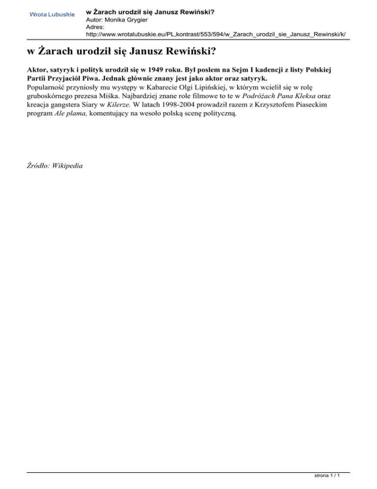 w Żarach urodził się Janusz Rewiński? Autor: Monika Grygier Adres: http://www.wrotalubuskie.eu/PL,kontrast/553/594/w_Zarach_urodzil_sie_Janusz_Rewinski/k/ w Żarach urodził się Janusz Rewiński? Aktor, satyryk i polityk urodził się w 1949 roku. Był poslem na Sejm I kadencji z listy Polskiej Partii Przyjaciół Piwa. Jednak głównie znany jest jako aktor oraz satyryk. Popularność przyniosły mu występy w Kabarecie Olgi Lipińskiej, w którym wcielił się w rolę gruboskórnego prezesa Miśka. Najbardziej znane role filmowe to te w Podróżach Pana Kleksa oraz kreacja gangstera Siary w Kilerze. W latach 1998-2004 prowadził razem z Krzysztofem Piaseckim program Ale plama, komentujący na wesoło polską scenę polityczną. Źródło: Wikipedia strona 1 / 1 Powered by TCPDF (www.tcpdf.org)