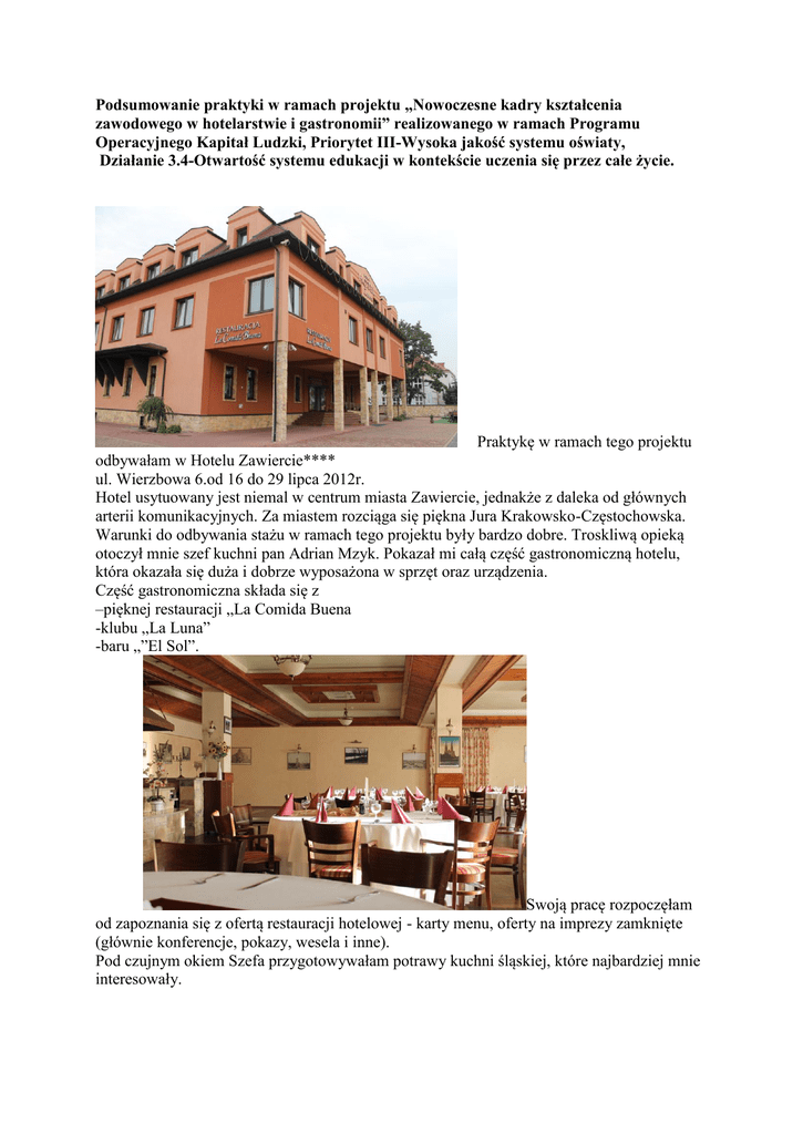 Podsumowanie praktyki w ramach projektu „Nowoczesne kadry kształcenia zawodowego w hotelarstwie i gastronomii” realizowanego w ramach Programu Operacyjnego Kapitał Ludzki, Priorytet III-Wysoka jakość systemu oświaty, Działanie 3.4-Otwartość systemu edukacji w kontekście uczenia się przez całe życie. Praktykę w ramach tego projektu odbywałam w Hotelu Zawiercie**** ul. Wierzbowa 6.od 16 do 29 lipca 2012r. Hotel usytuowany jest niemal w centrum miasta Zawiercie, jednakże z daleka od głównych arterii komunikacyjnych. Za miastem rozciąga się piękna Jura Krakowsko-Częstochowska. Warunki do odbywania stażu w ramach tego projektu były bardzo dobre. Troskliwą opieką otoczył mnie szef kuchni pan Adrian Mzyk. Pokazał mi całą część gastronomiczną hotelu, która okazała się duża i dobrze wyposażona w sprzęt oraz urządzenia. Część gastronomiczna składa się z –pięknej restauracji „La Comida Buena -klubu „La Luna” -baru „”El Sol”. Swoją pracę rozpoczęłam od zapoznania się z ofertą restauracji hotelowej - karty menu, oferty na imprezy zamknięte (głównie konferencje, pokazy, wesela i inne). Pod czujnym okiem Szefa przygotowywałam potrawy kuchni śląskiej, które najbardziej mnie interesowały. z szefem kuchni. Potrawy kuchni śląskiej są bardzo ciekawe i smaczne. Receptury przekazywane są z pokolenia na pokolenie. Wiele potraw wpisanych jest na listę produktów tradycyjnych MRiRW, m.in. „schab po sztygarsku”, „kluski śląskie białe”, „śląska parzybroda”, „żur kląski”, „ciapkapusta”, „karminadle”, „szpajza cytrynowa”. Niektóre potrawy były dla mnie nowością np. „ciapkapusta”, „porębskie prażonki”. w hotelowej kuchni. Przez kilka dni zgłębiałam tajniki wiedzy o kuchni śląskiej. Poznawałam historię potraw, nowe ich smaki. W różnych rejonach Śląska potrawy różnią się doborem składników, nazwą i techniką wykonania. Przez wieki kultura śląska mieszała się i czerpała z wpływów swoich sąsiadów- Słowian, Czech, Austrii i Niemiec. Spowodowało to powstanie oryginalnej kultury z własnymi gwarami, strojami ludowymi oraz kuchnią. Ze względu na wielonarodowościowy charakter tej krainy, tutejsza kuchnia jest niejednolita w swym charakterze. Na Górnym Śląsku spożywane są potrawy typowo śląskie (tu powstałe lub tylko tu spożywane) oraz potrawy popularne również w krajach sąsiadujących, często znane tu pod śląską nazwą: np. krepel (pączek) czy buchta (kluski na parze). Poniżej przedstawiam niektóre charakterystyczne potrawy dla regionu, w którym przebywałam. Bardzo ciekawą potrawą są „prażonki porębskie”, które przygotowuje się w specjalnym garnku żeliwnym lub aluminiowych z przykręcana pokrywą(produkowany w Porębie k/Zawiercia) i piecze się te potrawę w ognisku. układanie składników Składniki : liście białej kapusty 2-3 szt. ziemniaki obrane, buraczki czerwone , marchew, boczek wędzony, kiełbasa wędzona, cebula, czosnek, smalec, sól, pieprz, ziele angielskie. Ilość poszczególnych składników uzależniona jest od wielkości kociołka. Składniki należy pokroić – warzywa w grube plastry, boczek w grubą kostkę, kiełbasę w plastry lub półplastry. Na dno garnka najlepiej ułożyć skórę z boczku lub słoniny ( zapobiega przypaleniu potrawy), składniki układać warstwami, posypać przyprawami, na wierchu ułożyć liście kapusty, docisnąć przykrywę i dokręcić. Taką potrawę piecze się na ognisku ok. 1 godziny. Podczas pieczenia rozchodzi się niesamowity aromat potrawy. Prażonki najlepiej smakują z kefirem. Popularną potrawą na Śląsku jest „żur z tłuczonymi ziemniakami”. Składniki: żur kwaszony, wywar z kości wędzonych i grzybów suszonych, kiełbasa wędzona, boczek wędzony, sól, czosnek, pieprz, cebula, liść laurowy, ziele angielskie, majeranek, śmietana, ziemniaki. (w tej wersji nie podaje się jajek na twardo i chrzanu). Sporządzić wywar z kości wędzonych i suszonych grzybów. Do przecedzonego wywaru dodać żur, przesmażoną cebulę z boczkiem i kiełbasą, przyprawy, doprawić do smaku, dodać śmietanę. Ziemniaki ugotować, sporządzić puree. Porcję ziemniaków ułożyć w talerzu głębokim, okrasić wędzonką, obok ziemniaków wlać żurek. Smakuje wyśmienicie. Z potraw mięsnych moim zdaniem najbardziej zasługują na uwagę „schab po sztygarsku”, oraz „rolady śląskie”. Składniki: Schab ok. 1 kg, kiełbasa wędzona długością równa ze schabem, marynata_ sól, pieprz, kminek, olej, liść laurowy, ziele angielskie, nadziany kiełbasa schab natrzeć przyprawami i olejem, marynować ok.2-3 godzin, obsmażyć, podlać wodą, dodać zrumieniona cebulę i dusić w piecu ok. godziny. Gotowy schab wyjąć z sosu, sos przetrzeć przez sito, ewentualnie zagęścić zawiesina z mąki i wody. „Rolady śląskie” W innych regionach Polski nazywane są „zrazy wołowe nadziewane”. Składniki: Wołowina zrazowa, boczek wędzony, kiełbasa śląska, cebula, musztarda, ogórek kiszony, pieprz, mąka pszenna, smalec. Z wołowiny wykroić plastry grubości ok.2cm, rozbić cienko, posmarować musztardą, następnie ułożyć paski boczku i kiełbasy, piórka cebuli, cząstki ogórka kiszonego, posypać pieprzem i zawinąć rolady. Uformowane rolady obtoczyć w mące i smażyć na rozgrzanym smalcu, podlać wodą i dusić do miękkości. Na patelni obrumienić cebulę i dodać do duszenia rolad. Sos przetrzeć przez sito, najlepiej smakują z kluskami śląskimi. „Ciapkapusta” (panszkraut). Ziemniaki, kapusta biała, boczek wędzony, cebula, liść laurowy, ziele angielskie, pieprz, sól, boczek wędzony, mąka pszenna, koperek. Ziemniaki ugotować i sporządzić puree. Przygotować duszona kapustę, wymieszać z puree ziemniaczanym, posypać posiekanym koperkiem. Zupa „oberiba” Jest to odmiana śląskiej zupy jarzynowej z dużą ilością kalarepki.