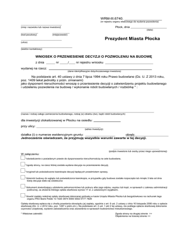 WRM-III.6740. ___________________ (nr rejestru organu właściwego do wydania pozwolenia) _______________________________ (imię i nazwisko lub nazwa inwestora) Płock, dnia (data) _____________ (kod pocztowy) _____________ (miejscowość) Prezydent Miasta Płocka _______________________________ (ulica) _______________________________________ (telefon kontaktowy) WNIOSEK O PRZENIESIENIE DECYZJI O POZWOLENIU NA BUDOWĘ z dnia nr / nr rejestru wniosku wydanej na rzecz: (dane identyfikacyjne dotychczasowego inwestora) Na podstawie art. 40 ustawy z dnia 7 lipca 1994 roku Prawo budowlane (Dz. U. Z 2013 roku, poz. 1409 tekst jednolity z późn. zmianami) jako dysponent nieruchomości wnoszę o przeniesienie decyzji o zatwierdzeniu projektu budowlanego i udzieleniu pozwolenia na budowę / wykonanie robót budowlanych / rozbiórkę * : (nazwa i rodzaj całego zamierzenia budowlanego, rodzaj (e) obiektu (ów), bądź robót budowlanych) dla inwestycji zlokalizowanej w Płocku na osiedlu: przy ulicy: (adres inwestycji) działka (i) o numerze ewidencyjnym gruntu: obręb: Jednocześnie oświadczam, że przyjmuję wszystkie warunki zawarte w tej decyzji. ................................................... (podpis inwestora lub osoby przez niego upoważnionej) W załączeniu: *oświadczenie o posiadanym prawie do dysponowania nieruchomością na cele budowlane, *zgodę strony, na rzecz której została wydana decyzja na przeniesienie decyzji, *oryginał lub poświadczone kserokopie decyzji będących przedmiotem sprawy, *dziennik budowy do wglądu lub poświadczona kserokopia, w przypadku gdy budowa została rozpoczęta lub minęło 3 lata od dnia kiedy decyzja stała się ostateczna *dokument stwierdzający udzielenie pełnomocnictwa lub prokury albo jego odpisu, wypisu lub kopii, w sprawach z zakresu administracji publicznej, za złożenie którego opłata skarbowa wynosi 17 zł, z ustawowymi wyjątkami, *dowód zapłaty należnej opłaty skarbowej dokonanej gotówką w kasie Urzędu Miasta Płocka lub bezgotówkowo na rachunek tego organu PKO Bank Polski 13 1020 3974 0000 5502 0177 7929 Opłatę skarbową wpłaca się z chwilą powstania obowiązku jej zapłaty, zgodnie z art. 6 ust. 2 ustawy z dnia 16 listopada 2006 roku o opłacie skarbowej (Dz. U. z 2012 roku, poz. 1287 z późn.zm.). Na podstawie art. 2 ust. 1 pkt 2 tej ustawy, nie podlega opłacie skarbowej dokonanie czynności urzędowej, wydanie zaświadczenia oraz zezwolenia w sprawach budownictwa mieszkaniowego. * Właściwe zakreślić Zgoda strony na drugiej stronie >> Objaśnienia na trzeciej stronie >> _______________________________ (imię i nazwisko lub nazwa dotychczasowego inwestora) Płock, dnia (data) _____________ (kod pocztowy) _____________ (miejscowość) Prezydent Miasta Płocka _______________________________ (ulica) _______________________________________ (telefon kontaktowy) ZGODA NA PRZENIESIENIE DECYZJI O POZWOLENIU NA BUDOWĘ z dnia nr / nr rejestru wniosku wydanej na rzecz: (dane identyfikacyjne dotychczasowego inwestora) Na podstawie art. 40 ustawy z dnia 7 lipca 1994 roku Prawo budowlane (Dz. U. Z 2013 roku, poz. 1409 tekst jednolity z późn. zmianami) jako adresat ww. decyzji o zatwierdzeniu projektu budowlanego i udzieleniu pozwolenia na budowę / wykonanie robót budowlanych / rozbiórkę * : (nazwa i rodzaj całego zamierzenia budowlanego, rodzaj (e) obiektu (ów), bądź robót budowlanych) dla inwestycji zlokalizowanej w Płocku na osiedlu: przy ulicy: (adres inwestycji) działka (i) o numerze ewidencyjnym gruntu: obręb: wyrażam zgodę na jej przeniesienie na rzecz ................................................................................ zam. w przy ul. ................................................... (czytelny podpis adresata decyzji) 1. OBJAŚNIENIA Prawo budowlane. Art. 28. 1. Roboty budowlane można rozpocząć jedynie na podstawie ostatecznej decyzji o pozwoleniu na budowę, z zastrzeżeniem art. 29-31. 2. Stronami w postępowaniu w sprawie pozwolenia na budowę są: inwestor oraz właściciele, użytkownicy wieczyści lub zarządcy nieruchomości znajdujących się w obszarze oddziaływania obiektu. 3. Przepisu art. 31 Kodeksu postępowania administracyjnego nie stosuje się w postępowaniu w sprawie pozwolenia na budowę. 4. Przepisów ust. 2 i 3 nie stosuje się w postępowaniu w sprawie pozwolenia na budowę wymagającym udziału społeczeństwa zgodnie z przepisami ustawy z dnia 3 października 2008 r. o udostępnianiu informacji o środowisku i jego ochronie, udziale społeczeństwa w ochronie środowiska oraz o ocenach oddziaływania na środowisko. W tym przypadku stosuje się przepisy art. 44 ustawy, o której mowa w zdaniu pierwszym. Art. 33. 1. Pozwolenie na budowę dotyczy całego zamierzenia budowlanego. W przypadku zamierzenia budowlanego obejmującego więcej niż jeden obiekt, pozwolenie na budowę może, na wniosek inwestora, dotyczyć wybranych obiektów lub zespołu obiektów, mogących samodzielnie funkcjonować zgodnie z przeznaczeniem. Jeżeli pozwolenie na budowę dotyczy wybranych obiektów lub zespołu obiektów, inwestor jest obowiązany przedstawić projekt zagospodarowania działki lub terenu, o którym mowa w art. 34 ust. 3 pkt 1, dla całego zamierzenia budowlanego. 2. Do wniosku o pozwolenie na budowę należy dołączyć: 1) cztery egzemplarze projektu budowlanego wraz z opiniami, uzgodnieniami, pozwoleniami i innymi dokumentami wymaganymi przepisami szczególnymi oraz zaświadczeniem, o którym mowa w art. 12 ust. 7, aktualnym na dzień opracowania projektu; nie dotyczy to uzgodnienia i opiniowania przeprowadzanego w ramach oceny oddziaływania przedsięwzięcia na środowisko albo oceny oddziaływania przedsięwzięcia na obszar Natura 2000; 2) oświadczenie o posiadanym prawie do dysponowania nieruchomością na cele budowlane; 3) decyzję o warunkach zabudowy i zagospodarowania terenu, jeżeli jest ona wymagana zgodnie z przepisami o planowaniu i zagospodar