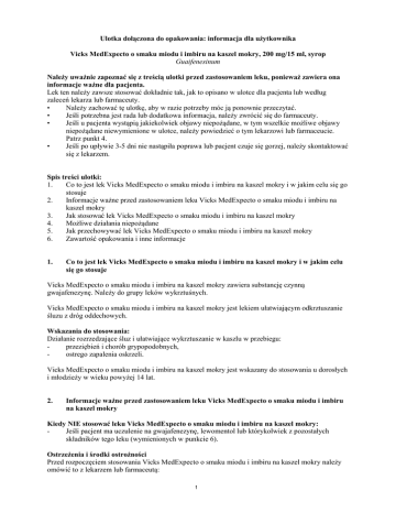 Ulotka dołączona do opakowania: informacja dla użytkownika Vicks MedExpecto o smaku miodu i imbiru na kaszel mokry, 200 mg/15 ml, syrop Guaifenesinum Należy uważnie zapoznać się z treścią ulotki przed zastosowaniem leku, ponieważ zawiera ona informacje ważne dla pacjenta. Lek ten należy zawsze stosować dokładnie tak, jak to opisano w ulotce dla pacjenta lub według zaleceń lekarza lub farmaceuty. • Należy zachować tę ulotkę, aby w razie potrzeby móc ją ponownie przeczytać. • Jeśli potrzebna jest rada lub dodatkowa informacja, należy zwrócić się do farmaceuty. • Jeśli u pacjenta wystąpią jakiekolwiek objawy niepożądane, w tym wszelkie możliwe objawy niepożądane niewymienione w ulotce, należy powiedzieć o tym lekarzowi lub farmaceucie. Patrz punkt 4. • Jeśli po upływie 3-5 dni nie nastąpiła poprawa lub pacjent czuje się gorzej, należy skontaktować się z lekarzem. Spis treści ulotki: 1. Co to jest lek Vicks MedExpecto o smaku miodu i imbiru na kaszel mokry i w jakim celu się go stosuje 2. Informacje ważne przed zastosowaniem leku Vicks MedExpecto o smaku miodu i imbiru na kaszel mokry 3. Jak stosować lek Vicks MedExpecto o smaku miodu i imbiru na kaszel mokry 4. Możliwe działania niepożądane 5. Jak przechowywać lek Vicks MedExpecto o smaku miodu i imbiru na kaszel mokry 6. Zawartość opakowania i inne informacje 1. Co to jest lek Vicks MedExpecto o smaku miodu i imbiru na kaszel mokry i w jakim celu się go stosuje Vicks MedExpecto o smaku miodu i imbiru na kaszel mokry zawiera substancję czynną gwajafenezynę. Należy do grupy leków wykrztuśnych. Vicks MedExpecto o smaku miodu i imbiru na kaszel mokry jest lekiem ułatwiającym odkrztuszanie śluzu z dróg oddechowych. Wskazania do stosowania: Działanie rozrzedzające śluz i ułatwiające wykrztuszanie w kaszlu w przebiegu: przeziębień i chorób grypopodobnych, ostrego zapalenia oskrzeli. Vicks MedExpecto o smaku miodu i imbiru na kaszel mokry jest wskazany do stosowania u dorosłych i młodzieży w wieku powyżej 14 lat. 2. Informacje ważne przed zastosowaniem leku Vicks MedExpecto o smaku miodu i imbiru na kaszel mokry Kiedy NIE stosować leku Vicks MedExpecto o smaku miodu i imbiru na kaszel mokry: Jeśli pacjent ma uczulenie na gwajafenezynę, lewomentol lub którykolwiek z pozostałych składników tego leku (wymienionych w punkcie 6). Ostrzeżenia i środki ostrożności Przed rozpoczęciem stosowania Vicks MedExpecto o smaku miodu i imbiru na kaszel mokry należy omówić to z lekarzem lub farmaceutą: 1 - w przypadku zaburzenia czynności nerek, w przypadku miastenii ciężkiej rzekomoporaźnej (łac. myasthenia gravis) - choroby układu odpornościowego, w której występuje szybkie męczenie się mięśni podczas wysiłku, w przypadku przewlekłego lub uporczywego kaszlu w przebiegu astmy oskrzelowej, przewlekłego zapalenia oskrzeli, rozedmy płuc bądź z powodu palenia tytoniu, w przypadku ciężkiej choroby żołądka i jelit, w przypadku stosowania z lekami przeciwkaszlowymi. Dzieci Nie zaleca się stosowania tego leku u dzieci poniżej 14 lat. Vicks MedExpecto o smaku miodu i imbiru na kaszel mokry a inne leki Należy powiedzieć lekarzowi lub farmaceucie o wszystkich lekach przyjmowanych przez pacjenta obecnie lub ostatnio, a także o lekach, które pacjent planuje stosować. Vicks MedExpecto o smaku miodu i imbiru na kaszel mokry może nasilać działanie: leków uspokajających, leków zwiotczających mięśnie stosowanych np. podczas znieczulenia ogólnego podczas zabiegów chirurgicznych. Vicks MedExpecto o smaku miodu i imbiru na kaszel mokry z jedzeniem i piciem Brak ograniczeń. Ciąża i karmienie piersią Jeśli pacjentka jest w ciąży lub karmi piersią, przypuszcza że może być w ciąży lub gdy planuje mieć dziecko, powinna poradzić się lekarza lub farmaceuty przed zastosowaniem tego leku. Bezpieczeństwo stosowania gwajafenezyny w ciąży i podczas karmienia piersią nie zostało całkowicie ustalone. Zastosowanie tego leku w ciąży lub podczas karmienia piersią możliwe jest jedynie na wyraźne zalecenie lekarskie. Prowadzenie pojazdów i obsługiwanie maszyn Vicks MedExpecto o smaku miodu i imbiru na kaszel mokry zawiera etanol (alkohol). Vicks MedExpecto o smaku miodu i imbiru na kaszel mokry ma niewielki wpływ na zdolność prowadzenia pojazdów i obsługiwania maszyn. Ważne informacje o niektórych składnikach leku Vicks MedExpecto o smaku miodu i imbiru na kaszel mokry Lek zawiera następujące składniki: • Sacharoza. Jeżeli stwierdzono wcześniej u pacjenta nietolerancję niektórych cukrów, pacjent powinien skontaktować się z lekarzem przed przyjęciem leku Vicks MedExpecto o smaku miodu i imbiru na kaszel mokry. Ten lek zawiera 5,55 g sacharozy (cukru) w jednej dawce, co odpowiada około 0,46 jednostkom chlebowym. Należy to uwzględnić, jeśli pacjent stosuje dietę cukrzycową. • Etanol (alkohol). Ten lek zawiera 5% (obj.) etanolu (alkohol). W przypadku dawkowania zgodnego z zaleceniami jedna dawka (15 ml) zawiera 0,63 g alkoholu, co odpowiada 15 ml piwa, 6 ml wina w jednej dawce. Szkodliwe dla osób z chorobą alkoholową. Należy wziąć to pod uwagę u kobiet w ciąży lub karmiących piersią, u dzieci i w grupach wysokiego ryzyka, jak pacjenci z chorobą wątroby lub padaczką. Może wystąpić osłabienie lub nasilenie działania innych leków. • Sód. Ten lek zawiera 1,3 mmol (30 mg) sodu w jednej dawce. Należy to uwzględnić, jeśli pacjent stosuje dietę niskosodową (ograniczona ilość soli). 3. Jak stosować lek Vicks MedExpecto o smaku miodu i imbiru na kaszel mokry Ten lek należy zawsze stosować zgodnie z zaleceniami lekarza lub farmaceuty. W razie wątpliwości należy zwrócić się do lekarza lub farmaceuty. 2 Jeśli lekarz nie zaleci inaczej, zaleca się następujące dawkowanie: Dorośli i młodzież w wieku powyżej 14 lat: zażywać 200 mg gwajafenezyny, tj. 15 ml (jedna miarka do 
