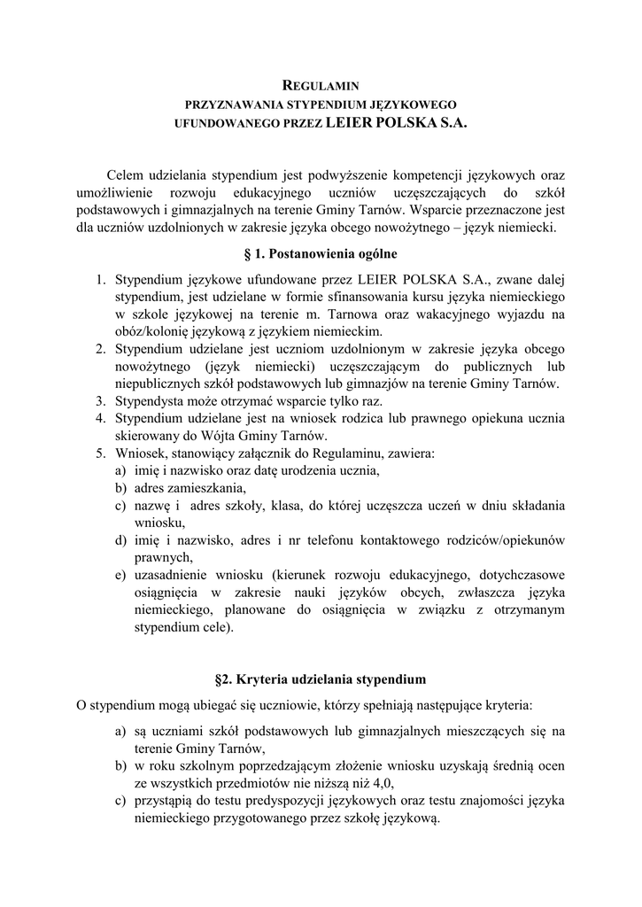 REGULAMIN PRZYZNAWANIA STYPENDIUM JĘZYKOWEGO UFUNDOWANEGO PRZEZ LEIER POLSKA S.A. Celem udzielania stypendium jest podwyższenie kompetencji językowych oraz umożliwienie rozwoju edukacyjnego uczniów uczęszczających do szkół podstawowych i gimnazjalnych na terenie Gminy Tarnów. Wsparcie przeznaczone jest dla uczniów uzdolnionych w zakresie języka obcego nowożytnego – język niemiecki. § 1. Postanowienia ogólne 1. Stypendium językowe ufundowane przez LEIER POLSKA S.A., zwane dalej stypendium, jest udzielane w formie sfinansowania kursu języka niemieckiego w szkole językowej na terenie m. Tarnowa oraz wakacyjnego wyjazdu na obóz/kolonię językową z językiem niemieckim. 2. Stypendium udzielane jest uczniom uzdolnionym w zakresie języka obcego nowożytnego (język niemiecki) uczęszczającym do publicznych lub niepublicznych szkół podstawowych lub gimnazjów na terenie Gminy Tarnów. 3. Stypendysta może otrzymać wsparcie tylko raz. 4. Stypendium udzielane jest na wniosek rodzica lub prawnego opiekuna ucznia skierowany do Wójta Gminy Tarnów. 5. Wniosek, stanowiący załącznik do Regulaminu, zawiera: a) imię i nazwisko oraz datę urodzenia ucznia, b) adres zamieszkania, c) nazwę i adres szkoły, klasa, do której uczęszcza uczeń w dniu składania wniosku, d) imię i nazwisko, adres i nr telefonu kontaktowego rodziców/opiekunów prawnych, e) uzasadnienie wniosku (kierunek rozwoju edukacyjnego, dotychczasowe osiągnięcia w zakresie nauki języków obcych, zwłaszcza języka niemieckiego, planowane do osiągnięcia w związku z otrzymanym stypendium cele). §2. Kryteria udzielania stypendium O stypendium mogą ubiegać się uczniowie, którzy spełniają następujące kryteria: a) są uczniami szkół podstawowych lub gimnazjalnych mieszczących się na terenie Gminy Tarnów, b) w roku szkolnym poprzedzającym złożenie wniosku uzyskają średnią ocen ze wszystkich przedmiotów nie niższą niż 4,0, c) przystąpią do testu predyspozycji językowych oraz testu znajomości języka niemieckiego przygotowanego przez szkołę językową. § 3 Tryb udzielania stypendium 1. Wniosek o stypendium składa się do Wójta Gminy Tarnów. 2. Do wniosku należy dołączyć zaświadczenie dyrektora o uczęszczaniu do szkoły na terenie gminy Tarnów oraz osiągniętej średniej ocen w roku szkolnym poprzedzającym dzień składania wniosku. 3. Wnioski należy składać w terminie ogłoszonym przez Wójta Gminy Tarnów na początku każdego roku szkolnego. 4. Komisja powołana przez Wójta Gminy Tarnów, w skład której wchodzi przedstawiciel LEIER POLSKA S.A., sprawdza wnioski pod względem formalnym oraz podejmuje decyzję o zakwalifikowaniu do II etapu procedury kwalifikacyjnej. 5. Wnioski niekompletne, nieuzasadnione, dotyczące osób niespełniających kryteriów określonych w niniejszym regulaminie, nie będą rozpatrywane. 6. Drugi etap realizowany będzie w szkole językowej, która opracuje i przeprowadzi testy predyspozycji językowych oraz znajomości języka niemieckiego. 7. O zakwalifikowaniu do II etapu uczeń jest powiadamiany telefonicznie oraz na piśmie. 8. Stypendia otrzymają osoby, które uzyskały najwyższy wynik na teście. 9. Wójt Gminy Tarnów w porozumieniu z LEIER POLSKA S.A. wskazuje liczbę stypendiów na dany rok szkolny. 10. W przypadku rezygnacji ucznia ze stypendium przed rozpoczęciem kursu, do otrzymania stypendium kwalifikowane są osoby z listy rezerwowej sporządzonej przez Komisję powołaną przez Wójta Gminy Tarnów. 11. Ostateczną decyzję o udzieleniu stypendium podejmuje Wójt Gminy Tarnów, w porozumieniu z przedstawicielem LEIER POLSKA S.A. 12. O przyznaniu lub odmowie przyznania stypendium wnioskodawca jest powiadamiany na piśmie. 13. Od podjętej decyzji, o której mowa w pkt. 11, nie przysługuje odwołanie. § 4 Postanowienia końcowe 1. Wysokość stypendium stanowi koszt rocznego kursu języka niemieckiego we wskazanej przez LEIER POLSKA S.A. szkole językowej na terenie m. Tarnowa (okres trwania zajęć dydaktycznych w roku szkolnym w szkole językowej) oraz koszt wyjazdu na nie więcej niż dwutygodniowy obóz/kolonię językową z językiem niemieckim. 2. Stypendysta otrzymujący stypendium jest zobowiązany do zawarcia umowy na realizację kursu ze szkołą językową. 3. Po podpisaniu umowy ze szkołą językową, Gmina Tarnów wnosi na konto szkoły opłatę za każdego stypendystę – uczestnika kursu i obozu/kolonii. 4. Stypendysta jest zobowiązany do uczestnictwa w kursie, obecności na zajęciach i przystąpienia do egzaminu kończącego kurs oraz uczestnictwa w obozie/kolonii. 5. Jeżeli stypendysta nie ukończy kursu lub zrezygnuje z wyjazdu jest zobowiązany do zwrotu kosztu kursu i wyjazdu na obóz/kolonię. 6. Zwrot środków, o których mowa w pkt. 5, następuje na pisemne wezwanie Wójta Gminy Tarnów, które określa wysokość środków podlegających zwrotowi, ostateczny termin dokonania płatności i numer rachunku bankowego, na który powinien nastąpić zwrot środków. 7. W przypadkach szczególnych, losowych Wójt Gminy Tarnów może zwolnić stypendystę ze zwrotu kwoty udzielonego stypendium. 8. LEIER POLSKA S.A. przekazuje środki finansowe niezwłocznie po wyłonieniu stypendystów. 9. Niewykorzystane w danym roku szkolnym środki finansowe zostaną przeznaczone na zakup pomocy naukowych do nauki języka niemieckiego dla stypendystów.