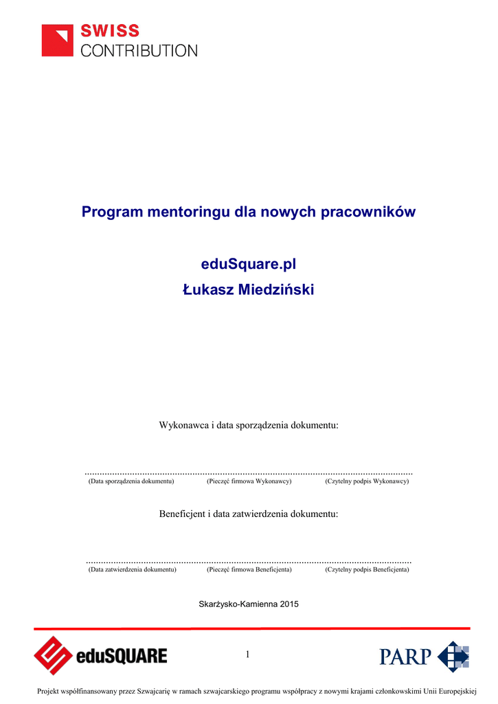 Program mentoringu dla nowych pracowników eduSquare.pl Łukasz Miedziński Wykonawca i data sporządzenia dokumentu: ................................................................................................................................... (Data sporządzenia dokumentu) (Pieczęć firmowa Wykonawcy) (Czytelny podpis Wykonawcy) Beneficjent i data zatwierdzenia dokumentu: .................................................................................................................................. (Data zatwierdzenia dokumentu) (Pieczęć firmowa Beneficjenta) (Czytelny podpis Beneficjenta) Skarżysko-Kamienna 2015 1 Projekt współfinansowany przez Szwajcarię w ramach szwajcarskiego programu współpracy z nowymi krajami członkowskimi Unii Europejskiej Spis treści Wstęp……………………………………………………………………………3 Cele programu mentoringu……………………………………………………...4 Mentor………………………………………………………………..................6 Nowy pracownik……………………………………………………………......7 Działania w ramach programu……………………………………………….....8 Ewaluacja………………………………………………………………..….….10 Załączniki………………………………………………………………………11 Ankieta A………………………………………………………………………11 Ankieta B………………………………………………………………………14 Ankieta C………………………………………………………………………17 Harmonogram działań………………………………………………………….20 2 Projekt współfinansowany przez Szwajcarię w ramach szwajcarskiego programu współpracy z nowymi krajami członkowskimi Unii Europejskiej Wstęp Rozwój firmy i platformy eduSQUARE.pl w największym stopniu zależy od odpowiednio zmotywowanych i zaangażowanych pracowników. Bez ich wiedzy i umiejętności sukces żadnego przedsiębiorstwa nie jest możliwy. W ramach działań CSR firma eduSQUARE.pl przyjęła Politykę zatrudnienia, która szczegółowo reguluje relacje pomiędzy organizacją, a jej pracownikami. Aby ułatwić wdrożenie pracownika w nowe obowiązki w strukturze eduSQUARE.pl, przedsiębiorstwo przygotowało program mentoringu. Dokument ten zakłada, że w okresie 3 miesięcy od chwili rozpoczęcia pracy nowy pracownik będzie znajdował się pod opieką doświadczonego członka zespołu eduSQUARE.pl. Dołoży ona starań, aby zgodnie ze swoją wiedzą i umiejętnościami przekazać mu jak najwięcej informacji o firmie oraz obszarze jego obowiązków. Dzięki temu nowy pracownik będzie mógł zawsze zwrócić się do swojego mentora z prośbą o pomoc, radę oraz konsultacje. Program opisuje obszary tematyczne, które powinny zostać poruszone z każdym nowym pracownikiem. W zależności od specyfiki jego obowiązków, mentor stworzy dodatkową listę zagadnień, związaną tylko z wybranym działem tematycznym. Dzięki temu wszyscy nowi pracownicy otrzymają taki sam pakiet informacji o firmie oraz dodatkowe, spersonalizowane wiadomości, dotyczące ich stanowiska pracy. Podstawą programu mentoringu jest harmonogram, który porządkuje działania mentora w określonych ramach czasowych. Projekt rozpoczyna i kończy się ankietą ewaluacyjną dla nowego pracownika, który pozwoli ocenić stopień jego postępów. Ponadto mentor dokona ewaluacja jego umiejętności w dodatkowej ankiecie. Zebrane w ten sposób dane pozwolą na stworzenie obiektywnej rekomendacji dla firmy, w sytuacji gdy będzie ona rozważać przedłużenie lub zakończenie współpracy z nowym pracownikiem. 3 Projekt współfinansowany przez Szwajcarię w ramach szwajcarskiego programu współpracy z nowymi krajami członkowskimi Unii Europejskiej Cele programu mentoringu Cel główny: Harmonijne i efektywne wdrożenie nowego pracownika w struktury firmy eduSQUARE.pl Cele szczegółowe: Poznanie przez pracownika obszarów działań przedsiębiorstwa. Integracja z zespołem pracowników eduSQUARE.pl Zdobycie nowych umiejętności, poszerzenie swojej wiedzy. Przygotowanie pracownika do podejmowania samodzielnych działań. Przekazanie pracownikowi informacji na temat działań CSR firmy. Mierniki realizacji celów: Cel: Poznanie przez pracownika obszarów działań przedsiębiorstwa. Wiedza na temat oferty, struktury i podejmowanych inicjatyw eduSQUARE.pl na poziomie 100% po 3 miesiącach (ankieta ewaluacyjna) Cel: Integracja z zespołem pracowników eduSQUARE.pl Ocena stopnia integracji z zespołem pracowników przez nową osobę oraz pozostałych członków teamu (ankieta + rozmowa z zespołem) Cel: Zdobycie nowych umiejętności, poszerzenie swojej wiedzy. Pozytywna działań nowego pracownika przez mentora – 70% (ankieta ewaluacyjna) Pozytywna ocena własnych działań przez pracownika – co najmniej 70% (ankieta ewaluacyjna) Cel: Przygotowanie pracownika do podejmowania samodzielnych działań. Ocena gotowości do podejmowania własnych obowiązków przez pracownika i jego mentora na poziomie co najmniej 80%. (ankieta ewaluacyjna) Cel: Przekazanie pracownikowi informacji na temat działań CSR firmy. Znajomość zagadnień związanych z CSR firmy na poziomie co najmniej 65% (rozmowa z mentorem pod koniec Programu mentoringu). 4 Projekt współfinansowany przez Szwajcarię w ramach szwajcarskiego programu współpracy z nowymi krajami członkowskimi Unii Europejskiej Postępy nowego pracownika w okresie trwania Programu mentoringu (3 miesiące) będą oceniane z jednej strony na podstawie obiektywnych danych (ankieta przed oraz ankieta ewaluacyjna po zakończeniu okresu próbnego). Z drugiej strony o trwałym włączeniu pracownika w struktury firmy decydować będzie subiektywna ocena mentora. Prawo po określenia