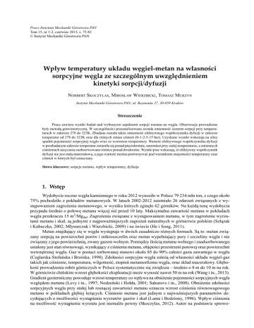 Prace Instytutu Mechaniki Górotworu PAN Tom 15, nr 1-2, czerwiec 2013, s. 75-83 © Instytut Mechaniki Górotworu PAN Wpływ temperatury układu węgiel-metan na własności sorpcyjne węgla ze szczególnym uwzględnieniem kinetyki sorpcji/dyfuzji NORBERT SKOCZYLAS, MIROSŁAW WIERZBICKI, TOMASZ MURZYN Instytut Mechaniki Górotworu PAN; ul. Reymonta 27, 30-059 Kraków Streszczenie Praca zawiera wyniki badań nad wybranymi aspektami sorpcji metanu na węglu. Obserwacje prowadzone były metodą grawimetryczną. W szczególności przeanalizowana została zmienność izoterm sorpcji przy temperaturach w zakresie 278 do 323K. Zbadana została także zmienność efektywnego współczynnika dyfuzji w zakresie temperatur od 278 do 323K oraz dla różnych zmian ciśnień (0-1-2-5-15 bar). Uzyskane wyniki wskazują na silny spadek pojemności sorpcyjnej węgla wraz ze wzrostem temperatury. Wartość efektywnego współczynnika dyfuzji w przebadanym zakresie temperatur zmieniła się ponad pięciokrotnie, natomiast przy stałej temperaturze, a zmiennych ciśnieniach nasycania zaobserwowano różnice ponad dwukrotne. Wyniki prac wskazują, iż efektywny współczynnik dyfuzji nie jest stałą materiałową, a jego wartość można porównywać pod warunkiem znajomości temperatury oraz ciśnień w których był oznaczany. Słowa kluczowe: sorpcja metanu, wpływ temperatury, dyfuzja 1. Wstęp Wydobycie roczne węgla kamiennego w roku 2012 wynosiło w Polsce 79 234 mln ton, z czego około 75% pochodziło z pokładów metanowych. W latach 2002-2012 zaistniało 26 zdarzeń związanych z występowaniem zagrożenia metanowego, w wyniku których zginęło 62 górników. Na każdą tonę wydobycia przypada średnio o połowę metanu więcej niż przed 10 laty. Maksymalna zawartość metanu w pokładach węgla przekracza 15 m3/Mgdaf. Zagrożenia związane z występowaniem metanu, w tym zagrożenie wyrzutami metanu i skał, są jednymi z najpoważniejszych zagrożeń naturalnych w górnictwie polskim (Szlązak i Kubaczka, 2002; Młynarczuk i Wierzbicki, 2009) i na świecie (He i Song, 2011). Metan znajdujący się w węglu występuje w dwóch zasadniczo różnych formach. Są to: metan związany sorpcją na powierzchni porów i mikroszczelin oraz metan wypełniający pory i szczeliny węgla i nie związany z jego powierzchnią, zwany gazem wolnym. Pomiędzy ilością metanu wolnego i zaadsorbowanego ustalony jest stan równowagi, wynikający z ciśnienia metanu, objętości przestrzeni porowej oraz powierzchni wewnętrznej węgla. Gaz w postaci sorbowanej stanowi około 85 do 90% całości gazu zawartego w węglu (Ceglarska-Stefańska i Brzóska, 1998). Zdolności sorpcyjne węgla zależą od własności układu węgiel-gaz takich jak ciśnienie, temperatura, wilgotność, stopień metamorfizmu węgla, oraz skład macerałowy. Głębokość prowadzenia robót górniczych w Polsce systematycznie się zwiększa – średnio o 8 m do 10 m na rok. W górnictwie chińskim wzrost głębokości eksploatacji może wynosić nawet 50 m na rok (Wang i in., 2013). Gradient geotermiczny powoduje wzrost temperatury co wpływa na obniżenie pojemności sorpcyjnych węgla względem metanu (Levy i in., 1997; Nodzeński i Hołda, 2001; Sakurovs i in., 2008). Obniżenie zdolności sorpcyjnych węgla przy stałej lub rosnącej zawartości metanu oznacza wzrost ciśnienia równowagowego metanu w pokładach głębiej leżących. Ciśnienie metanu jest jednym z najważniejszych parametrów decydujących o możliwości wystąpienia wyrzutów gazów i skał (Lama i Bodziony, 1996). Wpływ ciśnienia na możliwość wystąpienia wyrzutu jest niemalże pewny (Skoczylas, 2012). Autor na podstawie sprowo- Norbert Skoczylas, Mirosław Wierzbicki, Tomasz Murzyn 76 kowanych w laboratorium wyrzutów, pokazuje „prawdopodobieństwo” wystąpienia wyrzutu w zależności od ciśnienia równowagowego gazu. Na rolę ciśnienia metanu jako indykatora wyrzutów wskazują również wyniki modelowania numerycznego, jak np. (Xu i in., 2006). W GZW wystąpiły w ostatnich latach trzy wyrzuty metanu i skał (Wierzbicki i Młynarczuk, 2006; Młynarczuk i Wierzbicki, 2009). Mogły one mieć związek z rosnącym ciśnieniem metanu wywołanym gradientem geotermicznym. Badania nad wpływem temperatury na procesy sorpcyjne metanu na węglu wydają się być celowe. 2. Materiał przeznaczony do badań oraz aparatura badawcza Badania przeprowadzono na dwóch próbkach węgla pochodzących z KWK „Pniówek”. Dla badanych próbek wykonano analizę techniczną. Wyniki analizy zestawiono w tabeli 1. Tab. 1. Metariał badawczy Nazwa próbki KWK Pokład Wyrobisko f [] Vdaf [%] Aa [%] W rt [%] Pniówek 1 Pniówek 2 Pniówek Pniówek 362/1 404/1 chodnik K-3 chodnik N-6 0.52 0.45 27.30 27.97 8.10 4.68 2.29 1.73 Próby węgla pobrane w kopalni zostały rozdrobnione ręcznie a następnie przesiane na przesiewaczu laboratoryjnym. Wydzielono klasę ziarnową 0.25-0.20 [mm]. Próbki przeznaczone do badań o masie około 500 mg zostały wysuszone w temperaturze 90°C do uzyskania stałej masy. Badania wykonano metodą grawimetryczną opisaną w pracy (Benham i Ross, 1989). Do badań zastosowano urządzenie IGA-001 firmy Hiden Isochema (Rys. 1). Pozwala ono na wyznaczanie pojemności sorpcyjnej w zakresie do 20 bar. Zalety metody grawimetrycznej w badaniach węgli kamiennych przedstawiają autorzy m.in. (Beamish i in., 1991), (Levine, 1992) oraz (Saghafi i in., 2007). Rys. 1. Aparatura pomiarowa Wykonano kilka serii pomiarowych nasycania węgla metanem. Serie pomiarowe różniły się temperaturą układu węgiel-metan, lub końcowym ciśnieniem nasycania. Przed rozpoczęciem każdej serii pomiarowej próbki były odgazowywane w temperaturze 90°C przez 24 h. Aparatura wyposażona jest w pompę turbomolekularną pozwalającą na uzyskanie próżni na poziomie 10–9 [mbar]. Po odgazowaniu i ustaleniu temperatury pomiaru rozpoczynał się proces dyfuzji i sorpcji wywołany 