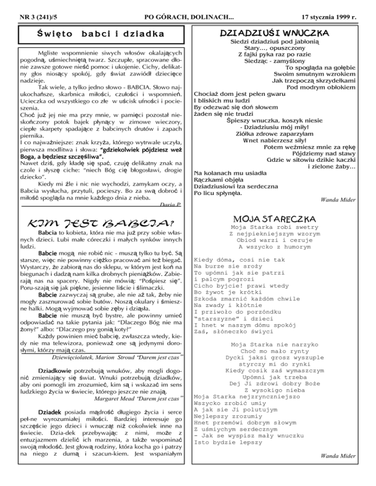 NR 3 (241)/5 Święto PO GÓRACH, DOLINACH... babci i dziadka Mgliste wspomnienie siwych włosów okalających pogodną, uśmiechniętą twarz. Szczupłe, spracowane dłonie zawsze gotowe nieść pomoc i ukojenie. Cichy, delikatny głos niosący spokój, gdy świat zawiódł dziecięce nadzieje. Tak wiele, a tylko jedno słowo - BABCIA. Słowo najukochańsze, skarbnica miłości, czułości i wspomnień. Ucieczka od wszystkiego co złe w uścisk ufności i pocieszenia. Choć juŜ jej nie ma przy mnie, w pamięci pozostał nieskończony potok bajek płynący w zimowe wieczory, ciepłe skarpety spadające z babcinych drutów i zapach piernika. I co najwaŜniejsze: znak krzyŜa, którego wytrwale uczyła, pierwsza modlitwa i słowa: “gdziekolwiek pójdziesz weź we Boga, a będ b dziesz szczęśliwa szcz liwa” liwa”. Nawet dziś, gdy kładę się spać, czuję delikatny znak na czole i słyszę ciche: “niech Bóg cię błogosławi, drogie dziecko”. Kiedy mi źle i nic nie wychodzi, zamykam oczy, a Babcia wysłucha, przytuli, pocieszy. Bo za swą dobroć i miłość spogląda na mnie kaŜdego dnia z nieba. Daria P. KIM JEST BABCIA? Babcia to kobieta, która nie ma juŜ przy sobie własnych dzieci. Lubi małe córeczki i małych synków innych ludzi. Babcie mogą nie robić nic - muszą tylko tu być. Są starsze, więc nie powinny cięŜko pracować ani teŜ biegać. Wystarczy, Ŝe zabiorą nas do sklepu, w którym jest koń na biegunach i dadzą nam kilka drobnych pieniąŜków. Zabierają nas na spacery. Nigdy nie mówią: “Pośpiesz się”. Poru-szają się jak piękne, jesienne liście i ślimaczki. Babcie zazwyczaj są grube, ale nie aŜ tak, Ŝeby nie mogły zasznurować sobie butów. Noszą okulary i śmieszne halki. Mogą wyjmować sobie zęby i dziąsła. Babcie nie muszą być bystre, ale powinny umieć odpowiadać na takie pytania jak: “Dlaczego Bóg nie ma Ŝony?” albo: “Dlaczego psy gonią koty?” KaŜdy powinien mieć babcię, zwłaszcza wtedy, kiedy nie ma telewizora, poniewaŜ one są jedynymi dorosłymi, którzy mają czas. Dziewięciolatek, Marion Stroud “Darem jest czas” Dziadkowie potrzebują wnuków, aby mogli dogonić zmieniający się świat. Wnuki potrzebują dziadków, aby oni pomogli im zrozumieć, kim są i wskazać im sens ludzkiego Ŝycia w świecie, którego jeszcze nie znają. Margaret Mead “Darem jest czas” Dziadek posiada mądrość długiego Ŝycia i serce peł-ne wyrozumiałej miłości. Bardziej interesuje go szczęście jego dzieci i wnucząt niŜ cokolwiek inne na świecie. Dzia-dek przebywając z nimi, moŜe z entuzjazmem dzielić ich marzenia, a takŜe wspominać swoją młodość. Jest głową rodziny, która kocha go i patrzy na niego z dumą i szacun-kiem. Jest wspaniałym 17 stycznia 1999 r. DZIADZIUŚ DZIADZIU I WNUCZKA Siedzi dziadziuś pod jabłonią Stary..., opuszczony Z fajki pyka raz po razie Siedząc - zamyślony To spogląda na gołębie Swoim smutnym wzrokiem Jak trzepoczą skrzydełkami Pod modrym obłokiem ChociaŜ dom jest pełen gwaru I bliskich mu ludzi By odezwać się doń słowem Ŝaden się nie trudzi Śpieszy wnuczka, koszyk niesie - Dziadziusiu mój miły! Ziółka zdrowe zaparzyłam Wnet nabierzesz siły! Potem weźmiesz mnie za rękę Pójdziemy nad stawy Gdzie w sitowiu dzikie kaczki i zielone Ŝaby... Na kolanach mu usiadła Rączkami objęła Dziadziusiowi łza serdeczna Po licu spłynęła. Wanda Mider MOJA STARECZKA Moja Starka robi swetry Z nejpiekniejszym wzorym Obiod warzi i ceruje A wszycko z humorym Kiedy dóma, cosi nie tak Na burze sie sroŜy To upómni jak sie patrzi i palcym pogrozi Cicho byjcie! prawi wtedy Bo Ŝywot je krótki Szkoda zmarnić kaŜdóm chwile Na zwady i kłótnie I prziwoło do porzóndku “starszyzne” i dzieci I hnet w naszym dómu spokój Zaś, słóneczko świyci Moja Starka nie narzyko Choć mo mało rynty Dycki jaksi grosz wyszuple styrczy mi do rynki Kiedy cosik zaś wymaszczym Upómni jak trzeba Dej Ji zdrowi dobry BoŜe Z wysokigo nieba Moja Starka nejzrynczniejszo Wszycko zrobić umiy A jak sie Ji polutujym Nejlepszy zrozumiy Hnet przemówi dobrym słowym Z uśmiychym serdecznym - Jak se wyspisz mały wnuczku Isto bydzie lepszy Wanda Mider NR 3 (241)/6 PO GÓRACH, DOLINACH... EKUMENIZM Ekumenizm - oznacza naukę i działalność zmierzającą do przywrócenia jedności chrześcijan w jednym Kościele Jezusa Chrystusa. UtoŜsamia się go często z ruchem, wyraŜającym dąŜenie chrześcijan do zjednoczenia w Kościele. Problem ekumenizmu pojawił się z rozłamami w chrześcijaństwie. Rozłamy te potępiają Apostołowie: Jan (1 J 2,18 - 19) i Paweł ( 1 Kor 1,11; 11,18 - 19; Ga 1,6 -9) jako sprzeczne z wolą Chrystusa, który ustanowił jeden Kościół. Wystąpienie Lutra (1517) i reformacja gwałtownie wyzwoliły tendencje odśrodkowe, które dały początek łańcuchowi rozłamów w chrześcijaństwie zachodnim, zapowiadając jednocześnie nową erę dąŜeń unijnych, związaną z obudzeniem powszechnej świadomości jedności u sa-mych reformatorów. Powstanie współczesnego Ruchu Ekummenicznego łączy się z konferencją Misyjnych Towarzystw Protestanckich w Edynburgu w 1910 r.; potępiła ona podziały w Chrześcijaństwie jako przeszkodę dla misji. Sobór Watykański II w “Dekrecie o ekumenizmie” podał zarys katolickiej teologii ekumenizmu. Mówi, Ŝe rozłamy nie pozbawiły Kościoła jedności, która istnieje bez moŜliwości utracenia w Kościele katolickim. Odłączone Wspólnoty nie są pozbawione znaczenia w tajemnicy zbawienia i Duch Chrystusa posługuje się nimi jako narzędziami zbawienia. Wspólnoty te zachowują niektóre elementy, liczne i znamienite, prawdziwego Kościoła. Dlatego Sobór nazywa je Kościołami i Wspólnotami kościelnymi. Ich członkowie, którzy wierzą w Chrystusa i otrzymali waŜny chrzest, pozostają w pewnej wspólnocie z Kościołem katolickim i mają prawo być nazywani braćmi w Panu i chrześcija