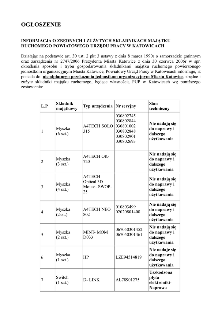 OGŁOSZENIE INFORMACJA O ZBĘDNYCH I ZUŻYTYCH SKŁADNIKACH MAJĄTKU RUCHOMEGO POWIATOWEGO URZĘDU PRACY W KATOWICACH Działając na podstawie art. 30 ust. 2 pkt 3 ustawy z dnia 8 marca 1990r o samorządzie gminnym oraz zarządzenia nr 2747/2006 Prezydenta Miasta Katowice z dnia 30 czerwca 2006r w spr. określenia sposobu i trybu gospodarowania składnikami majątku ruchomego powierzonego jednostkom organizacyjnym Miasta Katowice, Powiatowy Urząd Pracy w Katowicach informuje, iż posiada do nieodpłatnego przekazania jednostkom organizacyjnym Miasta Katowice, zbędne i zużyte składniki majątku ruchomego, będące własnością PUP w Katowicach wg poniższego zestawienia: L.P Składnik majątkowy 1 Myszka (6 szt.) 2 Myszka (3 szt.) 3 Myszka (4 szt.) 4 Myszka (2szt.) 5 Myszka (2 szt.) 6 Myszka (1 szt.) 7 Switch (1 szt.) Typ urządzenia Nr seryjny 030802745 030802844 A4TECH SOLO 030801002 030802848 315 030802901 030802693 A4TECH Optical 3D Mouse- SWOP25 MINT- MOM D033 HP D- LINK Nie nadają się do naprawy i dalszego użytkowania Nie nadają się do naprawy i dalszego użytkowania A4TECH OK720 A4TECH NEO 802 Stan techniczny Nie nadają się do naprawy i dalszego użytkowania 010803499 02020801400 067050301452 067050301461 Nie nadają się do naprawy i dalszego użytkowania Nie nadają się do naprawy i dalszego użytkowania LZE94514819 Nie nadaje się do naprawy i dalszego użytkowania AL78901275 Uszkodzona płyta elektronikiNaprawa nieuzasadniona technicznie i elektronicznie 8 9 B24808023 B24808136 Nie nadają się do naprawy i dalszego użytkowania Klawiatura (2 szt.) BTC Klawiatura (1 szt.) Nie nadaje się ID do naprawy i MINT KB-1607 ZDK8QL6908W dalszego użytkowania Przekazanie składnika jednostce organizacyjnej Miasta Katowice następuje na wniosek o nieodpłatne przekazanie, kierowany do Dyrektora PUP w Katowicach (zał. nr 6 do Zarz. nr 37/2008 z dnia 08.08 2008 – w załączeniu poniżej) Odbiór składnika majątku ruchomego następuje na koszt podmiotu, któremu przekazano ten składnik majątku. Wnioski prosimy przesyłać do 28 grudnia 2009 r. na adres: POWIATOWY URZĄD PRACY 40-852 Katowice, ul. Pośpiecha 14 z dopiskiem: mienie zbędne i zużyte W przypadku niejasności pytania prosimy kierować do Referatu ds. organizacyjno – administracyjnych – p. S. Grzegorczyk pod. tel.: 32 2588-549, wew. 416 e-mail: [email protected] Dyrektor Barbara Zając