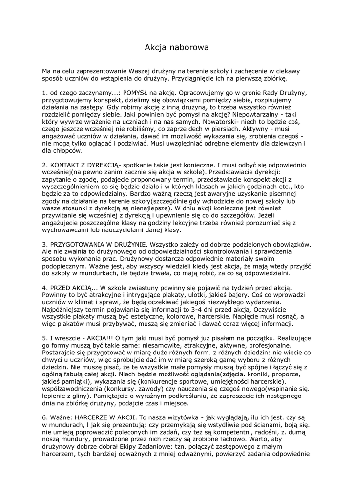 Akcja naborowa Ma na celu zaprezentowanie Waszej drużyny na terenie szkoły i zachęcenie w ciekawy sposób uczniów do wstąpienia do drużyny. Przyciągnięcie ich na pierwszą zbiórkę. 1. od czego zaczynamy...: POMYSŁ na akcję. Opracowujemy go w gronie Rady Drużyny, przygotowujemy konspekt, dzielimy się obowiązkami pomiędzy siebie, rozpisujemy działania na zastępy. Gdy robimy akcję z inną drużyną, to trzeba wszystko również rozdzielić pomiędzy siebie. Jaki powinien być pomysł na akcję? Niepowtarzalny - taki który wywrze wrażenie na uczniach i na nas samych. Nowatorski- niech to będzie coś, czego jeszcze wcześniej nie robiliśmy, co zaprze dech w piersiach. Aktywny - musi angażować uczniów w działania, dawać im możliwość wykazania się, zrobienia czegoś nie mogą tylko oglądać i podziwiać. Musi uwzględniać odrębne elementy dla dziewczyn i dla chłopców. 2. KONTAKT Z DYREKCJĄ- spotkanie takie jest konieczne. I musi odbyć się odpowiednio wcześniej(na pewno zanim zacznie się akcja w szkole). Przedstawiacie dyrekcji: zapytanie o zgodę, podajecie proponowany termin, przedstawiacie konspekt akcji z wyszczególnieniem co się będzie działo i w których klasach w jakich godzinach etc., kto będzie za to odpowiedzialny. Bardzo ważną rzeczą jest awaryjne uzyskanie pisemnej zgody na działanie na terenie szkoły(szczególnie gdy wchodzicie do nowej szkoły lub wasze stosunki z dyrekcją są nienajlepsze). W dniu akcji konieczne jest również przywitanie się wcześniej z dyrekcją i upewnienie się co do szczegółów. Jeżeli angażujecie poszczególne klasy na godziny lekcyjne trzeba również porozumieć się z wychowawcami lub nauczycielami danej klasy. 3. PRZYGOTOWANIA W DRUŻYNIE. Wszystko zależy od dobrze podzielonych obowiązków. Ale nie zwalnia to drużynowego od odpowiedzialności skontrolowania i sprawdzenia sposobu wykonania prac. Drużynowy dostarcza odpowiednie materiały swoim podopiecznym. Ważne jest, aby wszyscy wiedzieli kiedy jest akcja, że mają wtedy przyjść do szkoły w mundurkach, ile będzie trwała, co mają robić, za co są odpowiedzialni. 4. PRZED AKCJĄ... W szkole zwiastuny powinny się pojawić na tydzień przed akcją. Powinny to być atrakcyjne i intrygujące plakaty, ulotki, jakieś bajery. Coś co wprowadzi uczniów w klimat i sprawi, że będą oczekiwać jakiegoś niezwykłego wydarzenia. Najpóźniejszy termin pojawiania się informacji to 3-4 dni przed akcją. Oczywiście wszystkie plakaty muszą być estetyczne, kolorowe, harcerskie. Napięcie musi rosnąć, a więc plakatów musi przybywać, muszą się zmieniać i dawać coraz więcej informacji. 5. I wreszcie - AKCJA!!! O tym jaki musi być pomysł już pisałam na początku. Realizujące go formy muszą być takie same: niesamowite, atrakcyjne, aktywne, profesjonalne. Postarajcie się przygotować w miarę dużo różnych form. z różnych dziedzin: nie wiecie co chwyci u uczniów, więc spróbujcie dać im w miarę szeroką gamę wyboru z różnych dziedzin. Nie muszę pisać, że te wszystkie małe pomysły muszą być spójne i łączyć się z ogólną fabułą całej akcji. Niech będzie możliwość oglądania(zdjęcia. kroniki, proporce, jakieś pamiątki), wykazania się (konkurencje sportowe, umiejętności harcerskie). współzawodniczenia (konkursy. zawody) czy nauczenia się czegoś nowego(wspinanie się. lepienie z gliny). Pamiętajcie o wyraźnym podkreślaniu, że zapraszacie ich następnego dnia na zbiórkę drużyny, podajcie czas i miejsce. 6. Ważne: HARCERZE W AKCJI. To nasza wizytówka - jak wyglądają, ilu ich jest. czy są w mundurach, l jak się prezentują: czy przemykają się wstydliwie pod ścianami, boją się. nie umieją poprowadzić poleconych im zadań, czy też są kompetentni, radośni, z. dumą noszą mundury, prowadzone przez nich rzeczy są zrobione fachowo. Warto, aby drużynowy dobrze dobrał Ekipy Zadaniowe: tzn. połączyć zastępowego z małym harcerzem, tych bardziej odważnych z mniej odważnymi, powierzyć zadania odpowiednie do ich zainteresowań i umiejętności. Jeżeli uczniowie zobaczą, że harcerze są dumni ze swoich mundurów, dobrze się ze sobą czują, to będą chcieli bliżej nas poznać. 7. PO AKCJI... Nie zapomnijcie posprzątać po sobie w szkole, zdjąć wszystkie plakaty, zebrać ulotki, podziękować dyrekcji i nauczycielom. W gronie Rady konieczne jest podsumowanie wyników: co się udało, co nie. zebranie pomysłów na następny rok, ocenienie pracy poszczególnych harcerzy, wstępne zastanowienie się nad efektami: jaki było zainteresowanie, ile osób chciało przyjść na zbiórkę. I czekać na piątkową zbiórkę drużyny... 8. TAJEMNICA PIERWSZEJ ZBIÓRKI. Od niej bardzo dużo zależy: jak "nowi" zostaną powitani, jak ich przyjmiecie, co się będzie działo na zbiórce. O czy trzeba pamiętać? Punktualność przede wszystkim. Potem nie wolno zostawić nowicjuszy samym sobie, musza się nimi zajmować harcerze - najlepiej przyszli zastępowi. Na zbiórce trzeba dać im możliwość poznania się, pokazania jeszcze bliżej drużyny. Na pewno zbiórka musi zawierać w sobie wszystkie podstawowe elementy: powitanie, zakończenie, apel, rozkaz, podsumowanie, ale nie może zabraknąć w niej także nowych "fajnych" elementów które spowodują, że zbiórka będzie bardzo atrakcyjna dla nowych jak i dla starych harcerzy to spowoduje że bardzo się w nią zaangażuj ą. Nie możecie dopuścić do rozdziału na starych i nowych - to ci ostatni są dla Was najważniejsi. Nie mogą się rozejść do domów bez umówienia się na kolejną zbiórkę zastępu. Zbiórka nie może być długą gawędą, nie może być sprawdzianem technik harcerskich. Może za to być kontynuacją jakichś wydarzeń z akcji. 9. Ale pierwsza zbiórka to nie wszystko: co z tego, że przyjdzie na nią 20 chętnych skoro nie umiemy ich utrzymać w drużynie? Ale odpowiedź jak temu zapobiec poznali
