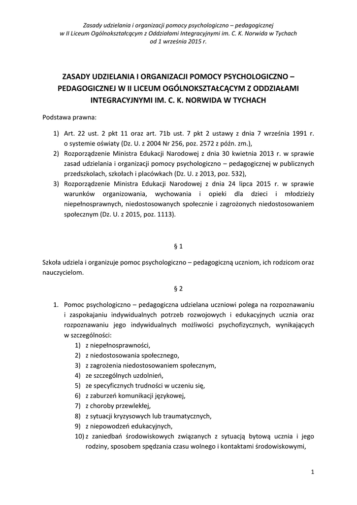 Zasady udzielania i organizacji pomocy psychologiczno – pedagogicznej w II Liceum Ogólnokształcącym z Oddziałami Integracyjnymi im. C. K. Norwida w Tychach od 1 września 2015 r. ZASADY UDZIELANIA I ORGANIZACJI POMOCY PSYCHOLOGICZNO – PEDAGOGICZNEJ W II LICEUM OGÓLNOKSZTAŁCĄCYM Z ODDZIAŁAMI INTEGRACYJNYMI IM. C. K. NORWIDA W TYCHACH Podstawa prawna: 1) Art. 22 ust. 2 pkt 11 oraz art. 71b ust. 7 pkt 2 ustawy z dnia 7 września 1991 r. o systemie oświaty (Dz. U. z 2004 Nr 256, poz. 2572 z późn. zm.), 2) Rozporządzenie Ministra Edukacji Narodowej z dnia 30 kwietnia 2013 r. w sprawie zasad udzielania i organizacji pomocy psychologiczno – pedagogicznej w publicznych przedszkolach, szkołach i placówkach (Dz. U. z 2013, poz. 532), 3) Rozporządzenie Ministra Edukacji Narodowej z dnia 24 lipca 2015 r. w sprawie warunków organizowania, wychowania i opieki dla dzieci i młodzieży niepełnosprawnych, niedostosowanych społecznie i zagrożonych niedostosowaniem społecznym (Dz. U. z 2015, poz. 1113). §1 Szkoła udziela i organizuje pomoc psychologiczno – pedagogiczną uczniom, ich rodzicom oraz nauczycielom. §2 1. Pomoc psychologiczno – pedagogiczna udzielana uczniowi polega na rozpoznawaniu i zaspokajaniu indywidualnych potrzeb rozwojowych i edukacyjnych ucznia oraz rozpoznawaniu jego indywidualnych możliwości psychofizycznych, wynikających w szczególności: 1) z niepełnosprawności, 2) z niedostosowania społecznego, 3) z zagrożenia niedostosowaniem społecznym, 4) ze szczególnych uzdolnień, 5) ze specyficznych trudności w uczeniu się, 6) z zaburzeń komunikacji językowej, 7) z choroby przewlekłej, 8) z sytuacji kryzysowych lub traumatycznych, 9) z niepowodzeń edukacyjnych, 10) z zaniedbań środowiskowych związanych z sytuacją bytową ucznia i jego rodziny, sposobem spędzania czasu wolnego i kontaktami środowiskowymi, 1 Zasady udzielania i organizacji pomocy psychologiczno – pedagogicznej w II Liceum Ogólnokształcącym z Oddziałami Integracyjnymi im. C. K. Norwida w Tychach od 1 września 2015 r. 11) z trudności adaptacyjnych związanych z różnicami kulturowymi lub ze zmianą środowiska edukacyjnego, w tym związanych z wcześniejszym kształceniem zagranicą. 2. Pomoc psychologiczno – pedagogiczna udzielana rodzicom uczniów i nauczycielom polega na wspieraniu rodziców i nauczycieli w rozwiązywaniu problemów wychowawczych i dydaktycznych oraz rozwijaniu ich umiejętności wychowawczych w celu zwiększania efektywności pomocy psychologiczno – pedagogicznej dla uczniów. §3 Korzystanie z pomocy psychologiczno – pedagogicznej jest dobrowolne i nieodpłatne. §4 1. Pomoc psychologiczno – pedagogiczną organizuje dyrektor szkoły. 2. Pomocy psychologiczno – pedagogicznej udzielają nauczyciele i specjaliści wykonujący w szkole zadania z zakresu pomocy psychologiczno – pedagogicznej, zwłaszcza pedagog i psycholog. 3. Pomoc psychologiczno – pedagogiczna jest organizowana i udzielana we współpracy z: 1) rodzicami uczniów, 2) poradnią psychologiczno – pedagogiczną, 3) placówkami doskonalenia nauczycieli, 4) innymi szkołami i placówkami, 5) organizacjami pozarządowymi oraz innymi instytucjami działającymi na rzecz rodziny, dzieci i młodzieży. §5 Pomoc psychologiczno pedagogiczna w szkole udzielana jest z inicjatywy: 1) ucznia, 2) rodziców ucznia, 3) dyrektora szkoły, 4) nauczyciela lub specjalisty, prowadzących zajęcia z uczniem, 5) higienistki szkolnej, 6) poradni, 7) pracownika socjalnego, 8) asystenta rodziny, 9) kuratora sądowego. 2 Zasady udzielania i organizacji pomocy psychologiczno – pedagogicznej w II Liceum Ogólnokształcącym z Oddziałami Integracyjnymi im. C. K. Norwida w Tychach od 1 września 2015 r. §6 1. W szkole pomoc psychologiczno – pedagogiczna jest udzielana w trakcie bieżącej pracy z uczniem w formie: 1) zajęć rozwijających uzdolnienia, 2) zajęć dydaktyczno – wyrównawczych, 3) zajęć specjalistycznych korekcyjno – kompensacyjnych, logopedycznych, socjoterapeutycznych oraz innych zajęć o charakterze terapeutycznym, 4) zajęć związanych z wyborem kierunku kształcenia i zawodu oraz planowaniem kształcenia i kariery zawodowej, 5) warsztatów, 6) porad i konsultacji. 2. W szkole pomoc psychologiczno – pedagogiczna jest udzielana rodzicom uczniów i nauczycielom w formie porad, konsultacji, warsztatów i szkoleń. §7 Zajęcia rozwijające uzdolnienia organizuje się dla uczniów szczególnie uzdolnionych oraz prowadzi przy wykorzystaniu aktywnych metod pracy. Liczba uczestników zajęć nie może przekraczać 8. §8 Zajęcia dydaktyczno – wyrównawcze organizuje się dla uczniów mających trudności w nauce, w szczególności w spełnianiu wymagań edukacyjnych wynikających z podstawy programowej kształcenia ogólnego. Liczba uczestników zajęć nie może przekraczać 8. §9 Zajęcia korekcyjno – kompensacyjne organizuje się dla uczniów z zaburzeniami i odchyleniami rozwojowymi lub specyficznymi trudnościami w uczeniu się. Liczba uczestników zajęć nie może przekraczać 5. § 10 Zajęcia logopedyczne organizuje się dla uczniów z zaburzeniami mowy, które powodują zaburzenia komunikacji językowej oraz utrudniają naukę. Liczba uczestników zajęć nie może przekraczać 4. § 11 Zajęcia socjoterapeutyczne oraz inne zajęcia o charakterze terapeutycznym organizuje się dla uczniów z dysfunkcjami i zaburzeniami utrudniającymi funkcjonowanie społeczne. Liczba uczestników zajęć nie może przekraczać 10. 3 Zasady udzielania i organizacji pomocy psychologiczno – pedagogicznej w II Liceum Ogólnokształcącym z Oddziałami Integracyjnymi im. C. K. Norwida w Tychach od 1 września 2015 r. § 12 1. Godzina zajęć rozwijających uzdolnienia i zajęć dydaktyczno – wyrównawczych trwa 45 minut, a godzina zajęć specjalistycznych – 60 minut. 2. W uzasadnionych przypadkach dopuszcza się prowadzenie zajęć specjalistycznych w czasie krótszym 