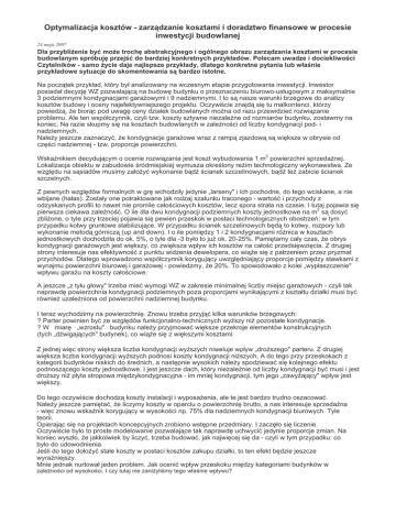 Optymalizacja kosztów - zarządzanie kosztami i doradztwo finansowe w procesie inwestycji budowlanej 24 maja 2007 Dla przybliżenia być może trochę abstrakcyjnego i ogólnego obrazu zarządzania kosztami w procesie budowlanym spróbuję przejść do bardziej konkretnych przykładów. Polecam uwadze i dociekliwości Czytelników - samo życie daje najlepsze przykłady, dlatego konkretne pytania lub właśnie przykładowe sytuacje do skomentowania są bardzo istotne. Na początek przykład, który był analizowany na wczesnym etapie przygotowania inwestycji. Inwestor posiadał decyzję WZ pozwalającą na budowę budynku o przeznaczeniu biurowo-usługowym z maksymalnie 3 podziemnymi kondygnacjami garażowymi i 9 nadziemnymi. I to są nasze warunki brzegowe do analizy kosztów budowy i oceny najefektywniejszego projektu. Oczywiście znajdą się tu malkontenci, którzy powiedzą, że biorąc pod uwagę ceny działek budowlanych można od razu przewidzieć rozwiązanie problemu. Ale ten współczynnik, czyli tzw. koszty sztywne niezależne od rozmiarów budynku, zostawmy na koniec. Na razie skupmy się na kosztach budowlanych w zależności od liczby kondygnacji pod- i nadziemnych. Należy jeszcze zaznaczyć, że kondygnacje garażowe wraz z rampą zjazdową są większe w obrysie od części nadziemnej - tzw. proporcje powierzchni. Wskaźnikiem decydującym o ocenie rozwiązania jest koszt wybudowania 1 m2 powierzchni sprzedażnej. Lokalizacja obiektu w zabudowie śródmiejskiej wymusza określony reżim technologiczny wykonawstwa. Ze względu na sąsiadów musimy założyć wykonanie bądź ścianek szczelinowych, bądź też zabicie ścianek szczelnych. Z pewnych względów formalnych w grę wchodziły jedynie „larseny" i ich pochodne, do tego wciskane, a nie wbijane (hałas). Zostały one potraktowane jak rodzaj szalunku traconego - wartość i przychody z odzyskanych profili to nawet nie promile całościowych kosztów, lecz spora strata na czasie. I tutaj pojawia się pierwsza ciekawa zależność. O ile dla dwu kondygnacji podziemnych koszty jednostkowe na m2 są dosyć zbliżone, o tyle przy trzeciej pojawia się pewien przeskok w postaci technologicznych obostrzeń: w tym przypadku kotwy gruntowe stabilizujące. W przypadku ścianek szczelinowych będą to kotwy, rozpory lub wykonanie metodą górniczą (up and down). I o ile pomiędzy 1 i 2 kondygnacjami różnica w kosztach jednostkowych dochodziła do ok. 5%, o tyle dla -3 było to już ok. 20-25%. Pamiętamy cały czas, że obrys kondygnacji garażowych jest większy, co zwiększa wpływ ich kosztów na całość przedsięwzięcia. Z drugiej strony interesuje nas efektywność z punktu widzenia dewelopera, co wiąże się z patrzeniem przez pryzmat przychodów. Dlatego wprowadzono współczynnik korygujący uwzględniający proporcje pomiędzy stawkami z wynajmu powierzchni biurowej i garażowej - powiedzmy, że 20%. To spowodowało z kolei „wypłaszczenie" wpływu garażu na koszty całościowe. A jeszcze „z tyłu głowy" trzeba mieć wymogi WZ w zakresie minimalnej liczby miejsc garażowych - czyli tak naprawdę powierzchnia kondygnacji podziemnych poza proporcjami wynikającymi z kształtu działki musi być również uzależniona od powierzchni nadziemnej budynku. I teraz wychodzimy na powierzchnię. Znowu trzeba przyjąć kilka warunków brzegowych: ? Parter powinien być ze względów funkcjonalno-technicznych wyższy niż pozostałe kondygnacje. ? W miarę „wzrostu" budynku należy przyjmować większe przekroje elementów konstrukcyjnych (tych „dźwigających" budynek), co wiąże się z większymi kosztami. Z jednej więc strony większa liczba kondygnacji wyższych niweluje wpływ „droższego" parteru. Z drugiej większa liczba kondygnacji wyższych podnosi koszty kondygnacji niższych. A do tego przy przeskokach z kategorii budynków niskich do średnich, a następnie wysokich należy spodziewać się kolejnego efektu podnoszącego koszty jednostkowe. I jest jeszcze dach, który niezależnie od liczby kondygnacji być musi i jest droższy niż płyta stropowa międzykondygnacyjna - im mniej kondygnacji, tym jego „zawyżający" wpływ jest większy. Do tego oczywiście dochodzą koszty instalacji i wyposażenia, ale te jest bardzo trudno oszacować. Należy jeszcze pamiętać, że liczymy koszty w oparciu o powierzchnię brutto, a nas interesuje sprzedażna - więc znowu wskaźnik korygujący w wysokości np. 75% dla nadziemnych kondygnacji biurowych. Tyle teorii. Opierając się na projektach koncepcyjnych zrobiono wstępne przedmiary. I zaczęło się liczenie. Oczywiście było to proste modelowanie pozwalające tak naprawdę uchwycić jedynie proporcje zmian. Na koniec wyszło, że jakkolwiek by liczyć, trzeba budować, jak najwięcej się da - czyli w tym przypadku: co było do udowodnienia. Jeśli do tego dołożyć stałe koszty w postaci kosztów zakupu działki, to ten efekt będzie jeszcze wyraźniejszy. Mnie jednak nurtował jeden problem. Jak ocenić wpływ przeskoku między kategoriami budynków w zależności od wysokości. I czy tutaj nie zaniżyliśmy tego właśnie wpływu? Niestety - brak badań i analiz statystycznych nie pozwalał na „praktyczną" weryfikację przyjętych założeń. Generalnie trwałem więc w przekonaniu, że przy przeskoku z jednej kategorii do drugiej powinien pojawić się jakiś skokowy wzrost ceny jednostkowej. Kiedy pojawiła się okazja do weryfikacji przy okazji analizy ofert dla kilku budynków, pełen nadziei przystąpiłem do liczenia i... zdziwienie. Dla dwóch budynków o bardzo porównywalnej skali i technologii wykonania, tyle że jeden o „orientacji poziomej", czyli dosyć niski, a drugi o „orientacji pionowej" i wysokości powyżej 25 m, oferowanych w mniej więcej tym samym czasie, koszty jednostkowe dla budynku niskiego niewiele, ale zauważalnie były wyższe! Jak wiadomo, doświadczenie jest ostatecznym weryfikatorem teorii - więc moj