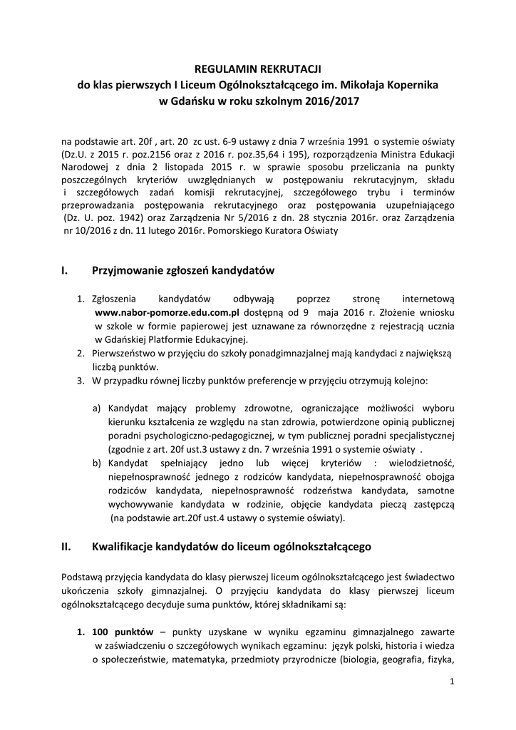 REGULAMIN REKRUTACJI do klas pierwszych I Liceum Ogólnokształcącego im. Mikołaja Kopernika w Gdańsku w roku szkolnym 2016/2017 na podstawie art. 20f , art. 20 zc ust. 6-9 ustawy z dnia 7 września 1991 o systemie oświaty (Dz.U. z 2015 r. poz.2156 oraz z 2016 r. poz.35,64 i 195), rozporządzenia Ministra Edukacji Narodowej z dnia 2 listopada 2015 r. w sprawie sposobu przeliczania na punkty poszczególnych kryteriów uwzględnianych w postępowaniu rekrutacyjnym, składu i szczegółowych zadań komisji rekrutacyjnej, szczegółowego trybu i terminów przeprowadzania postępowania rekrutacyjnego oraz postępowania uzupełniającego (Dz. U. poz. 1942) oraz Zarządzenia Nr 5/2016 z dn. 28 stycznia 2016r. oraz Zarządzenia nr 10/2016 z dn. 11 lutego 2016r. Pomorskiego Kuratora Oświaty I. Przyjmowanie zgłoszeń kandydatów 1. Zgłoszenia kandydatów odbywają poprzez stronę internetową www.nabor-pomorze.edu.com.pl dostępną od 9 maja 2016 r. Złożenie wniosku w szkole w formie papierowej jest uznawane za równorzędne z rejestracją ucznia w Gdańskiej Platformie Edukacyjnej. 2. Pierwszeństwo w przyjęciu do szkoły ponadgimnazjalnej mają kandydaci z największą liczbą punktów. 3. W przypadku równej liczby punktów preferencje w przyjęciu otrzymują kolejno: a) Kandydat mający problemy zdrowotne, ograniczające możliwości wyboru kierunku kształcenia ze względu na stan zdrowia, potwierdzone opinią publicznej poradni psychologiczno-pedagogicznej, w tym publicznej poradni specjalistycznej (zgodnie z art. 20f ust.3 ustawy z dn. 7 września 1991 o systemie oświaty . b) Kandydat spełniający jedno lub więcej kryteriów : wielodzietność, niepełnosprawność jednego z rodziców kandydata, niepełnosprawność obojga rodziców kandydata, niepełnosprawność rodzeństwa kandydata, samotne wychowywanie kandydata w rodzinie, objęcie kandydata pieczą zastępczą (na podstawie art.20f ust.4 ustawy o systemie oświaty). II. Kwalifikacje kandydatów do liceum ogólnokształcącego Podstawą przyjęcia kandydata do klasy pierwszej liceum ogólnokształcącego jest świadectwo ukończenia szkoły gimnazjalnej. O przyjęciu kandydata do klasy pierwszej liceum ogólnokształcącego decyduje suma punktów, której składnikami są: 1. 100 punktów – punkty uzyskane w wyniku egzaminu gimnazjalnego zawarte w zaświadczeniu o szczegółowych wynikach egzaminu: język polski, historia i wiedza o społeczeństwie, matematyka, przedmioty przyrodnicze (biologia, geografia, fizyka, 1 chemia) oraz język obcy nowożytny na poziomie podstawowym, przelicza się na punkty według zasady: wynik procentowy z ww. zakresów mnożony przez 0,2 . 2. 100 punktów – punkty uzyskane za świadectwo: a/ oceny z języka polskiego i trzech wskazanych przez szkołę obowiązkowych zajęć edukacyjnych, zapisanych w statucie szkoły - max. 80 pkt. b/ szczególne osiągnięcia ucznia wymienione na świadectwie ukończenia gimnazjum max. 13 pkt c/ świadectwo ukończenia gimnazjum z wyróżnieniem – 5 pkt. d/ aktywność na rzecz innych ludzi (np.wolontariat) – 2 pkt. III. Sposób przeliczania na punkty ocen z języka polskiego i trzech wybranych obowiązkowych zajęć edukacyjnych, a także sposób punktowania innych osiągnięć kandydatów do liceum 1. Obowiązkowe zajęcia edukacyjne wybrane przez szkołę do punktacji: Symbol klasy Nazwa klasy 1a humanistyczna 1b akademicka matematyczno-fizyczna 1c matematyczno-fizyczna z informatyką 1d matematycznogeograficzna 1e i 1f biologiczno-chemiczna Przedmioty, z których, w procesie rekrutacji, oceny są punktowane język polski język obcy historia wiedza o społeczeństwie język polski język obcy matematyka fizyka język polski matematyka język obcy fizyka język polski matematyka geografia wiedza o społeczeństwie język polski matematyka biologia chemia 2 2. • • • • • Sposób przeliczania na punkty ocen z przedmiotów wymieniowych wyżej: celujący – 20 pkt. bardzo dobry – 16 pkt. dobry – 12 pkt. dostateczny – 8 pkt. dopuszczający – 2 pkt. 3. Sposób przeliczania innych osiągnięć ucznia wymienionych na świadectwie ukończenia gimnazjum: A. Za uzyskanie w zawodach wiedzy będących konkursem o zasięgu ponadwojewódzkim organizowanym przez kuratorów oświaty na podstawie zawartych porozumień: a) tytuł finalisty konkursu przedmiotowego – przyznaje się 10 pkt, b) tytuł laureata konkursu tematycznego lub interdyscyplinarnego – przyznaje się 7 pkt, c) tytuł finalisty konkursu tematycznego lub interdyscyplinarnego – przyznaję się 5 pkt. B. Za uzyskanie w zawodach wiedzy będących konkursem o zasięgu wojewódzkim zorganizowanym przez kuratora oświaty: a) dwóch lub więcej tytułów finalisty konkursu przedmiotowego - przyznaje się 10 punktów, b) dwóch lub więcej tytułów laureata konkursu tematycznego lub interdyscyplinarnego 7 punktów, c) dwóch lub więcej tytułów finalisty konkursu tematycznego lub interdyscyplinarnego 5 punktów, d) tytułu finalisty konkursu przedmiotowego - 7 punktów, e) tytułu laureata konkursu tematycznego lub interdyscyplinarnego - 5 punktów, f) tytułu finalisty konkursu tematycznego lub interdyscyplinarnego - 3 punkty. C. Za uzyskanie wysokiego miejsca w zawodach wiedzy innych niż wymienione w pkt A i B artystycznych lub sportowych, organizowanych przez kuratora oświaty lub inne podmioty działające na terenie na szczeblu: a) międzynarodowym - przyznaje się 4 punkty, b) krajowym - 3 punkty, c) wojewódzkim - 2 punkty, d) powiatowym - 1 punkt. UWAGA: Gdy kandydat ma więcej niż jedno szczególne osiągnięcie w zawodach wiedzy, artystycznych i sportowych, wymienione na świadectwie gimnazjum, sumuje się liczbę uzyskanych punktów za osiągnięcia wymienione w podpunktach A, B, C, ale maksymalna liczba punktów możliwych do uzyskania za wszystkie osiągnięcia wynosi 13 punktów. 3 4. Laureaci i finaliści ogólnopolskich olimpiad przedmiotowych oraz laureaci konk