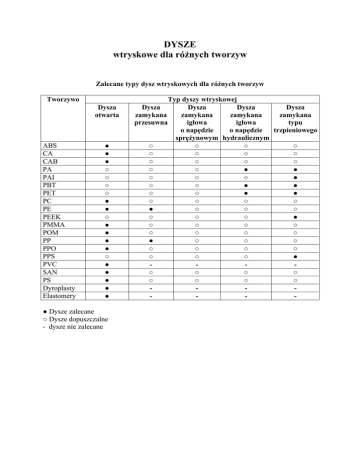 DYSZE wtryskowe dla różnych tworzyw Zalecane typy dysz wtryskowych dla różnych tworzyw Tworzywo Dysza otwarta ABS CA CAB PA PAI PBT PET PC PE PEEK PMMA POM PP PPO PPS PVC SAN PS Dyroplasty Elastomery ● ● ● ○ ○ ○ ○ ● ● ○ ● ● ● ● ○ ● ● ● ● ● ● Dysze zalecane ○ Dysze dopuszczalne - dysze nie zalecane Typ dyszy wtryskowej Dysza Dysza Dysza Dysza zamykana zamykana zamykana zamykana igłowa typu przesuwna igłowa o napędzie trzpieniowego o napędzie sprężynowym hydraulicznym ○ ○ ○ ○ ○ ○ ○ ○ ○ ○ ○ ○ ○ ○ ● ● ○ ○ ○ ● ○ ○ ● ● ○ ○ ● ● ○ ○ ○ ○ ● ○ ○ ○ ○ ○ ○ ● ○ ○ ○ ○ ○ ○ ○ ○ ● ○ ○ ○ ○ ○ ○ ○ ○ ○ ○ ● ○ ○ ○ ○ ○ ○ ○ ○ -