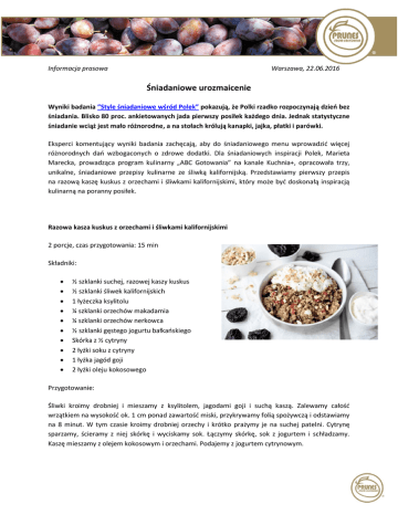 Informacja prasowa Warszawa, 22.06.2016 Śniadaniowe urozmaicenie Wyniki badania ”Style śniadaniowe wśród Polek” pokazują, że Polki rzadko rozpoczynają dzień bez śniadania. Blisko 80 proc. ankietowanych jada pierwszy posiłek każdego dnia. Jednak statystyczne śniadanie wciąż jest mało różnorodne, a na stołach królują kanapki, jajka, płatki i parówki. Eksperci komentujący wyniki badania zachęcają, aby do śniadaniowego menu wprowadzić więcej różnorodnych dań wzbogaconych o zdrowe dodatki. Dla śniadaniowych inspiracji Polek, Marieta Marecka, prowadząca program kulinarny „ABC Gotowania” na kanale Kuchnia+, opracowała trzy, unikalne, śniadaniowe przepisy kulinarne ze śliwką kalifornijską. Przedstawiamy pierwszy przepis na razową kaszę kuskus z orzechami i śliwkami kalifornijskimi, który może być doskonałą inspiracją kulinarną na poranny posiłek. Razowa kasza kuskus z orzechami i śliwkami kalifornijskimi 2 porcje, czas przygotowania: 15 min Składniki: ½ szklanki suchej, razowej kaszy kuskus ½ szklanki śliwek kalifornijskich 1 łyżeczka ksylitolu ¼ szklanki orzechów makadamia ¼ szklanki orzechów nerkowca ½ szklanki gęstego jogurtu bałkańskiego Skórka z ½ cytryny 2 łyżki soku z cytryny 1 łyżka jagód goji 2 łyżki oleju kokosowego Przygotowanie: Śliwki kroimy drobniej i mieszamy z ksylitolem, jagodami goji i suchą kaszą. Zalewamy całość wrzątkiem na wysokość ok. 1 cm ponad zawartość miski, przykrywamy folią spożywczą i odstawiamy na 8 minut. W tym czasie kroimy drobniej orzechy i krótko prażymy je na suchej patelni. Cytrynę sparzamy, ścieramy z niej skórkę i wyciskamy sok. Łączymy skórkę, sok z jogurtem i schładzamy. Kaszę mieszamy z olejem kokosowym i orzechami. Podajemy z jogurtem cytrynowym. *** Kontakt dla prasy: Michał Kopera | [email protected] Kamila Wardyn | [email protected] Social media: Facebook: facebook.com/sliwkikalifornijskie Instagram: Instagram.com/sliwki_kalifornijskie Pinterest: pinterest.com/sliwkikali/ Biuro Prasowe: http://sliwkikalifornijskie.prowly.com/ O California Prune Board California Prune Board działa pod nadzorem Kalifornijskiego Departamentu Żywności i Rolnictwa i reprezentuje branżę suszonych śliwek z Kalifornii, składającą się z 900 plantatorów śliwek oraz 29 firm konfekcjonujących. Kalifornia jest największym producentem suszonych śliwek na świecie, słynących z najwyższej jakości osiąganej dzięki regionalnym, rygorystycznym technikom zbierania owoców oraz oceny i kontroli. Produkt premium dostarczany jest do 72 krajów na całym świecie, region zapewnia 43 procent światowych dostaw suszonych śliwek oraz 99 procent dostaw w Stanach Zjednoczonych. Więcej informacji, przepisów i video: www.californiaprunes.pl. Śledź California Prune Board na http://www.facebook.com/sliwkikalifornijskie oraz https://instagram.com/sliwki_kalifornijskie/ a także https://www.pinterest.com/sliwkikali/ ‘’Przyjaciółka z Kalifornii” – informacje dotyczące kampanii „Przyjaciółka z Kalifornii” to kampania organizowana przez California Prune Board w Polsce. Jej głównym celem jest przybliżenie informacji na temat walorów zdrowotnych śliwki kalifornijskiej, wysokiej jakości, a także różnorodności wykorzystania tego owocu w kuchni. Kampania informacyjna „Przyjaciółka z Kalifornii” obejmie szereg inicjatyw adresowanych do konsumentów, partnerów biznesowych oraz mediów, takich jak publikacje badań, spotkania informacyjne, warsztaty kulinarne. Więcej informacji w mediach społecznościowych: facebook.com/sliwkikalifornijskie, instagram.com/sliwki_kalifornijskie, https://www.pinterest.com/sliwkikali/ oraz na stronie poświęconej śliwkom kalifornijskim: http://www.californiaprunes.pl/.