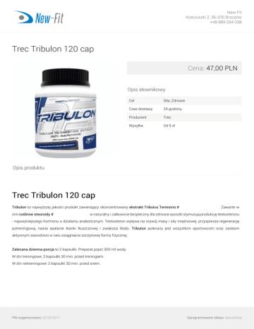 New-Fit Kościuszki 2, 36-200 Brzozów +48 889 334 038 Trec Tribulon 120 cap Cena: 47,00 PLN Opis słownikowy Cel Siła, Zdrowie Czas dostawy 24 godziny Producent Trec Wysyłka Od 5 zł Opis produktu Trec Tribulon 120 cap Tribulon to najwyższej jakości produkt zawierający skoncentrowany ekstrakt Tribulus Terrestris #℣佐⌡⌀戀甀稀搀礀最愀渀欀愀 稀椀攀洀渀攀最漀⌡⍃倣℣ nim roślinne steoroidy #℣佐⌡⌀猀愀瀀漀渀椀渀礀 猀琀攀爀漀椀搀漀眀攀⌡⍃倣℣ . Zawarte w w naturalny i całkowicie bezpieczny dla zdrowia sposób stymulują produkcję testosteronu - najważniejszego hormonu o działaniu anabolicznym. Testosteron wpływa na rozwój masy i siły mięśniowej, przyspiesza regenerację potreningową, nasila spalanie tkanki tłuszczowej i zwiększa libido. Tribulon polecany jest wszystkim sportowcom oraz osobom aktywnym zawodowo w celu osiągnięcia szczytowej formy fizycznej. Zalecana dzienna porcja to 2 kapsułki. Preparat popić 300 ml wody. W dni treningowe: 2 kapsułki 30 min. przed treningiem. W dni nietreningowe: 2 kapsułki 30 min. przed snem. Plik wygenerowano: 02-03-2017 Powered by TCPDF (www.tcpdf.org) Oprogramowanie sklepu: AptusShop