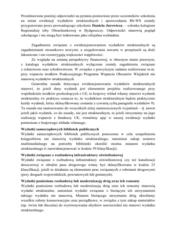 Przedstawione poniŜej odpowiedzi na pytania postawione przez uczestników szkolenia na temat ewidencji wydatków strukturalnych i sprawozdania Rb-WS zostały przygotowane przez prowadzącego szkolenie Daniela Jurewicza. – członka kolegium Regionalnej izby Obrachunkowej w Bydgoszczy. Odpowiedzi stanowią pogląd szkolącego i nie mogą być traktowane jako oficjalna wykładnia. Zagadnienia związane z ewidencjonowaniem wydatków strukturalnych są zagadnieniami stosunkowo nowymi, a uregulowania zawarte w przepisach są dość lakoniczne i nie rozstrzygają większości wątpliwości. Ze względu na zmianę perspektywy finansowej, w obecnym stanie prawnym, z katalogu wydatków strukturalnych wyłączone zostały zagadnienia związane z rolnictwem oraz rybołówstwem. W związku z powyŜszym zadania realizowane m.in. przy wsparciu środków Poakcesyjnego Programu Wsparcia Obszarów Wiejskich nie stanowią wydatków strukturalnych. Generalna zasada dotycząca ewidencjonowania wydatków strukturalnych stanowi, Ŝe jeŜeli dany wydatek jest elementem projektu realizowanego przy współudziale środków pochodzących z UE, to krajowy wkład własny stanowi wydatek strukturalny (w praktyce oznacza to, Ŝe wydatkiem strukturalnym będzie praktycznie kaŜdy wydatek, który sklasyfikowany zostanie z czwartą cyfrą paragrafu wydatków 9). Ta zasada ma zastosowanie do wszystkich niŜej zamieszczonych wyjaśnień – tj. nawet jeŜeli jakiś wydatek, co do zasady, nie jest strukturalnym, to jeŜeli otrzymamy na jego realizację wsparcie z funduszy UE, winniśmy ująć w naszej ewidencji wydatki poniesione z krajowego wkładu własnego. Wydatki samorządowych bibliotek publicznych Wydatki samorządowych bibliotek publicznych ponoszone w celu uzupełnienia księgozbioru nie stanowią wydatku strukturalnego, natomiast zakup zestawu multimedialnego na potrzeby biblioteki określić moŜna mianem wydatku strukturalnego (i zaewidencjonować w kodzie 59 klasyfikacji). Wydatki związane z rozbudową infrastruktury oświetleniowej Wydatki związane z rozbudową infrastruktury oświetleniowej czy teŜ kanalizacji deszczowej w obrębie pasa drogowego winny być sklasyfikowane w kodzie 23 klasyfikacji, jeŜeli te działania są elementem prac związanych z robotami drogowymi (przy drogach wojewódzkich, powiatowych lub gminnych). Wydatki poniesione rozbudowę lub modernizację dróg oraz ich remonty Wydatki poniesione rozbudowę lub modernizację dróg oraz ich remonty stanowią wydatki strukturalne, natomiast wydatki związane z bieŜącym ich utrzymaniem takiego wydatku nie stanowią. Mianem bieŜącego utrzymania dróg określamy wszelkie roboty konserwacyjne oraz porządkowe, w związku z tym zakup materiałów (np. Ŝwiru lub tłucznia) do wyrównywania ubytków nawierzchni nie stanowi wydatku strukturalnego. Wydatki na pomoc socjalną Zdecydowana większość wszelakich form pomocy socjalnej świadczonej np. przez ośrodki pomocy społecznej nie stanowi wydatków strukturalnych – z uwzględnieniem zasady, o której była mowa na początku. Wydatki na szkolenia Szkolenia obligatoryjne, które w bezpośredni sposób nie przyczyniają się do podnoszenia jakości działalności organów administracji samorządowej nie stanowią wydatków strukturalnych (np. szkolenie w zakresie bhp czy teŜ pierwszej pomocy lub ppoŜ.). Wydatki poniesione na realizację prac społecznie uŜytecznych Wydatki poniesione na realizację prac społecznie uŜytecznych stanowią wydatek strukturalny i winny być sklasyfikowane w kodzie 66 klasyfikacji. Wydatki poniesione na realizację prac społecznie uŜytecznych Wydatki poniesione na remont lub modernizację budynku, w którym siedzibę mają róŜne instytucje publiczne, w przypadku z trudnościami z przyporządkowaniem wydatków do konkretnej instytucji mogą być sklasyfikowane w kodzie 79 klasyfikacji. Wydatki pochodzące ze środków z tytułu wydawanych zezwoleń na sprzedaŜ napojów alkoholowych Fakt pochodzenia środków z konkretnego krajowego źródła finansowania nie musi ostatecznie decydować o zaliczeniu wydatku do katalogu wydatków strukturalnych – decyduje o tym cel dokonania wydatku. W związku z powyŜszym wydatki pochodzące ze środków z tytułu wydawanych zezwoleń na sprzedaŜ napojów alkoholowych uznane mogą być za strukturalne w zaleŜności od konkretnego ich przeznaczenia (np. zakup materiałów dydaktycznych do świetlic środowiskowych). Korekty sprawozdań Rb- WS Kwestie dokonywania ewentualnych korekt sprawozdań za lata poprzednie winny być dokonywane raz do roku – tj. po zakończeniu kolejnego roku budŜetowego (i przesyłane do Ministerstwa Finansów wraz ze sprawozdaniami za lata kolejne).