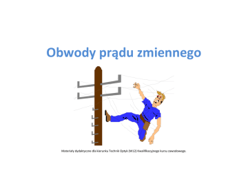 Obwody prądu zmiennego Materiały dydaktyczne dla kierunku Technik Optyk (W12) Kwalifikacyjnego kursu zawodowego. Kondensator: Kondensator magazynuje energię w polu elektrycznym. Składa się z dwu przewodników okładzin) rozdzielonych dielektrykiem (papier, folia, olej mineralny, szkło mika, powietrze itp.). Kondensator a) płaski, b) cylindryczny Ładunek, jaki możemy zgromadzić na okładzinach kondensatora wynosi: Jednostką pojemności kondensatora jest farad [F] Pojemność kondensatora zależy od jego wymiarów geometrycznych: C – pojemność d – odległość między okładzinami S – powierzchnia okładzin ε - przenikalność elektryczna środowiska Budowa kondensatora Pojemność kondensatorów łączonych szeregowo: Pojemność kondensatorów łączonych równolegle: Łączenie kondensatorów: a) szeregowe, b) równoległe Cewka indukcyjna: Strumień magnetyczny skojarzony z cewką: Indukcyjność własna cewki: Indukcyjność wzajemna cewek: Energia zgromadzona w cewce wyniesie: Prąd przemienny: częstotliwość: Prędkość kątowa (pulsacja): Wartością skuteczną prądu przemiennego nazywamy taką wartość prądu stałego, który płynąc przez ten sam rezystor spowoduje wydzielenie się takiej samej ilości ciepła , co płynący w tym samym czasie prąd przemienny. Udział elementów RLC w obwodzie prądu przemiennego: reaktancja pojemnościowa reaktancja indukcyjna Obwód RLC: Moc prądu sinusoidalnego: Moc czynna (wat [W]): Moc bierna [var]: S Q P Trójkąt mocy Obwody 3-fazowe: Wykres wektorowy napięć trójfazowych Przebiegi sinusoidalne trójfazowe !" # $ % &' &' ( &' ( && )& )& !" #$ "% Literatura: J. Nowicki „Podstawy elektrotechniki i elektroniki dla ZSN” WSiP Warszawa