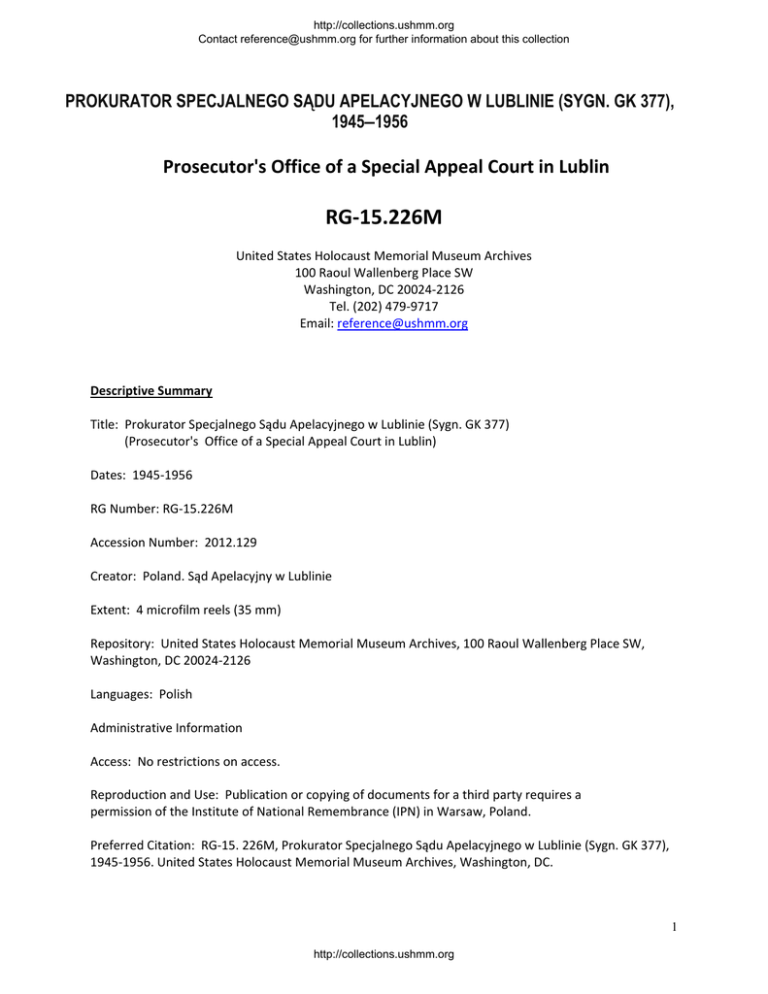 http://collections.ushmm.org Contact [email protected] for further information about this collection PROKURATOR SPECJALNEGO SĄDU APELACYJNEGO W LUBLINIE (SYGN. GK 377), 1945‒1956 Prosecutor's Office of a Special Appeal Court in Lublin RG‐15.226M United States Holocaust Memorial Museum Archives 100 Raoul Wallenberg Place SW Washington, DC 20024‐2126 Tel. (202) 479‐9717 Email: [email protected] Descriptive Summary Title: Prokurator Specjalnego Sądu Apelacyjnego w Lublinie (Sygn. GK 377) (Prosecutor's Office of a Special Appeal Court in Lublin) Dates: 1945‐1956 RG Number: RG‐15.226M Accession Number: 2012.129 Creator: Poland. Sąd Apelacyjny w Lublinie Extent: 4 microfilm reels (35 mm) Repository: United States Holocaust Memorial Museum Archives, 100 Raoul Wallenberg Place SW, Washington, DC 20024‐2126 Languages: Polish Administrative Information Access: No restrictions on access. Reproduction and Use: Publication or copying of documents for a third party requires a permission of the Institute of National Remembrance (IPN) in Warsaw, Poland. Preferred Citation: RG‐15. 226M, Prokurator Specjalnego Sądu Apelacyjnego w Lublinie (Sygn. GK 377), 1945‐1956. United States Holocaust Memorial Museum Archives, Washington, DC. 1 http://collections.ushmm.org http://collections.ushmm.org Contact [email protected] for further information about this collection Acquisition Information: Acquired through a cooperative project from the Instytut Pamięci Narodowej‐Komisja Ścigania Zbrodni przeciwko Narodowi Polskiemu (Syg. GK 377), Poland. Forms part of the Claims Conference International Holocaust Documentation Archive at the United States Holocaust Memorial Museum. This archive consists of documentation whose reproduction and/or acquisition was made possible with funding from the Conference on Jewish Material Claims against Germany. Accruals: Accruals may have been received since this collection was first processed, see the Archives catalog at collections.ushmm.org for further information. Custodial History Existence and location of originals: The original records are held by the Instytut Pamięci Narodowej ‐ Komisja Ścigania Zbrodni przeciwko Narodowi Polskiemu, ul. Towarowa 28, Warsaw, Poland 00‐839. Tel. 011 48 22 581 85 00. More information about this repository can be found at www.ipn.gov.pl. Processing History: Aleksandra B. Borecka Scope and Content of Collection The collection contains selected files of the prosecutor’s investigations from the Prosecutor’s Office of Special Appeal Court in Lublin during the years 1945‐1956. These investigations pertain to crimes committed against Jews and Poles by Germans and their collaborators during the German occupation. Most of the investigation was discontinued. These investigations were based on the decree of August 31, 1944 (“Sierpniówka”), issued by the Polski Komitet Wyzwolenia Narodowego (PKWN), concerning the punishment of German criminals guilty of murders and persecution of civilians and prisoners of war, and the punishment of traitors to the Polish Nation. “Sierpniówka” was one of the world's first legislation on liability for war crimes committed during World War II. This decree also applied to soldiers of the Home Army (Armia Krajowa), which the Communist propaganda in the 40’s and 50’s attempted to portray as German collaborators. System of Arrangement The system of arrangement of the source repository has been preserved in the microfilmed reels. Arrangement is numerical by the court files, and by names of defendants. Indexing Terms Polski Komitet Wyzwolenia Narodowego. Lublin (Poland). Sąd Apelacyjny‐‐Trials, litigation, etc. Lublin Trials, Lublin, Poland, 1945‐1950. War crime trials—Poland‐‐Lublin. War criminals‐‐Legal status, laws, etc. War victims‐‐Legal status, laws, etc.‐‐Poland. World War, 1939‐1945‐‐Atrocities‐‐Investigations. World War, 1939‐1945‐‐Collaborationists‐‐Poland. Communism‐‐Poland‐‐History‐‐20th century. 2 http://collections.ushmm.org http://collections.ushmm.org Contact [email protected] for further information about this collection Lublin (Poland)‐‐History‐‐20th century. Województwo Lubelskie (Poland)‐‐History‐‐Occupation, 1941‐1944. Trials. Reports. Protocols. CONTAINER LIST Polish File numbers: 2, 3, 4, 6, 7, 9 t. 1‐2, 11 t. 1‐2, 12 t. 1‐2, 17 t. 1‐3, 18 t. 1‐3, 22 t. 1‐2, 27 t. 1‐2, 30 t. 1‐2, 39, 46, 48, 50, 53 t. 1‐2, 56 t. 1‐2, 60 t. 1‐2, 61, 63, 69, 70, 73, 74, 78, 88, 90 t. 1‐2, 92, 93, 98 t. 1‐2, 102, 105 t. 1‐2, 107, 112 t. 1‐2, 113, 114, 117 Reel 1 File Description Sygn. GK 377/2 Sygn. GK 377/3 Sygn. GK377/4 Tylus Bronisław, podczas okupacji sołtys w Wierzchowiskach, pow. Kraśnik, na podstawie doniesienia podejrzany o wydanie Niemcom rannego Żyda który się u niego ukrył, w wyniku czego ten został rozstrzelany. Świadek Rudnicki Henryk zeznał, że syn szewca z tej gromady, Zysa Milera, jesienią 1943r. podczas wysiedleń do getta w Zaklikowie „poszedł do bandy Kiełbasy wraz z innemi Żydkami. Kiełbasy Żydków tych wybili, a syn Zysa zdołał zbiec i ukrywał się ..” /k. 12/. Świadek Wielgus Jan zeznał, że syn szewca (Ankiel lub Jankiel Zys) poszedł do partyzantki /k. 17/. Wg sprawozdania (podpis nieczytelny) podejrzany złapał „jednego żydka” ale oddał go w ręce szpicla niemieckiego Kowalika Dominika /k 15/. Świadkowie zeznają że szewc prawdopodobnie zostawił warsztat Tylusowi, ale czy skóry też tego nie wiedzą. Umorzone z braku dowodów winy. 1949, K 42 Steć Antoni podejrzany o to że podczas okupacji jako sekretarz gminy Tuchowicz pow. łukowskiego działał na szkodę ludności polskiej poprzez niesprawiedliwe rozdzielanie kontyngentów. Na świadków swojego dobrego sprawowania podejrzany wezwał m.in. Moszka Apelbauma i Pienię Fiksmana. Fiksman zeznał, że podczas okupacji ukrywał się a podejrzany wiedział o tym i go n