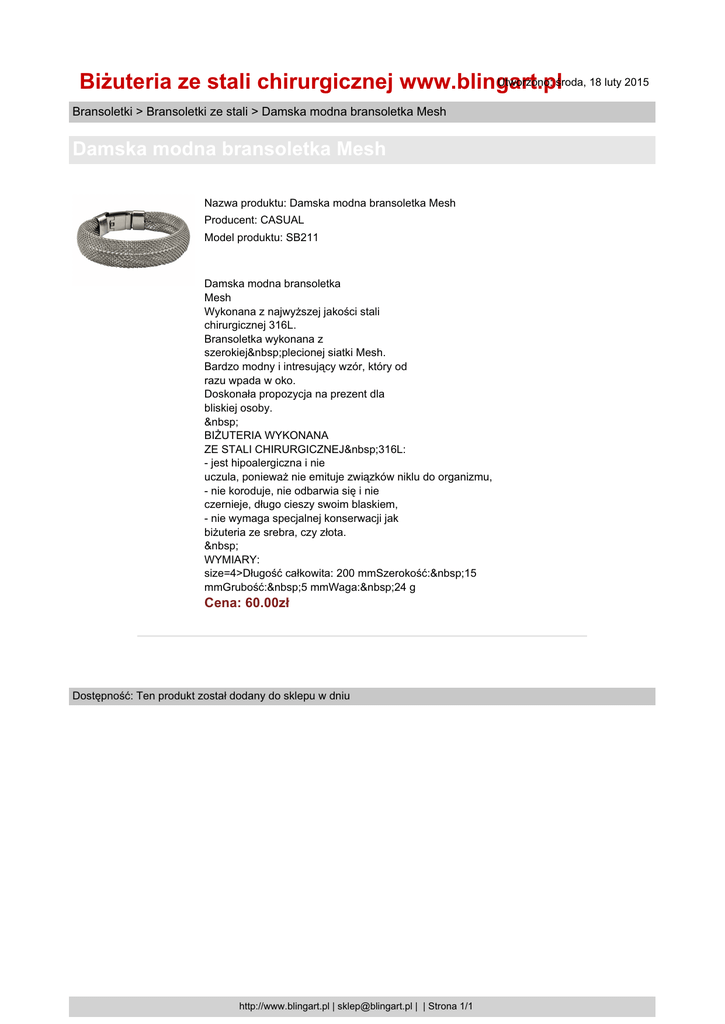 Utworzono: środa, 18 luty 2015 Biżuteria ze stali chirurgicznej www.blingart.pl Bransoletki > Bransoletki ze stali > Damska modna bransoletka Mesh Damska modna bransoletka Mesh Nazwa produktu: Damska modna bransoletka Mesh Producent: CASUAL Model produktu: SB211 Damska modna bransoletka Mesh Wykonana z najwyższej jakości stali chirurgicznej 316L. Bransoletka wykonana z szerokiej plecionej siatki Mesh. Bardzo modny i intresujący wzór, który od razu wpada w oko. Doskonała propozycja na prezent dla bliskiej osoby. BIŻUTERIA WYKONANA ZE STALI CHIRURGICZNEJ 316L: - jest hipoalergiczna i nie uczula, ponieważ nie emituje związków niklu do organizmu, - nie koroduje, nie odbarwia się i nie czernieje, długo cieszy swoim blaskiem, - nie wymaga specjalnej konserwacji jak biżuteria ze srebra, czy złota. WYMIARY: size=4>Długość całkowita: 200 mmSzerokość: 15 mmGrubość: 5 mmWaga: 24 g Cena: 60.00zł Dostępność: Ten produkt został dodany do sklepu w dniu http://www.blingart.pl | [email protected] | | Strona 1/1