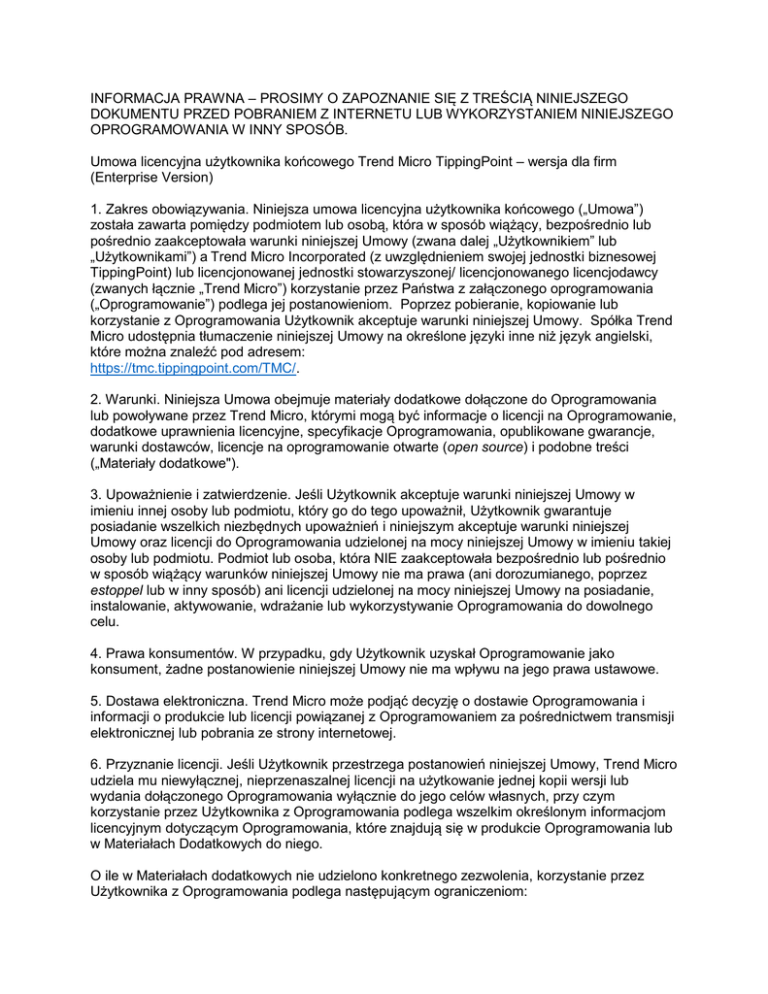 INFORMACJA PRAWNA – PROSIMY O ZAPOZNANIE SIĘ Z TREŚCIĄ NINIEJSZEGO DOKUMENTU PRZED POBRANIEM Z INTERNETU LUB WYKORZYSTANIEM NINIEJSZEGO OPROGRAMOWANIA W INNY SPOSÓB. Umowa licencyjna użytkownika końcowego Trend Micro TippingPoint – wersja dla firm (Enterprise Version) 1. Zakres obowiązywania. Niniejsza umowa licencyjna użytkownika końcowego („Umowa”) została zawarta pomiędzy podmiotem lub osobą, która w sposób wiążący, bezpośrednio lub pośrednio zaakceptowała warunki niniejszej Umowy (zwana dalej „Użytkownikiem” lub „Użytkownikami”) a Trend Micro Incorporated (z uwzględnieniem swojej jednostki biznesowej TippingPoint) lub licencjonowanej jednostki stowarzyszonej/ licencjonowanego licencjodawcy (zwanych łącznie „Trend Micro”) korzystanie przez Państwa z załączonego oprogramowania („Oprogramowanie”) podlega jej postanowieniom. Poprzez pobieranie, kopiowanie lub korzystanie z Oprogramowania Użytkownik akceptuje warunki niniejszej Umowy. Spółka Trend Micro udostępnia tłumaczenie niniejszej Umowy na określone języki inne niż język angielski, które można znaleźć pod adresem: https://tmc.tippingpoint.com/TMC/. 2. Warunki. Niniejsza Umowa obejmuje materiały dodatkowe dołączone do Oprogramowania lub powoływane przez Trend Micro, którymi mogą być informacje o licencji na Oprogramowanie, dodatkowe uprawnienia licencyjne, specyfikacje Oprogramowania, opublikowane gwarancje, warunki dostawców, licencje na oprogramowanie otwarte (open source) i podobne treści („Materiały dodatkowe"). 3. Upoważnienie i zatwierdzenie. Jeśli Użytkownik akceptuje warunki niniejszej Umowy w imieniu innej osoby lub podmiotu, który go do tego upoważnił, Użytkownik gwarantuje posiadanie wszelkich niezbędnych upoważnień i niniejszym akceptuje warunki niniejszej Umowy oraz licencji do Oprogramowania udzielonej na mocy niniejszej Umowy w imieniu takiej osoby lub podmiotu. Podmiot lub osoba, która NIE zaakceptowała bezpośrednio lub pośrednio w sposób wiążący warunków niniejszej Umowy nie ma prawa (ani dorozumianego, poprzez estoppel lub w inny sposób) ani licencji udzielonej na mocy niniejszej Umowy na posiadanie, instalowanie, aktywowanie, wdrażanie lub wykorzystywanie Oprogramowania do dowolnego celu. 4. Prawa konsumentów. W przypadku, gdy Użytkownik uzyskał Oprogramowanie jako konsument, żadne postanowienie niniejszej Umowy nie ma wpływu na jego prawa ustawowe. 5. Dostawa elektroniczna. Trend Micro może podjąć decyzję o dostawie Oprogramowania i informacji o produkcie lub licencji powiązanej z Oprogramowaniem za pośrednictwem transmisji elektronicznej lub pobrania ze strony internetowej. 6. Przyznanie licencji. Jeśli Użytkownik przestrzega postanowień niniejszej Umowy, Trend Micro udziela mu niewyłącznej, nieprzenaszalnej licencji na użytkowanie jednej kopii wersji lub wydania dołączonego Oprogramowania wyłącznie do jego celów własnych, przy czym korzystanie przez Użytkownika z Oprogramowania podlega wszelkim określonym informacjom licencyjnym dotyczącym Oprogramowania, które znajdują się w produkcie Oprogramowania lub w Materiałach Dodatkowych do niego. O ile w Materiałach dodatkowych nie udzielono konkretnego zezwolenia, korzystanie przez Użytkownika z Oprogramowania podlega następującym ograniczeniom: a. Użytkownik nie może korzystać z Oprogramowania w celu świadczenia usług na rzecz podmiotów zewnętrznych/ osób trzecich. b. Użytkownik nie może sporządzać kopii, ani rozpowszechniać, odsprzedawać ani udzielać dalszych licencji na Oprogramowania podmiotom zewnętrznym/ osobom trzecim. c. Użytkownik nie może pobierać ani korzystać z poprawek („łatek”), udoskonaleń, programów służących do usuwania błędów lub podobnych aktualizacji, chyba, że posiada licencję na Oprogramowanie bazowe. Jednakże taka licencja nie daje Użytkownikowi w sposób automatyczny prawa do otrzymywania tychże aktualizacji, a Trend Micro zastrzega sobie prawo do udostępniania takich aktualizacji wyłącznie klientom, którzy posiadają umowę o świadczenie pomocy technicznej. d. Użytkownik nie może kopiować Oprogramowania, ani udostępniać go w publicznej lub zewnętrznej sieci rozproszonej. e. Użytkownik nie może zezwalać na dostęp do oprogramowania w sieci Intranet, chyba, że jest on ograniczony do uprawnionych użytkowników. f. Użytkownik może sporządzić jedną kopię Oprogramowania do celów archiwizacji lub gdy stanowi to niezbędny etap w ramach uprawnionego użytkowania. g. Użytkownik nie może dokonywać modyfikacji, odtwarzać kodu źródłowego [reverse engineer], dezasemblować, odkodowywać, dekompilować lub tworzyć prac pochodnych oprogramowania. W przypadku gdy Użytkownik dysponuje obligatoryjnym prawem do takiej modyfikacji na mocy ustawy, musi poinformować Trend Micro w formie pisemnej o takich modyfikacjach. 7. Monitorowanie zdalne. Niektóre Oprogramowanie może wymagać kluczy lub innych zabezpieczeń technicznych, a Trend Micro może zdalnie lub w inny sposób monitorować przestrzeganie przez Użytkownika postanowień niniejszej Umowy. W przypadku gdy Trend Micro przygotuje program zarządzania licencjami służący do zapisywania i raportowania informacji na temat wykorzystania licencji, Użytkownik zacznie używać takiego programu nie później niż 180 dni od daty jego udostępnienia. 8. Prawo własności. Na mocy niniejszej Umowy nie nastąpi przeniesienie żadnych praw własności intelektualnej. 9. Informacje o prawach autorskich. Użytkownik zobowiązany jest powielić informacje o prawach autorskich na autoryzowanych kopiach Oprogramowania i dokumentacji. 10. Systemy operacyjne. Oprogramowanie systemów operacyjnych może być używane wyłącznie na zatwierdzonym sprzęcie i w zatwierdzonych konfiguracjach. 11. 90-dniowa ograniczona gwarancja na Oprogramowanie Trend Micro. a. Oprogramowanie oznaczone marką Trend Micro zasadniczo jest zgodne