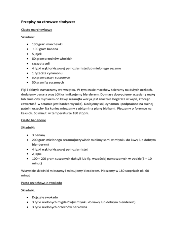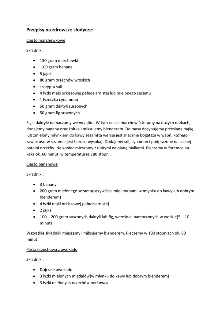 Przepisy na zdrowsze słodycze: Ciasto marchewkowe Składniki: 130 gram marchewki 100 gram banana 5 jajek 80 gram orzechów włoskich szczypta soli 4 łyżki mąki orkiszowej pełnoziarnistej lub mielonego sezamu 1 łyżeczka cynamonu 50 gram daktyli suszonych 50 gram fig suszonych Figi i daktyle namaczamy we wrzątku. W tym czasie marchew ścieramy na dużych oczkach, dodajemy banana oraz żółtka i miksujemy blenderem. Do masy dosypujemy przesianą mąkę lub zmielony młynkiem do kawy sezam(ta wersja jest znacznie bogatsza w wapń, którego zawartość w sezamie jest bardzo wysoka). Dodajemy sól, cynamon i podprażone na suchej patelni orzechy. Na koniec mieszamy z ubitymi na pianę białkami. Pieczemy w foremce na keks ok. 60 minut w temperaturze 180 stopni. Ciasto bananowe Składniki: 3 banany 200 gram mielonego sezamu(oczywiście mielimy sami w młynku do kawy lub dobrym blenderem) 4 łyżki mąki orkiszowej pełnoziarnistej 2 jajka 100 – 200 gram suszonych daktyli lub fig, wcześniej namoczonych w wodzie(5 – 10 minut) Wszystkie składniki mieszamy i miksujemy blenderem. Pieczemy w 180 stopniach ok. 60 minut Pasta orzechowa z awokado Składniki: Dojrzałe awokado 3 łyżki mielonych migdałów(w młynku do kawy lub dobrym blenderem) 3 łyżki mielonych orzechów nerkowca 2 -3 łyżki Tahini(pasta z prażonego sezamu, najlepsza jest domowej roboty) Opcjonalnie można dosłodzić do smaku xylitolem/miodem lub bananem Wszystkie składniki mieszamy i miksujemy blenderem na gładki krem. Można podawać w miseczkach jako mus, lub na pieczywie.