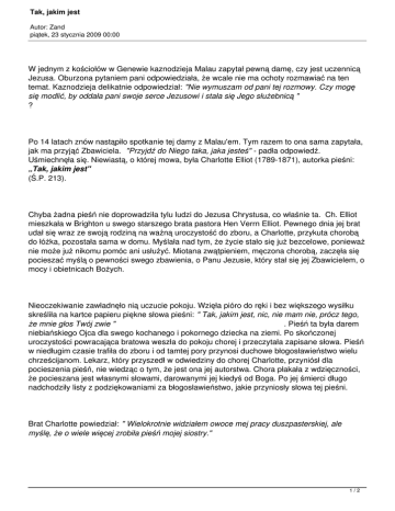 Tak, jakim jest Autor: Zand piątek, 23 stycznia 2009 00:00 W jednym z kościołów w Genewie kaznodzieja Malau zapytał pewną damę, czy jest uczennicą Jezusa. Oburzona pytaniem pani odpowiedziała, że wcale nie ma ochoty rozmawiać na ten temat. Kaznodzieja delikatnie odpowiedział: "Nie wymuszam od pani tej rozmowy. Czy mogę się modlić, by oddała pani swoje serce Jezusowi i stała się Jego służebnicą " ? Po 14 latach znów nastąpiło spotkanie tej damy z Malau'em. Tym razem to ona sama zapytała, jak ma przyjąć Zbawiciela. "Przyjdź do Niego taka, jaka jesteś" - padła odpowiedź. Uśmiechnęła się. Niewiastą, o której mowa, była Charlotte Elliot (1789-1871), autorka pieśni: „Tak, jakim jest" (Ś.P. 213). Chyba żadna pieśń nie doprowadziła tylu ludzi do Jezusa Chrystusa, co właśnie ta. Ch. Elliot mieszkała w Brighton u swego starszego brata pastora Hen Verrn Elliot. Pewnego dnia jej brat udał się wraz ze swoją rodziną na ważną uroczystość do zboru, a Charlotte, przykuta chorobą do łóżka, pozostała sama w domu. Myślała nad tym, że życie stało się już bezcelowe, ponieważ nie może już nikomu pomóc ani usłużyć. Miotana zwątpieniem, męczona chorobą, zaczęła się pocieszać myślą o pewności swego zbawienia, o Panu Jezusie, który stał się jej Zbawicielem, o mocy i obietnicach Bożych. Nieoczekiwanie zawładnęło nią uczucie pokoju. Wzięła pióro do ręki i bez większego wysiłku skreśliła na kartce papieru piękne słowa pieśni: " Tak, jakim jest, nic, nie mam nie, prócz tego, że mnie głos Twój zwie " . Pieśń ta była darem niebiańskiego Ojca dla swego kochanego i pokornego dziecka na ziemi. Po skończonej uroczystości powracająca bratowa weszła do pokoju chorej i przeczytała zapisane słowa. Pieśń w niedługim czasie trafiła do zboru i od tamtej pory przynosi duchowe błogosławieństwo wielu chrześcijanom. Lekarz, który przyszedł w odwiedziny do chorej Charlotte, przyniósł dla pocieszenia pieśń, nie wiedząc o tym, że jest ona jej autorstwa. Chora płakała z wdzięczności, że pocieszana jest własnymi słowami, darowanymi jej kiedyś od Boga. Po jej śmierci długo nadchodziły listy z podziękowaniami za błogosławieństwo, jakie przyniosły słowa tej pieśni. Brat Charlotte powiedział: " Wielokrotnie widziałem owoce mej pracy duszpasterskiej, ale myślę, że o wiele więcej zrobiła pieśń mojej siostry." 1/2 Tak, jakim jest Autor: Zand piątek, 23 stycznia 2009 00:00 Na podstawie Bekannte Lieder- wie sie entstanden, Wolfgang Heiner, Haensler Verlag, Neuhausen- Stuttgart, 5 Auflage 1995 str. 519 2/2
