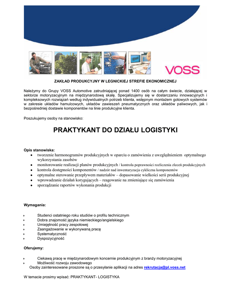ZAKŁAD PRODUKCYJNY W LEGNICKIEJ STREFIE EKONOMICZNEJ Należymy do Grupy VOSS Automotive zatrudniającej ponad 1400 osób na całym świecie, działającej w sektorze motoryzacyjnym na międzynarodową skalę. Specjalizujemy się w dostarczaniu innowacyjnych i kompleksowych rozwiązań według indywidualnych potrzeb klienta, wstępnym montażem gotowych systemów w zakresie układów hamulcowych, układów zawieszeń pneumatycznych oraz układów paliwowych, jak i bezpośredniej dostawie komponentów na linie produkcyjne klienta. Poszukujemy osoby na stanowisko: PRAKTYKANT DO DZIAŁU LOGISTYKI Opis stanowiska: tworzenie harmonogramów produkcyjnych w oparciu o zamówienia z uwzględnieniem optymalnego wykorzystania zasobów monitorowanie realizacji planów produkcyjnych / kontrola poprawności rozliczenia zleceń produkcyjnych kontrola dostępności komponentów / nadzór nad inwentaryzacja cykliczna komponentów optymalne sterowanie przepływem materiałów – dopasowanie wielkości serii produkcyjnej wprowadzanie działań korygujących – reagowanie na zmieniające się zamówienia sporządzanie raportów wykonania produkcji Wymagania: Studenci ostatniego roku studiów o profilu technicznym Dobra znajomość języka niemieckiego/angielskiego Umiejętność pracy zespołowej Zaangażowanie w wykonywaną pracę Systematyczność Dyspozycyjność Oferujemy: Ciekawą pracę w międzynarodowym koncernie produkcyjnym z branży motoryzacyjnej Możliwość rozwoju zawodowego Osoby zainteresowane proszone są o przesyłanie aplikacji na adres [email protected] W temacie prosimy wpisać: PRAKTYKANT- LOGISTYKA ZAKŁAD PRODUKCYJNY W LEGNICKIEJ STREFIE EKONOMICZNEJ Należymy do Grupy VOSS Automotive zatrudniającej ponad 1400 osób na całym świecie, działającej w sektorze motoryzacyjnym na międzynarodową skalę. Specjalizujemy się w dostarczaniu innowacyjnych i kompleksowych rozwiązań według indywidualnych potrzeb klienta, wstępnym montażem gotowych systemów w zakresie układów hamulcowych, układów zawieszeń pneumatycznych oraz układów paliwowych, jak i bezpośredniej dostawie komponentów na linie produkcyjne klienta. Poszukujemy osoby na stanowisko: PRAKTYKANT DO DZIAŁU PRZYGOTOWANIA PRODUKCJI Opis stanowiska: Planowanie oraz optymalizacja wszelkich procesów produkcyjnych Samodzielne prowadzenie projektów, Analiza i optymalizacja procesów produkcyjnych, Nadzór i rozbudowa oprzyrządowania stanowisk pracy Przygotowanie dokumentacji do zakupu maszyn i urządzeń, Wybór i zakup maszyn, urządzeń, narzędzi do produkcji, Nadzór nad parametrami maszyn i urządzeń do produkcji seryjnej, Weryfikacja i nadzór nad dokumentacją techniczną Koordynacja projektów między centralą a Zakładem w Polsce Wymagania: Studenci ostatniego roku studiów o profilu technicznym Dobra znajomość języka niemieckiego/angielskiego Umiejętność pracy zespołowej Zaangażowanie w wykonywaną pracę Systematyczność Dyspozycyjność Oferujemy: Ciekawą pracę w międzynarodowym koncernie produkcyjnym z branży motoryzacyjnej Możliwość rozwoju zawodowego Osoby zainteresowane proszone są o przesyłanie aplikacji na adres [email protected] W temacie prosimy wpisać: PRAKTYKANT- AV ZAKŁAD PRODUKCYJNY W LEGNICKIEJ STREFIE EKONOMICZNEJ Należymy do Grupy VOSS Automotive zatrudniającej ponad 1400 osób na całym świecie, działającej w sektorze motoryzacyjnym na międzynarodową skalę. Specjalizujemy się w dostarczaniu innowacyjnych i kompleksowych rozwiązań według indywidualnych potrzeb klienta, wstępnym montażem gotowych systemów w zakresie układów hamulcowych, układów zawieszeń pneumatycznych oraz układów paliwowych, jak i bezpośredniej dostawie komponentów na linie produkcyjne klienta. Poszukujemy osoby na stanowisko: PRAKTYKANT DO DZIAŁU ZAKUPÓW Opis stanowiska: - sporządzanie zamówień, - kontrola terminów realizacji, - wyjaśnianie różnic przy kontroli rachunków, - realizacja procesu zakupów przez system SAP, - zarządzanie już istniejącymi danymi w SAP, - przyjmowanie i weryfikacja zapotrzebowań, Wymagania: Studenci ostatniego roku studiów o profilu technicznym Dobra znajomość języka niemieckiego/angielskiego Umiejętność pracy zespołowej Zaangażowanie w wykonywaną pracę Systematyczność Dyspozycyjność Oferujemy: Ciekawą pracę w międzynarodowym koncernie produkcyjnym z branży motoryzacyjnej Możliwość rozwoju zawodowego Osoby zainteresowane proszone są o przesyłanie aplikacji na adres [email protected] W temacie prosimy wpisać: PRAKTYKANT- ZAKUPY ZAKŁAD PRODUKCYJNY W LEGNICKIEJ STREFIE EKONOMICZNEJ Należymy do Grupy VOSS Automotive zatrudniającej ponad 1400 osób na całym świecie, działającej w sektorze motoryzacyjnym na międzynarodową skalę. Specjalizujemy się w dostarczaniu innowacyjnych i kompleksowych rozwiązań według indywidualnych potrzeb klienta, wstępnym montażem gotowych systemów w zakresie układów hamulcowych, układów zawieszeń pneumatycznych oraz układów paliwowych, jak i bezpośredniej dostawie komponentów na linie produkcyjne klienta. Poszukujemy osoby na stanowisko: PRAKTYKANT DO DZIAŁU IT Opis stanowiska: Zapewnienie wsparcia HELPDESK, Konfiguracja oraz Serwisowanie komputerów PC/TC oraz urządzeń peryferyjnych, Rozwiązywanie problemów lub ich eskalacja na wyższy poziom, Bieżące dokumentowanie przebiegu realizowanych procesów. Wymagania: Otwartość na zdobywanie wiedzy, Odporność na stres i pracę pod presją czasu , Wysoko rozwinięte umiejętności interpersonalne w tym komunikatywność i praca zespołowa, Ogólna znajomość charakterystyki środowiska IT pozwalająca na diagnozowanie problemów ze sprzętem i oprogramowaniem, Znajomość środowiska MS OFFICE w zakresie wsparcia użytkowników, Mile widziane zainteresowanie branżą IT Dobra znajomość języka angielskiego lub niemieckiego Oferujemy: Ciekawą pracę w międzynarodowym koncernie produkcyjnym z branży moto