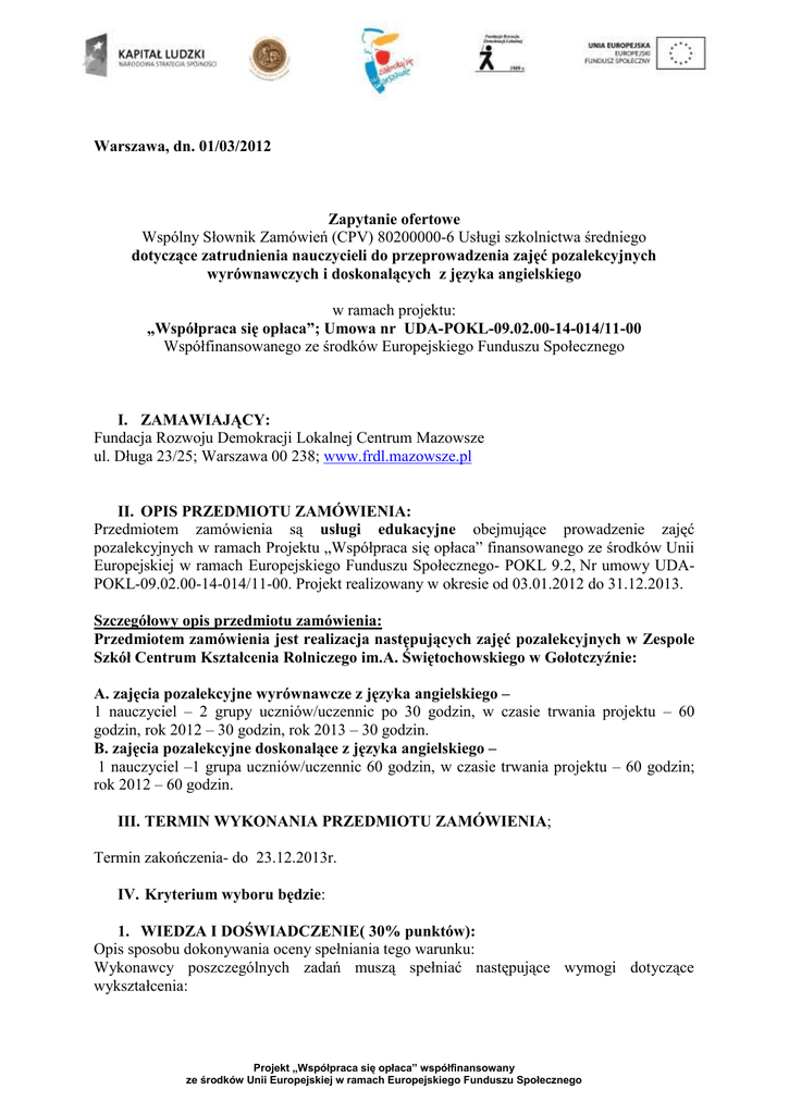 Warszawa, dn. 01/03/2012 Zapytanie ofertowe Wspólny Słownik Zamówień (CPV) 80200000-6 Usługi szkolnictwa średniego dotyczące zatrudnienia nauczycieli do przeprowadzenia zajęć pozalekcyjnych wyrównawczych i doskonalących z języka angielskiego w ramach projektu: „Współpraca się opłaca”; Umowa nr UDA-POKL-09.02.00-14-014/11-00 Współfinansowanego ze środków Europejskiego Funduszu Społecznego I. ZAMAWIAJĄCY: Fundacja Rozwoju Demokracji Lokalnej Centrum Mazowsze ul. Długa 23/25; Warszawa 00 238; www.frdl.mazowsze.pl II. OPIS PRZEDMIOTU ZAMÓWIENIA: Przedmiotem zamówienia są usługi edukacyjne obejmujące prowadzenie zajęć pozalekcyjnych w ramach Projektu „Współpraca się opłaca” finansowanego ze środków Unii Europejskiej w ramach Europejskiego Funduszu Społecznego- POKL 9.2, Nr umowy UDAPOKL-09.02.00-14-014/11-00. Projekt realizowany w okresie od 03.01.2012 do 31.12.2013. Szczegółowy opis przedmiotu zamówienia: Przedmiotem zamówienia jest realizacja następujących zajęć pozalekcyjnych w Zespole Szkół Centrum Kształcenia Rolniczego im.A. Świętochowskiego w Gołotczyźnie: A. zajęcia pozalekcyjne wyrównawcze z języka angielskiego – 1 nauczyciel – 2 grupy uczniów/uczennic po 30 godzin, w czasie trwania projektu – 60 godzin, rok 2012 – 30 godzin, rok 2013 – 30 godzin. B. zajęcia pozalekcyjne doskonalące z języka angielskiego – 1 nauczyciel –1 grupa uczniów/uczennic 60 godzin, w czasie trwania projektu – 60 godzin; rok 2012 – 60 godzin. III. TERMIN WYKONANIA PRZEDMIOTU ZAMÓWIENIA; Termin zakończenia- do 23.12.2013r. IV. Kryterium wyboru będzie: 1. WIEDZA I DOŚWIADCZENIE( 30% punktów): Opis sposobu dokonywania oceny spełniania tego warunku: Wykonawcy poszczególnych zadań muszą spełniać następujące wymogi dotyczące wykształcenia: Projekt „Współpraca się opłaca” współfinansowany ze środków Unii Europejskiej w ramach Europejskiego Funduszu Społecznego zajęcia pozalekcyjne wyrównawcze z języka angielskiego: wykonawca usługi powinien posiadać stopień awansu zawodowego minimum nauczyciela kontraktowego, wykształcenie wyższe kierunkowe z przygotowaniem pedagogicznym, doświadczenie w pracy z uczniami szkół zawodowych w tym rolniczych. zajęcia pozalekcyjne doskonalące z języka angielskiego: wykonawca usługi powinien posiadać stopień awansu zawodowego minimum nauczyciela kontraktowego, wykształcenie wyższe kierunkowe z przygotowaniem pedagogicznym, doświadczenie w pracy z uczniami szkół zawodowych w tym rolniczych. 2. CENA (70% punktów) V. OPIS SPOSOBU PRZYGOTOWANIA OFERTY: Oferent powinien złożyć ofertę na formularzu załączonym do niniejszego zapytania. Oferta: powinna zawierać proponowaną stawkę brutto za 1 jednostkę lekcyjną przeprowadzenia zajęć danego typu, powinna zawiera kserokopię dokumentów potwierdzających wykształcenie i kwalifikacje do prowadzenia danego typu zajęć, CV oferenta, zostać dostarczona w formie elektronicznej lub papierowej; opatrzona adnotacją „oferta na przeprowadzenie zajęć z język angielskiego” projekt „Współpraca się opłaca”. VI. MIEJSCE, SPOSÓB I TERMIN SKŁADANIA OFERT: Proszę o przesłanie oferty z terminie do 15 marca 2012 r. do godziny 14-tej na adres mail: [email protected], lub papierowo (decyduje data stempla pocztowego) na adres: Małgorzata Brojanowska; Fundacja Rozwoju Demokracji Lokalnej Centrum Mazowsze, ul. Długa 23/25, 00-238 Warszawa. W przypadku ofert papierowych należy poinformować Zamawiającego mailowo lub telefonicznie o wysłaniu. Oferty złożone po terminie nie będą rozpatrywane. Oferty złożone na innych drukach niż załączone do niniejszego zapytania ofertowego nie będą rozpatrywane. Dodatkowych informacji udziela Małgorzata Brojanowska: telefon+22 351 93 11, lub e-mail: [email protected] VII. ZAŁĄCZNIKI: 1. Formularz ofertowy Projekt „Współpraca się opłaca” współfinansowany ze środków Unii Europejskiej w ramach Europejskiego Funduszu Społecznego ........................................ Miejscowość i data ........................................ Nazwa i adres Oferenta .......................................... NIP, REGON Fundacja Rozwoju Demokracji Lokalnej Centrum Mazowsze Ul. Długa 23/25; Warszawa 00 238 Formularz ofertowy W odpowiedzi na Zaproszenie do złożenia oferty cenowej z dnia 01/03/2012 roku dotyczące prowadzenia zajęć pozalekcyjnych z język aangielskiego w ramach Projektu „Współpraca się opłaca” finansowanego ze środków Unii Europejskiej w ramach Europejskiego Funduszu Społecznego- POKL 9.2, Nr umowy UDA-POKL-09.02.00-14-014/11-00. Ja niżej podpisany/podpisana składam niniejszą ofertę na prowadzenie zajęć pozalekcyjnych: Rodzaj zajęć Oferowana cena brutto za 1 jednostkę lekcyjną Zajęcia pozalekcyjne wyrównawcze z języka angielskiego Zajęcia pozalekcyjne doskonalące z języka angielskiego Do zgłoszenia dołączam kserokopię dokumentów poświadczających kwalifikacje do prowadzenia zajęć w ramach projektu oraz CV. Oświadczam, że korzystam z pełni praw publicznych i posiadam pełną zdolność do czynności prawnych oraz nie byłem karany/byłam karana za przestępstwa popełnione umyślnie. Oświadczam, że wyrażam zgodę na przetwarzanie danych osobowych w ramach realizacji Projektu „Współpraca się opłaca”. .............................................................. Czytelny podpis Osoby Upoważnionej Projekt „Współpraca się opłaca” współfinansowany ze środków Unii Europejskiej w ramach Europejskiego Funduszu Społecznego Szczegółowe kryteria oceny złożonych ofert dotyczące zatrudnienia nauczycieli do przeprowadzenia zajęć pozalekcyjnych wyrównawczych i doskonalących z języka angielskiego w ramach projektu: „Współpraca się opłaca”; nt umowy UDA-POKL-09.02.00-14-014/11-00 Współfinansowanego ze środków Europejskiego Funduszu Społecznego I Wiedza i doświadczenie - 30% 