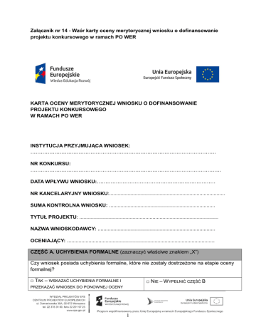 Załącznik nr 14 - Wzór karty oceny merytorycznej wniosku o dofinansowanie projektu konkursowego w ramach PO WER KARTA OCENY MERYTORYCZNEJ WNIOSKU O DOFINANSOWANIE PROJEKTU KONKURSOWEGO W RAMACH PO WER INSTYTUCJA PRZYJMUJĄCA WNIOSEK: ……………………………………………………………………………………………… NR KONKURSU: ………………………………………………………………………………………………… DATA WPŁYWU WNIOSKU:…………………………………………………………… NR KANCELARYJNY WNIOSKU:................................................................................. SUMA KONTROLNA WNIOSKU: .......................................................................... TYTUŁ PROJEKTU: ................................................................................................. NAZWA WNIOSKODAWCY: .................................................................................. OCENIAJĄCY: ....................................................................................................... CZĘŚĆ A. UCHYBIENIA FORMALNE (zaznaczyć właściwe znakiem „X”) Czy wniosek posiada uchybienia formalne, które nie zostały dostrzeżone na etapie oceny formalnej? □ TAK – WSKAZAĆ UCHYBIENIA FORMALNE I □ NIE – W YPEŁNIĆ CZĘŚĆ B PRZEKAZAĆ WNIOSEK DO PONOWNEJ OCENY 1 FORMALNEJ UCHYBIENIA FORMALNE CZĘŚĆ B. KRYTERIA DOSTĘPU (zaznaczyć właściwe znakiem „X”) KRYTERIA DOSTĘPU OCENIANE NA ETAPIE OCENY MERYTORYCZNEJ (wypełnia IOK zgodnie z zapisami właściwego Rocznego Planu Działania): KRYTERIA DOSTĘPU: 1. W projekcie wykorzystywane są przynajmniej dwa rodzaje działań współpracy ponadnarodowej spośród następujących: • wypracowanie nowych rozwiązań we współpracy z partnerem zagranicznym i ich wdrożenie; • transfer nowych rozwiązań i ich zaadaptowanie oraz wdrożenie; • równoległe tworzenie nowych rozwiązań i ich wdrożenie; • wymiana informacji i doświadczeń, w tym obowiązkowo jednym z nich jest wymiana informacji i doświadczeń. Definicja nowego rozwiązania zostanie doprecyzowana w Regulaminie konkursu. Nowe rozwiązanie to produkt projektu współpracy ponadnarodowej, wypracowany we współpracy z co najmniej jednym partnerem ponadnarodowym, który w całości, części lub w określonej formie nie występuje dotychczas w Polsce. 2. Wniosek o dofinansowanie zawiera koncepcję/ opis wdrożenia rozwiązania wypracowanego we współpracy ponadnarodowej do praktyki, w tym po zakończeniu realizacji projektu. 3. Wniosek o dofinansowanie projektu jest składany w partnerstwie ponadnarodowym i przewiduje funkcjonowanie sieci współpracy, co oznacza, że: • na etapie składania wniosku w odpowiedzi na konkurs podpisany jest list intencyjny, będący załącznikiem do wniosku, a dane partnera ponadnarodowego i zadania 2 zaplanowane we współpracy ponadnarodowej są wpisane we wniosku o dofinansowanie projektu, • cele, produkty i rezultaty projektu muszą być powiązane ze współpracą ponadnarodową i pokazywać wartość dodaną takiej współpracy, • wskazane zostało uzasadnienie dla wykorzystania współpracy ponadnarodowej dla osiągnięcia celu projektu, • po wybraniu projektu do dofinansowania – przed zawarciem umowy o dofinansowanie – zostanie podpisana umowa o współpracy ponadnarodowej, • jest realizowany przez instytucje działające w zbliżonych obszarach tematycznych, i udzielające sobie wsparcia w celu poprawy efektywności realizacji działań na rzecz rozwiązywania wspólnych problemów i/lub w celu usprawnienia i poprawy jakości funkcjonowania danej/ych instytucji, • nie zawiera fazy testowania wypracowanego/zaadaptowanego rozwiązania, natomiast przewiduje bezpośrednie wdrożenie wypracowanego/zaadaptowanego rozwiązania oraz wypracowanie rekomendacji dla instytucji, które wdrożą i będą stosować wypracowane/zaadaptowane rozwiązania ,w celu zapewnienia skutecznej trwałości stosowania rozwiązania wypracowanego w projekcie współpracy ponadnarodowej. 4. Wnioskodawca lub partner/rzy krajowy/i na dzień złożenia wniosku o dofinansowanie posiada co najmniej 3-letnie doświadczenie w działalności w obszarze merytorycznym projektu. Czy projekt spełnia wszystkie kryteria dostępu? □ TAK – WYPEŁNIĆ CZĘŚĆ C □ NIE – UZASADNIĆ I ODRZUCIĆ PROJEKT □ NIE DOTYCZY UZASADNIENIE OCENY SPEŁNIANIA KRYTERIÓW DOSTĘPU (WYPEŁNIĆ W PRZYPADKU ZAZNACZENIA ODPOWIEDZI „NIE” POWYŻEJ) CZĘŚĆ C. KRYTERIA HORYZONTALNE (każdorazowo zaznaczyć właściwe znakiem „X”) 1. Czy projekt jest zgodny z prawodawstwem krajowym w zakresie odnoszącym się do 3 sposobu realizacji i zakresu projektu? □ TAK □ TAK, ALE WARUNKOWO □ NIE Czy projekt należy do wyjątku, co do którego nie stosuje się standardu minimum? □ TAK □ NIE Wyjątki, co do których nie stosuje się standardu minimum: 1) profil działalności beneficjenta (ograniczenia statutowe), 2) zamknięta rekrutacja - projekt obejmuje (ze względu na swój zakres oddziaływania) wsparciem wszystkich pracowników/personel konkretnego podmiotu, wyodrębnionej organizacyjnie części danego podmiotu lub konkretnej grupy podmiotów wskazanych we wniosku o dofinansowanie projektu. W przypadku projektów które należą do wyjątków, zaleca się również planowanie działań zmierzających do przestrzegania zasady równości szans kobiet i mężczyzn. Standard minimum jest spełniony w przypadku uzyskania co najmniej 3 punktów za poniższe kryteria oceny. 2. 1. We wniosku o dofinansowanie projektu zawarte zostały informacje, które potwierdzają istnienie (albo brak istniejących) barier równościowych w obszarze tematycznym interwencji i/lub zasięgu oddziaływania projektu. □0 2. □0 3. □0 4. □1 Wniosek o dofinansowanie projektu zawiera działania odpowiadające na zidentyfikowane bariery równościowe w obszarze tematycznym interw