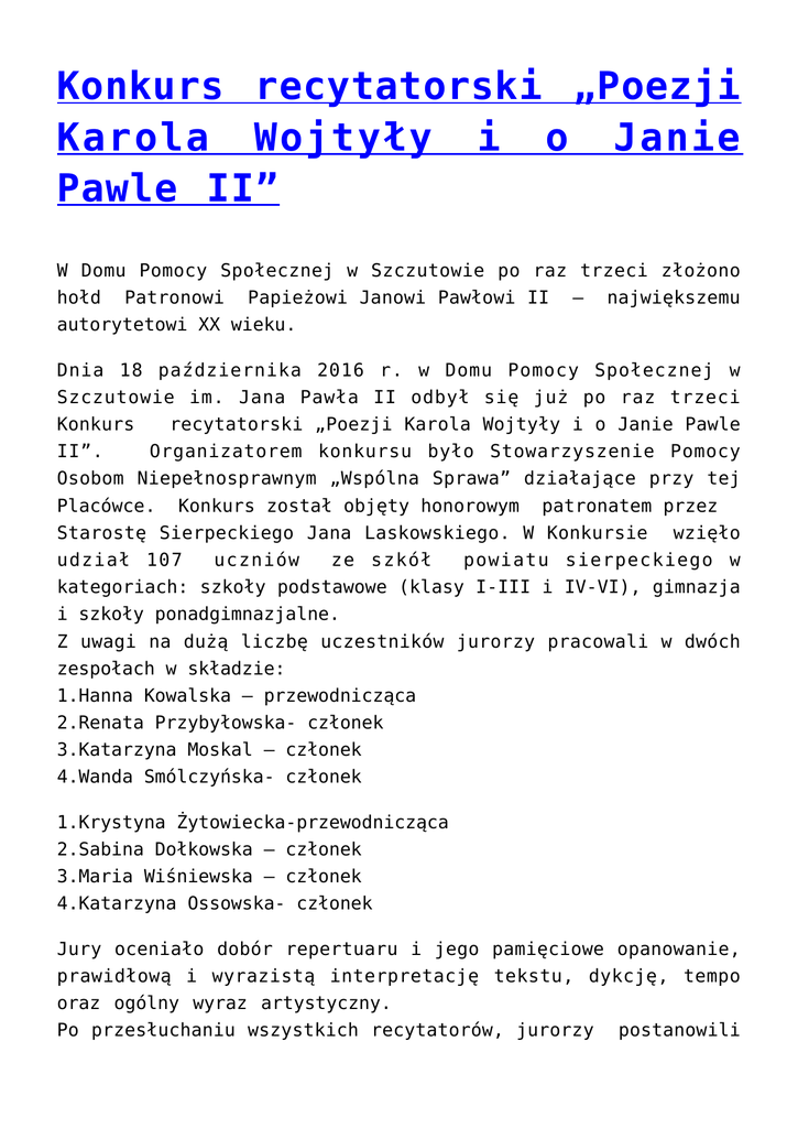 Konkurs recytatorski „Poezji Karola Wojtyły i o Janie Pawle II” W Domu Pomocy Społecznej w Szczutowie po raz trzeci złożono hołd Patronowi Papieżowi Janowi Pawłowi II autorytetowi XX wieku. – największemu Dnia 18 października 2016 r. w Domu Pomocy Społecznej w Szczutowie im. Jana Pawła II odbył się już po raz trzeci Konkurs recytatorski „Poezji Karola Wojtyły i o Janie Pawle II”. Organizatorem konkursu było Stowarzyszenie Pomocy Osobom Niepełnosprawnym „Wspólna Sprawa” działające przy tej Placówce. Konkurs został objęty honorowym patronatem przez Starostę Sierpeckiego Jana Laskowskiego. W Konkursie wzięło udział 107 uczniów ze szkół powiatu sierpeckiego w kategoriach: szkoły podstawowe (klasy I-III i IV-VI), gimnazja i szkoły ponadgimnazjalne. Z uwagi na dużą liczbę uczestników jurorzy pracowali w dwóch zespołach w składzie: 1.Hanna Kowalska – przewodnicząca 2.Renata Przybyłowska- członek 3.Katarzyna Moskal – członek 4.Wanda Smólczyńska- członek 1.Krystyna Żytowiecka-przewodnicząca 2.Sabina Dołkowska – członek 3.Maria Wiśniewska – członek 4.Katarzyna Ossowska- członek Jury oceniało dobór repertuaru i jego pamięciowe opanowanie, prawidłową i wyrazistą interpretację tekstu, dykcję, tempo oraz ogólny wyraz artystyczny. Po przesłuchaniu wszystkich recytatorów, jurorzy postanowili nagrodzić następujące osoby: Kategoria- Szkoły Podstawowe klasy I-III I miejsce- Górecki Aleks – Prywatna Szkoła Podstawowa w Sierpcu i Czachorowska Maja – Szkoła Podstawowa im. St.Reymonta w Szczutowie II miejsce- Jagodzińska Zofia- Prywatna Szkoła Podstawowa w Sierpcu i Siwińska Wiktoria – Szkoła Podstawowa nr 2 im.Armii Krajowej w Sierpcu III miejsce- Kaczyński Kajetan Szkoła Podstawowa St.Reymonta w Szczutowie i Mosakowska Nina – Prywatna Szkoła Podstawowa w Sierpcu im. Wyróżnienia: Czachorowski Kacper Szkoła Podstawowa im. St.Reymonta w Szczutowie Gawrońska Julia Szkoła Podstawowa nr 2 im.Armii Krajowej w Sierpcu Komorowska Julia Szkoła Podstawowa w Gójsku Lemanowicz Aleksandra Szkoła Podstawowa nr 2 im.Armii Krajowej w Sierpcu Makowska Marzena Szczutowie Szkoła Podstawowa im. St.Reymonta w Nowotka Zuzanna Szkoła Podstawowa im. St.Reymonta w Szczutowie Rumińska Wiktoria Szkoła Podstawowa w Gójsku Ziółkowska Natalia Szkoła Podstawowa im.Jana Pawła II w Mochowie Węglarek Lena Szkoła Podstawowa nr 2 im.Armii Krajowej w Sierpcu Kategoria- Szkoły Podstawowe klasy IV-VI I miejsce- Jakub Kwiatkowski Szkoła Podstawowa nr 2 im. Armii Krajowej w Sierpcu II miejsce- Nadia Chochlińska Szkoła Podstawowa Nr 3 im. Ks.Jana Twardowskiego w Sierpcu i Sebastian Koziorowski – Prywatna Szkoła Podstawowa w Sierpcu III miejsce- Julia Roman Szkoła Podstawowa im. St.Reymonta w Szczutowie i Magdalena Prószyńska – Prywatna Szkoła Podstawowa w Sierpcu Wyróżnienia: Martyna Gutfrańska-Szkoła Podstawowa im. St.Reymonta w Szczutowie, Sandra Kalinowska -Szkoła Podstawowa im. St.Reymonta w Szczutowie, Emilia Dąbrowska- Szkoła Podstawowa im. M.Konopnickiejw Gozdowie, Amelia Witkowska – Szkoła Podstawowa nr 2 im.Armii Krajowej w Sierpcu, Natalia Linowska – Szkoła Podstawowa nr 2 im.Armii Krajowej w Sierpcu, Alicja Sulkowska – Szkoła Podstawowa nr 2 im.Armii Krajowej w Sierpcu, Agnieszka Felczak- Szkoła Podstawowa im.Jana Pawła II w Mochowie, Julia Żuchowska – Szkoła Podstawowa w Gójsku, Julia Kurta – Szkoła Podstawowa im.Zygmunta Padlewskiego w Bledzewie, Magda Rogowicz – Szkoła Podstawowa w Gójsku Martyna Olewnik – Szkoła Podstawowa w Gójsku, Joanna Rajkowska – Szkoła Podstawowa im.W.Witosa w Jeżewie, Michalina Topolewska – Szkoła Podstawowa w Sudragach. Kategoria: Szkoły Gimnazjalne I miejsce- Kwiatkowski Filip Gimnazjum Miejskie im.M.Kopernika w Sierpcu i Stahlke Aleksandra- Gimnazjum Publiczne im.Biskupa. Leona Wetmańskiego w Sierpcu II miejsce- Szewczyk Laura Gimnazjum Miejskie im.M.Kopernika w Sierpcu, Wesołowska Klaudia Gimnazjum im.E.Żółtowskiego w Mochowie, III miejsce- Łykowska Natalia Gimnazjum im.E.Żółtowskiego w Mochowie, Świerzyńska Kinga Gimnazjum Miejskie im.M.Kopernika w Sierpcu Wyróżnienia: Kaczyńska Dominika Gimnazjum im.Polskich Olimpijczyków w Szczutowie, Tyburski Hubert Gimnazjum Publiczne im. Bs. Leona Wetmańskiego w Sierpcu, Zielińska Marta Gimnazjum im.Polskich Olimpijczyków w Szczutowie Kategoria: Szkoły Ponadgimnazjalne II miejsce- Patryk Szczepański Zespół Szkół Centrum Kształcenia Rolniczego Rolniczych w Studzieńcu i Patrycja Gadowska Zespół Szkół nr 2 im.Zygmunta Wolskiego w Sierpcu III miejsce- Maciej Skibiński Zespół Szkół nr 2 im.Zygmunta Wolskiego w Sierpcu i Katarzyna Brudnicka Zespół Szkół nr 1im.Gen.Jose de San Martin w Sierpcu Wyróżnienia: Aleksandra Lewandowska Specjalny Ośrodek Szkolno – Wychowawczy w Sierpcu Wojciech Przybojewski Specjalny Ośrodek Szkolno – Wychowawczy w Sierpcu Natalia Filipska Zespół Szkół nr 2 im.Zygmunta Wolskiego w Sierpcu Natalia Szychułda Zespół Szkół nr 1 im.Gen. Jose de San Martin w Sierpcu Aneta Szczepkowska Zespół Szkół Centrum Kształcenia Rolniczego Rolniczych w Studzieńcu Nagroda Dyrektora Domu Pomocy Społecznej w Szczutowie: Szubka Dawid Gimnazjum im.Jana Pawła II w Susku Uczestnicy konkursu wykazali się wysokim poziomem interpretacji wybranych przez siebie tekstów poetyckich Jana Pawła II. Wszyscy uczestnicy konkursu otrzymali dyplomy gratulacyjne za udział. Jurorzy podkreślali wielkie zaangażowanie i trud nauczycieli w przygotowanie uczniów do konkursu oraz budującą postawę młodego pokolenia zainteresowanego głębokimi i trudnymi tekstami św. Jana Pawła II. Wręczenie dyplomów i nagród odbyło się na uroczystej gali w dniu 28 października 2016r. w Domu Pomocy Społecznej w Szczutowie, podczas której Starosta Sierpecki Jan Laskowski wręczył dyplomy i nagrody laureatom oraz wyróżnionym w konkursie. Podczas gali 
