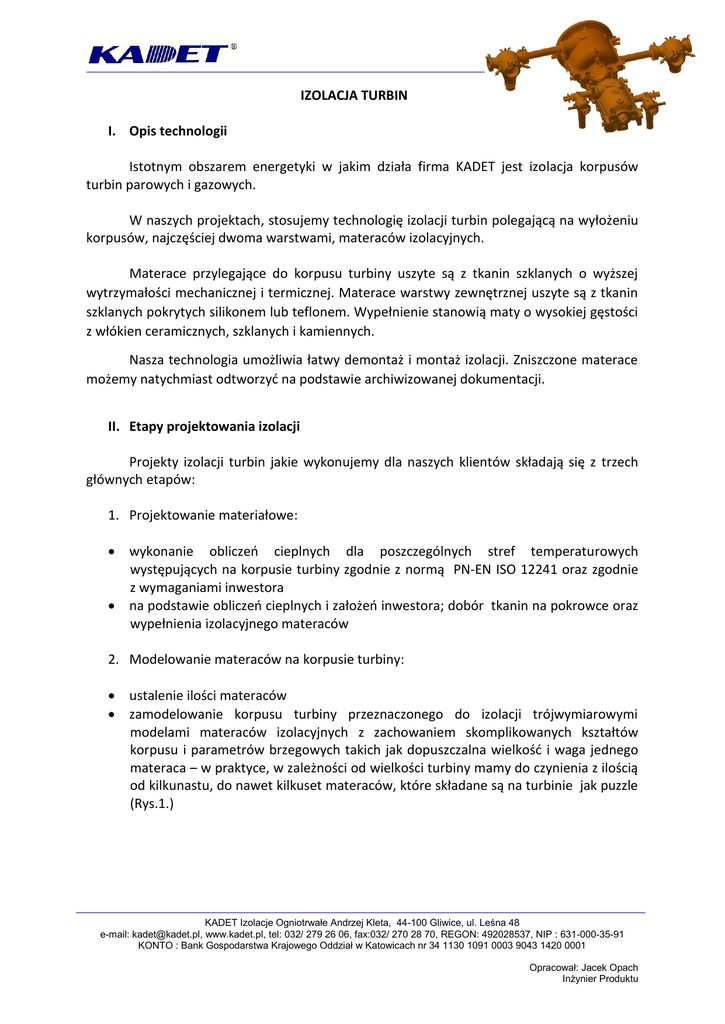 IZOLACJA TURBIN I. Opis technologii Istotnym obszarem energetyki w jakim działa firma KADET jest izolacja korpusów turbin parowych i gazowych. W naszych projektach, stosujemy technologię izolacji turbin polegającą na wyłożeniu korpusów, najczęściej dwoma warstwami, materaców izolacyjnych. Materace przylegające do korpusu turbiny uszyte są z tkanin szklanych o wyższej wytrzymałości mechanicznej i termicznej. Materace warstwy zewnętrznej uszyte są z tkanin szklanych pokrytych silikonem lub teflonem. Wypełnienie stanowią maty o wysokiej gęstości z włókien ceramicznych, szklanych i kamiennych. Nasza technologia umożliwia łatwy demontaż i montaż izolacji. Zniszczone materace możemy natychmiast odtworzyć na podstawie archiwizowanej dokumentacji. II. Etapy projektowania izolacji Projekty izolacji turbin jakie wykonujemy dla naszych klientów składają się z trzech głównych etapów: 1. Projektowanie materiałowe: wykonanie obliczeń cieplnych dla poszczególnych stref temperaturowych występujących na korpusie turbiny zgodnie z normą PN-EN ISO 12241 oraz zgodnie z wymaganiami inwestora na podstawie obliczeń cieplnych i założeń inwestora; dobór tkanin na pokrowce oraz wypełnienia izolacyjnego materaców 2. Modelowanie materaców na korpusie turbiny: ustalenie ilości materaców zamodelowanie korpusu turbiny przeznaczonego do izolacji trójwymiarowymi modelami materaców izolacyjnych z zachowaniem skomplikowanych kształtów korpusu i parametrów brzegowych takich jak dopuszczalna wielkość i waga jednego materaca – w praktyce, w zależności od wielkości turbiny mamy do czynienia z ilością od kilkunastu, do nawet kilkuset materaców, które składane są na turbinie jak puzzle (Rys.1.) KADET Izolacje Ogniotrwałe Andrzej Kleta, 44-100 Gliwice, ul. Leśna 48 e-mail: [email protected], www.kadet.pl, tel: 032/ 279 26 06, fax:032/ 270 28 70, REGON: 492028537, NIP : 631-000-35-91 KONTO : Bank Gospodarstwa Krajowego Oddział w Katowicach nr 34 1130 1091 0003 9043 1420 0001 Opracował: Jacek Opach Inżynier Produktu Rys.1. ustalenie dopuszczalnej wagi i wielkości jednego materaca wykonanie rysunków technicznych rzutów materaców na płaszczyźnie płaskiej wykonanie rysunków technicznych - montażowych 3D, przedstawiających wizualizację każdej z warstw z numeracją poszczególnych materaców – umożliwia to szybkie zorientowanie się, gdzie na korpusie ma być umiejscowiony dany element (Rys.2.) Rys.2. KADET Izolacje Ogniotrwałe Andrzej Kleta, 44-100 Gliwice, ul. Leśna 48 e-mail: [email protected], www.kadet.pl, tel: 032/ 279 26 06, fax:032/ 270 28 70, REGON: 492028537, NIP : 631-000-35-91 KONTO : Bank Gospodarstwa Krajowego Oddział w Katowicach nr 34 1130 1091 0003 9043 1420 0001 Opracował: Jacek Opach Inżynier Produktu 3. Produkcja i pakowanie materaców: Materace są produkowane zgodnie z założeniami uzyskanymi na wcześniejszych etapach, a następnie przechodzą dodatkową weryfikację zgodności z wcześniejszymi etapami (Zdj. nr 1), po czym są pakowane w skrzynie o odpowiedniej wielkości, w celu zapewnienia jak najlepszej jakości produktu po rozładunku (Zdj. nr 2). Zdj. nr 1 - Weryfikacja zgodności Zdj. nr 2 - Pakowanie III. Montaż materaców izolacyjnych na korpusie turbiny Finalną częścią projektu jest montaż materaców. Firma KADET posiada wykwalifikowany i doświadczony zespół, który może zająć się montażem izolacji turbin. Izolacja polega na montażu zwykle dwóch warstw materaców, z czego pierwsza warstwa nabijana jest na wcześniej przygotowane szpilki, a następnie już bez nabijania nakładana jest druga warstwa z powłoką zewnętrzną wodo i olejoodporną. Druga warstwa pokrywa wszystkie łączenia pierwszej warstwy I eliminuje mostki cieplne. Wszelkie pustki jakie mogą wystąpić (np. między śrubami łączącymi korpusy) są wypełniane matą ceramiczną, co zapewnia lepszą izolacyjność. Zdj. nr 3 - Turbina przed izolacją Zdj. nr 4 - Turbina po izolacji KADET Izolacje Ogniotrwałe Andrzej Kleta, 44-100 Gliwice, ul. Leśna 48 e-mail: [email protected], www.kadet.pl, tel: 032/ 279 26 06, fax:032/ 270 28 70, REGON: 492028537, NIP : 631-000-35-91 KONTO : Bank Gospodarstwa Krajowego Oddział w Katowicach nr 34 1130 1091 0003 9043 1420 0001 Opracował: Jacek Opach Inżynier Produktu
