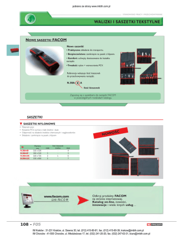 section 04PL_NOIR 28/02/05 15:02 Page 108 pobrano ze strony www.imbth.com.pl STANOWISKO PRACY I PRZECHOWYWANIE WALIZKI I SASZETKI TEKSTYLNE NOWE SASZETKI FACOM Nowe saszetki • Praktyczne: składanie do transportu. • Bezpieczeństwo: zamknięcie na pasek z klipsem. • Komfort: uchwyty dostosowane do kształtu narzędzi. • Trwałość: nylon + wzmocnienia PCV. Referencja wskazuje ilość kieszonek do przechowywania narzędzi. N.38A- X A Ilość kieszonek Zapoznaj się z saszetkami do narzędzi FACOM w poszczególnych rozdziałach katalogu. SASZETKI ▼ SASZETKI NYLONOWE • • • • Materiał: nylon Kieszenie PCV, wymiary: małe średnie i duże Odporność na działanie środków chemicznych i węglowodorów Składanie i zamknięcie na pasek z klipsem F N.38A-4B N.38A-6F N.38A-10C N.38A-12C Wymiary mm 310 x 530 360 x 520 320 x 735 330 x 800 małe 3 3 5 Ilość kieszonek średnie 1 - duże 4 3 6 7 www.facom.com Link FACOM 108 - F05 OŚĆ NOW Odkryj produkty FACOM na stronie internetowej. Katalog on-line, nowości, innowacje i wiele innych usług… Katalog elektroniczny na www.facom.com IM Kraków : 31-231 Kraków, ul. Siewna 30, tel. (012) 415-80-81, fax. (012) 415-80-39, [email protected] IM Chorzów : 41-500 Chorzów, ul. Młodzieżowa 17, tel. (032) 241-20-20, fax. (032) 247-63-31, [email protected]