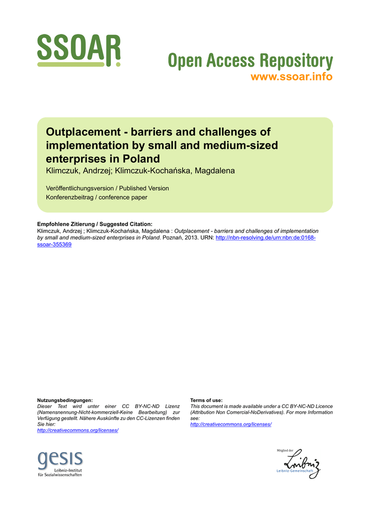 www.ssoar.info Outplacement - barriers and challenges of implementation by small and medium-sized enterprises in Poland Klimczuk, Andrzej; Klimczuk-Kochańska, Magdalena Veröffentlichungsversion / Published Version Konferenzbeitrag / conference paper Empfohlene Zitierung / Suggested Citation: Klimczuk, Andrzej ; Klimczuk-Kochańska, Magdalena : Outplacement - barriers and challenges of implementation by small and medium-sized enterprises in Poland. Poznań, 2013. URN: http://nbn-resolving.de/urn:nbn:de:0168ssoar-355369 Nutzungsbedingungen: Dieser Text wird unter einer CC BY-NC-ND Lizenz (Namensnennung-Nicht-kommerziell-Keine Bearbeitung) zur Verfügung gestellt. Nähere Auskünfte zu den CC-Lizenzen finden Sie hier: http://creativecommons.org/licenses/ Terms of use: This document is made available under a CC BY-NC-ND Licence (Attribution Non Comercial-NoDerivatives). For more Information see: http://creativecommons.org/licenses/ 11th Annual ESPAnet Conference “Social Policy and Economic Development” September 5-7 , 2013, Poznań University of Economics Stream: 6. Innovative social and labour-market policies in times of crisis dr Magdalena Klimczuk-Kochańska Stanislaw Staszic College of Public Administration in Bialystok mgr Andrzej Klimczuk Warsaw School of Economics Outplacement - Barriers and Challenges of Implementation by Small and Medium-Sized Enterprises in Poland Introduction The global financial and economic crisis forces undertaking restructuring actions by companies. These processes are commonly associated with implementation of solutions for optimization operating costs in human capital dimension. In former communist states of Eastern, South-Eastern and Central Europe like Poland these changes are associated with political, social and economic transformation from late 20th century. The restructuring processes are perceived here as an activity for layoffs, which consequently leads to increase of unemployment, including long-term and structural unemployment. Outplacement is relatively little popular technique oriented on responsible monitored dismissals for a smooth transition of laid-off workers to new workplaces. In this way, both employees and companies increases their chances for maintaining competencies and better adaption to market competition requirements. In this article outplacement will be described as a concept with mechanisms similar to active labor market policies. However outplacement is aimed at prevention of unemployment, not on action when it already occurs. Key challenges are cooperation of enterprises with public and non-public employment services as well as adapting these programs to the needs and capabilities of small and medium-sized enterprises. Article includes a critical analysis of the literature as well as selected results of research conducted in Podlaskie Voivodship in 2012 as part of “Innowacje na zakręcie - testowanie i wdrażanie nowych metod outplacementu” (“Innovation on the cusp - testing and implementation of new outplacement methods”) project. Summary includes recommendations for dissemination and implementation of outplacement as a good practice of corporate social responsibility. 1 Outplacement as a possible response of Polish enterprises to the restructuring during economic crisis The competitiveness of the European economy increasingly depends on its ability to innovate as well as fast and smooth adaptation to the changes of its environment. Enterprises are constantly forced to adaptation, because in the medium term – due to technological progress and innovation – product life cycle is getting shorter. They must also respond to changes in international division of labor which leads to restructuring actions1. In Poland, in the public consciousness, these processes are associated with rapid economic change of the transformation from 20th century 90s or economic downturn of 2002-2004. Present restructuring concerns the global financial crisis and is negatively associated with unemployment, mass layoffs and bankruptcies. In the past, many restructuring processes resulted in undesirable consequences for communities and regions that worsening their situation2. Success of changes depends on the way of carrying them out, cooperation between social partners and the mutual trust. The negative consequences of those changes mainly affects laid off people who become unemployed. Restructuring of employment is a result of its level mismatch to the organization’s needs. According to K. Sochacka this process is undertaken, as employers need to adapt for changing economic, technical and organizational conditions3. According to A. Pocztowski labor surplus can be analyzed further in quantity, quality, temporal, spatial, or cost dimensions4. This researcher also indicates three groups of factors that cause employment mismatch: (1) economic like business conditions, irrational use of time, high labor costs and inadequate remuneration systems; (2) technical like new technologies that modernize workplaces or changing demand for labor; as well as (3) organizational like changes in organizational structures, work processes, mergers and acquisitions. Nowadays downsizing is associated with a tendency to reduce size and cost of business organization. These changes are universal, applicable to all categories of employees, including managerial staff. Forced reduction of employment may result in many undesirable effects. Those are for example: (1) decreased activity of employees remaining in the company and not reaching expected performance and consequently decrease of their suitability for enterprise; (2) 1 K.-D. Sohn, S. Czuratis, Zielona Księga UE. Restrukturyzacja przedsiębiorstw. Analiza z dnia 14 maja 2012 r., Centrum für Europäische Politik, Fundacja FOR, Warszawa 2012, www.for.org.pl/pl/d/3e7bbc0b6276bf19dcf616b5b6e2163b [14.07.2013]. 2 M. Korsak, Restrukturyzacja zatrudnienia, FISE, Warszawa 2009, p. 5. 3 K. Sochacka, Skuteczne rozwiąz