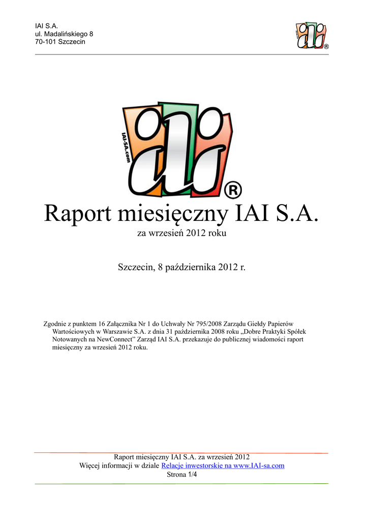 IAI S.A. ul. Madalińskiego 8 70-101 Szczecin Raport miesięczny IAI S.A. za wrzesień 2012 roku Szczecin, 8 października 2012 r. Zgodnie z punktem 16 Załącznika Nr 1 do Uchwały Nr 795/2008 Zarządu Giełdy Papierów Wartościowych w Warszawie S.A. z dnia 31 października 2008 roku „Dobre Praktyki Spółek Notowanych na NewConnect” Zarząd IAI S.A. przekazuje do publicznej wiadomości raport miesięczny za wrzesień 2012 roku. Raport miesięczny IAI S.A. za wrzesień 2012 Więcej informacji w dziale Relacje inwestorskie na www.IAI-sa.com Strona 1/4 IAI S.A. ul. Madalińskiego 8 70-101 Szczecin I. Informacje na temat wystąpienia tendencji i zdarzeń w otoczeniu rynkowym Spółki, które w ocenie Spółki mogą mieć w przyszłości istotne skutki dla kondycji finansowej oraz wyników finansowych IAI S.A. Działalność Spółki we wrześniu skupiła się na tworzeniu nowych narzędzi zwiększających sprzedaż jej klientów. Szczególnie wiele nowych funkcji udało się wprowadzić w zakresie sprzedaży na serwisach aukcyjnych, w tym międzynarodowych. Jest to kolejny etap realizacji ekspansji zagranicznej. Ponadto warto odnotować umieszczenie Spółki drugi raz z rzędu wśród laureatów prestiżowego rankingu Deloitte Technology Fast 50. Sprzedaż przez portale aukcyjne w Polsce i na świecie jest ważnym kanałem dystrybucji dla sklepów internetowych. Dlatego Spółka pozyskując nowych klientów w Polsce i na rynkach europejskich musi mieć najlepsze możliwe narzędzia ułatwiające sprzedaż oraz import już wcześniej sprzedawanych towarów na aukcjach. W związku z tym szereg nowych usług przygotowanych przez Spółkę we wrześniu skupia się na rozbudowie integracji z eBay, Allegro oraz innymi serwisami agregującymi sprzedaż i płatności poza Polską. Dla nowych klientów Spółki ważne narzędzie to szybki import wszystkich aukcji z Allegro i eBay do sklepu internetowego. Dzięki niemu istnieje możliwość wyświetlenia wszystkich trwających aukcji a następnie masowego ich importu. Na ich podstawie tworzą się towary i daje to możliwość ich obsługi w systemie IAI-Shop.com. Ta funkcja umożliwia firmom, które sprzedawały aktywnie na Allegro czy eBay, ale ciągle miały za mało czasu na to, aby uruchomić sklep internetowy, zrobienie tego jeszcze szybciej i prościej. Zaoszczędzony na obsłudze aukcji czas (ponowne wystawianie, lepsza obsługa zamówienia), mogą następnie przeznaczyć na dopracowanie opisów towarów i odpalenie swojego sklepu. Uprości to także działalność Spółki w zakresie supportu nowych klientów i przyspieszy okres pomiędzy zamówieniem a faktycznym uruchomieniem sklepu internetowego, co przynosi Spółce z jednej strony oszczędności, a z drugiej szybsze przychody. Rozbudowując możliwości międzynarodowego handlu za pośrednictwem aukcji internetowych Spółka dodała we wrześniu automatyczne księgowanie wpłat dokonywanych przez PayPal za pośrednictwem eBay. Znacznie upraszcza to obsługę eksportu dla polskich klientów oraz jest bardzo ważną integracją pod kątem rynku niemieckiego i brytyjskiego, ponieważ obie te usługi są tam bardzo popularne. Ponadto Spółka dodała także nową możliwość rozliczanie zamówień z serwisów aukcyjnych zagranicznych w walutach innych niż waluta sklepu. Sprzedaż międzynarodowa na serwisach aukcyjnych (eBay lub Grupy Allegro) wymaga sprzedaży w innych walutach niż PLN. Dzięki temu rozwiązaniu, w ramach jednego sklepu zamówienia np. z eBay.co.uk będą rozliczane w Funtach, a z eBay.de w Euro, nawet gdy walutą rozliczeniową sklepu są złote. Te dwie funkcje pokazują na kompleksowość rozwiązań IAI. Ponadto z ważnych integracji międzynarodowych Spółka dodała możliwość eksportu oferty i integracji sklepu internetowego z Shopping.com i Google Shopping. Obie usługi nie są dostępne w Polsce, jednak są one bardzo istotnymi platformami na rynkach zagranicznych. W przypadku Shopping.com obecnie dostępna jest integracja tylko w wersji francuskiej. Kolejne kraje będą zaimplementowane w przyszłości. W przypadku Google Shopping lista dostępnych krajów jest bardzo szeroka i obejmuje: Australię, Brazylię, Chiny, Czechy, Francję, Hiszpanię, Holandię, Japonię, Niemcy, Szwajcarię, Wielką Brytanię, Włochy i USA. Korzystanie z tych mechanizmów nie różni się w sposób zasadniczy od korzystania z polskich porównywarek cen i jest całkowicie bezpłatne. Myślenie o popularnych poza Polską porównywarkach, potwierdza, że IAI-Shop.com Raport miesięczny IAI S.A. za wrzesień 2012 Więcej informacji w dziale Relacje inwestorskie na www.IAI-sa.com Strona 2/4 IAI S.A. ul. Madalińskiego 8 70-101 Szczecin jest obecnie najlepszym systemem do prowadzenia międzynarodowego sklepu internetowego. Spółka także stale inwestuje w narzędzie e-mail marketingu, które są bardzo skuteczne w pozyskiwaniu ruchu i zamówień do sklepów internetowych. Po całej serii nowości opisywanych w poprzednich raportach, we wrześniu Spółka wprowadziła możliwość planowania daty i godziny wysyłki newslettera. W niektórych branżach optymalnie jest wysłać newsletter w piątek wieczorem, w innych w poniedziałek rano. Przygotowanie newslettera i jego wysyłka wymaga jednak wcześniejszego dopracowania wiadomości. Dzięki funkcji planowania daty wysyłki newslettera można przygotować dopracowany newsletter i wysłać kampanię w optymalnym biznesowo momencie, bez uruchamiania wysyłki ręcznie po godzinach pracy lub wczesnego wstawania w poniedziałek rano. To kolejne narzędzie, które pozwala budować coraz bardziej dopasowane, skomplikowane i skuteczne kampanie promocyjne sklepów internetowych, dając klientom Spółki przewagę na rynku oraz zwiększając ich przychody. Większy ruch oraz przychody klientów Spółki są silnie skorelowane z jej przychodami, w związku z tym, te narzędzia w ocenie Zarządu będą poprawiały wyniki finansowe Spółki