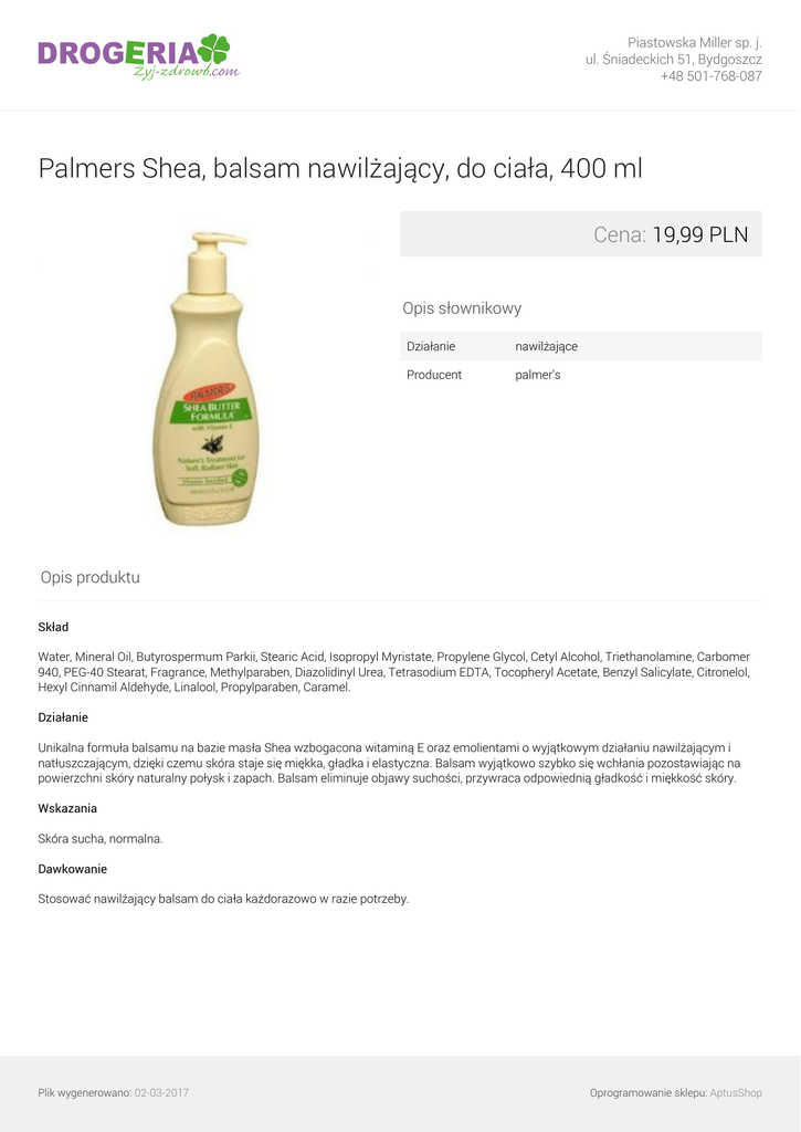 Piastowska Miller sp. j. ul. Śniadeckich 51, Bydgoszcz +48 501-768-087 Palmers Shea, balsam nawilżający, do ciała, 400 ml Cena: 19,99 PLN Opis słownikowy Działanie nawilżające Producent palmer's Opis produktu Skład Water, Mineral Oil, Butyrospermum Parkii, Stearic Acid, Isopropyl Myristate, Propylene Glycol, Cetyl Alcohol, Triethanolamine, Carbomer 940, PEG-40 Stearat, Fragrance, Methylparaben, Diazolidinyl Urea, Tetrasodium EDTA, Tocopheryl Acetate, Benzyl Salicylate, Citronelol, Hexyl Cinnamil Aldehyde, Linalool, Propylparaben, Caramel. Działanie Unikalna formuła balsamu na bazie masła Shea wzbogacona witaminą E oraz emolientami o wyjątkowym działaniu nawilżającym i natłuszczającym, dzięki czemu skóra staje się miękka, gładka i elastyczna. Balsam wyjątkowo szybko się wchłania pozostawiając na powierzchni skóry naturalny połysk i zapach. Balsam eliminuje objawy suchości, przywraca odpowiednią gładkość i miękkość skóry. Wskazania Skóra sucha, normalna. Dawkowanie Stosować nawilżający balsam do ciała każdorazowo w razie potrzeby. Plik wygenerowano: 02-03-2017 Powered by TCPDF (www.tcpdf.org) Oprogramowanie sklepu: AptusShop