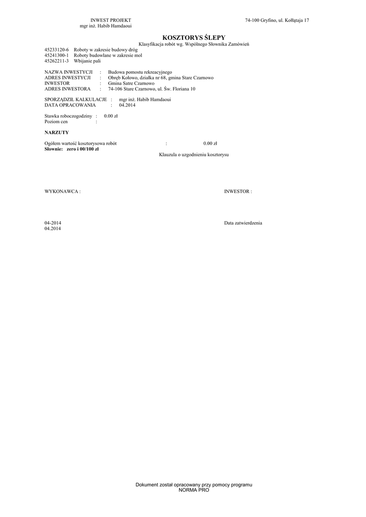 INWEST PROJEKT mgr inż. Habib Hamdaoui 74-100 Gryfino, ul. Kołłątaja 17 KOSZTORYS ŚLEPY Klasyfikacja robót wg. Wspólnego Słownika Zamówień 45233120-6 45241300-1 45262211-3 Roboty w zakresie budowy dróg Roboty budowlane w zakresie mol Wbijanie pali NAZWA INWESTYCJI ADRES INWESTYCJI INWESTOR ADRES INWESTORA : : : : Budowa pomostu rekreacyjnego Obręb Kołowo, działka nr 68, gmina Stare Czarnowo Gmina Satre Czarnowo 74-106 Stare Czarnowo, ul. Św. Floriana 10 SPORZĄDZIŁ KALKULACJE : DATA OPRACOWANIA : Stawka roboczogodziny : Poziom cen : mgr inż. Habib Hamdaoui 04.2014 0.00 zł NARZUTY Ogółem wartość kosztorysowa robót Słownie: zero i 00/100 zł : 0.00 zł Klauzula o uzgodnieniu kosztorysu WYKONAWCA : INWESTOR : 04-2014 04.2014 Data zatwierdzenia Dokument został opracowany przy pomocy programu NORMA PRO OGÓLNA CHARAKTERYSTYKA OBIEKTU Zaprojektowano konstrukcję pomostu z drewna sosnowego nieżywicowanego klasy C30. Tarcica powinna być suszona komorowo i czterokrotnie strugana. Drewno nie może mieć określonych normowo wad np. chorych sęków lub pęknięć. W procesie suszenia komorowego drewno zostaje pozbawione zarodników pleśni i grzybów. W czasie suszenia zabijane są także larwy owadów oraz całkowicie zatrzymany proces sinienia drewna. Wilgotność tarcicy przeznaczonej na elementy na otwartym powietrzu nie może być większa niż 23. Podstawowymi elementami konstrukcji pomostu są belki przymocowane do pali za pomocą śrub ze stali nierdzewnej z szerokimi podkładkami. W pierwszej kolejności przymocować belki poprzeczne o przekroju 20 x 20 L=2,25 m. Umożliwią one łatwiej wbudować belki boczne o przekroju 20 x 20 L = 2,25 każda. Połączenia śrubami wg Rys 6 : Rys. 7 (przekroje w skali 1:10). Tak zbudowany pomost powinien posiadać grubość 44 cm rz. góry pokładu 133,54m n.p.m. rz. dolnej belki 133,10 m n.p.m. Spełnia warunek wyniesienia pomostu nad poziom wody średniej H min=0,20 m<H=O,24 m Przed wbudowaniem elementy konstrukcyjne zaimpregnować biologicznie i chemicznie środkami ekologicznymi ogólnie dostępnymi na rynku. Impregnację wykonać poza obrębem robót. Wykonaną konstrukcję przykryć pokładem z desek sosnowych. Drewno nieżywicowane zaimpregnowane klasy C-30. Deski przybić gwoździami lub wkrętami ze stali nierdzewnej do belek podłużnych. Zastosować minimum dwa gwoździe karbowane o wymiarach 125 x 6 mm na każde jedno połączenie. Wierzchnia warstwa desek ryflowana. Zachować między poszczególnymi deskami 1 cm odstęp. Przed przystąpieniem do montażu desek należy na górnych powierzchniach belek podłużnych oraz pali wykonać izolacje przeciwwilgociową z papy termozgrzewalnej o grubości 3 ÷ 5 mm. Całość robót wykonać zgodnie z rysunkami konstrukcyjnymi. -2- Norma PRO Wersja 4.26 Licencja: 20727 dla INWEST PROJKT mgr inż. Habib Hamdaoui Pomost rekreacyjne.Kołowo dz.nr 68 - ślepy kosztorys PRZEDMIAR Lp. Podstawa Opis i wyliczenia j.m. 1 UKŁAD PALOWANIA 1 KNR 2-14 Wbijanie pali drewnianych kafarem pływającym na głębokość 4 m w szt. d.1 0102-01 grunt kat. I-II 20 szt. 2 Dostawa pali drewnianych z drewna iglastego o śr. 24cm d.1 kalk. własna 3.14*0.12*0.12*[2*(3.65+3.8+3.9+4.05)+4*(5.0+5.05+5.05)] 2 POMOST 3 KNR 2-14 Belki główne, podłużnice i poprzecznice pomostów o przekroju eled.2 0404-02 mentów do 400 cm2 montowane z wody 0.2*0.2*8*3+0.2*0.2*4.25*7+0.2*0.2*2.0*5+0.2*0.2*5.50*3 m3 m3 5 KNR 2-01 Mechaniczne karczowanie zagajników gęstych d.2 0108-01 0.6 ha m2 ha 6 KNR 2-14 Narzut z kamienia łamanego o masie do 500 kg na skarpach wykony- m3 d.2 0703-01 wany z lądu 2 m3 20.000 4.124 RAZEM 4.124 3.210 RAZEM 3.210 39.375 RAZEM 39.375 0.600 RAZEM 0.600 2.000 RAZEM 2.000 m3 drew. m3 drew. 8 KNR-W 2- Wspornik drewnian zastrzału balustrady - przekrój poprzeczny drew- m3 d.2 02 0409-03 na do 180 cm2 z tarcicy nasyconej analogia 0.05*0.12*56*0.37 m3 9 KNR-W 2- Słupek drewniany balustrady - przekrój poprzeczny drewna do 180 d.2 02 0407-03 cm2 z tarcicy nasyconej struganej 4-stronnie analogia 0.06*0.10*54 m3 drew. 10 KNR-W 2- Zastrzał drewniany balustrady - przekrój poprzeczny drewna do 180 d.2 02 0408-01 cm2 z tarcicy nasyconej 4-stronnie struganej 0.06*0.10*45*1.3 m3 11 KNR 2-21 Konstrukcje balustrady z okrąglaków struganych o śr. 10cm - pod.2 0603-04 chwyt 18*2+1.75*4+4.25*2 m m3 drew. m3 m 12 KNR-W 2- Pręty poziome drewniane balustrady strugane 4-stronnie z bali o m3 d.2 02 0409-01 wym. 6*8cm - przekrój poprzeczny drewna do 180 cm2 z tarcicy naanalogia syconej 0.06*0.08*(4*2.6+12*3.6+4*4.4+16*7) m3 Norma PRO Wersja 4.26 Licencja: 20727 dla INWEST PROJKT mgr inż. Habib Hamdaoui 20.000 RAZEM m3 m2 13 KNR 2-31 Podsypka piaskowa z zagęszczeniem mechanicznym - 3 cm grubość d.2 0105-03 warstwy po zagęszczeniu Krotność = 4 25 Razem m3 4 KNR 2-14 Pokład pomostowy z bali o grubości do 6 cm montowany z lądu d.2 0405-01 8*2+4.25*5.5 7 KNR-W 2- Słupy podestu strugane 4-stronnie o długości do 2 m - przekrój pod.2 02 0407-03 przeczny drewna do 180 cm2 z tarcicy nasyconej analogia 0.05*0.14*36*0.56 Poszcz 0.141 RAZEM 0.141 0.124 RAZEM 0.124 0.324 RAZEM 0.324 0.351 RAZEM 0.351 51.500 RAZEM 51.500 0.879 RAZEM 0.879 m2 m2 25.000 Pomost rekreacyjne.Kołowo dz.nr 68 - ślepy kosztorys Lp. Podstawa Opis i wyliczenia PRZEDMIAR j.m. 14 KNR 2-14 Układanie filtru żwirowego na skarpach i koronach budowli - wbudo- m3 d.2 0705-01 wanie z lądu 15 m3 15 KNR 2-31 Schody z płyt drogowych betonowych kwadratowych o grubości 12 d.2 0506-06 cm z wypełnieniem spoin zaprawą cementową analogia 9 3 PLAC REKREACYJNE 16 Dostawa i montaż d.3 wycena indywidualna 1 Norma PRO Wersja 4.26 Licencja: 20727 dla INWEST PROJKT mgr inż. Habib Hamdaoui Poszcz RAZEM Razem 25.000 15.000 RAZEM 15.000 9.000 RAZEM 9.000 1.000 RAZEM 1.000 m2 m2 szt szt Lp. Podstawa 2 3 KNR 2-14 d.2 0404-02 1* 2* 3* Opis jm POMOST Belki główne, podłużnice i poprzecznice pomostów o przekroju elementów do 400 cm2 montowane z wo