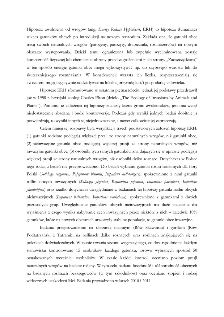 Hipoteza uwolnienia od wrogów (ang. Enemy Release Hypothesis, ERH) to hipoteza tłumacząca sukces gatunków obcych po introdukcji na nowym terytorium. Zakłada ona, że gatunki obce tracą swoich naturalnych wrogów (patogeny, pasożyty, drapieżniki, roślinożerców) na nowym obszarze występowania. Dzięki temu ograniczona lub zupełnie wyeliminowana zostaje konieczność fizycznej lub chemicznej obrony przed zagrożeniami z ich strony. ,,Zaoszczędzoną” w ten sposób energię gatunki obce mogą wykorzystywać np. do szybszego wzrostu lub do skuteczniejszego rozmnażania. W konsekwencji wzrasta ich liczba, rozprzestrzeniają się i z czasem mogą negatywnie oddziaływać na lokalną przyrodę lub/i gospodarkę człowieka. Hipotezę ERH sformułowano w ostatnim piętnastoleciu, jednak jej podstawy przedstawił już w 1958 r. brytyjski zoolog Charles Elton (dzieło „The Ecology of Invasions by Animals and Plants”). Pomimo, iż założenia tej hipotezy znalazły liczne grono zwolenników, jest ona wciąż niedostatecznie zbadana i budzi kontrowersje. Podczas gdy wyniki jednych badań dobitnie ją potwierdzają, to wyniki innych są niejednoznaczne, a nawet całkowicie jej zaprzeczają. Celem niniejszej rozprawy była weryfikacja trzech podstawowych założeń hipotezy ERH: (1) gatunki rodzime podlegają większej presji ze strony naturalnych wrogów, niż gatunki obce, (2) nieinwazyjne gatunki obce podlegają większej presji ze strony naturalnych wrogów, niż inwazyjne gatunki obce, (3) osobniki tych samych gatunków znajdujących się w uprawie podlegają większej presji ze strony naturalnych wrogów, niż osobniki dziko rosnące. Dotychczas w Polsce tego rodzaju badań nie przeprowadzono. Do badań wybrano gatunki roślin rodzimych dla flory Polski (Solidago virgaurea, Polygonum bistorta, Impatiens noli-tangere), spokrewnione z nimi gatunki roślin obcych inwazyjnych (Solidago gigantea, Reynoutria japonica, Impatiens parviflora, Impatiens glandulifera) oraz rzadko dotychczas uwzględniane w badaniach tej hipotezy gatunki roślin obcych nieinwazyjnych (Impatiens balsamina, Impatiens walleriana), spokrewnione z gatunkami z dwóch pozostałych grup. Uwzględnianie gatunków obcych nieinwazyjnych ma duże znaczenie dla wyjaśnienia z czego wynika nabywanie cech inwazyjnych przez niektóre z nich – zaledwie 10% gatunków, które na nowych obszarach utworzyły stabilne populacje, to gatunki obce inwazyjne. Badania przeprowadzono na obszarze nizinnym (Rów Skawiński) i górskim (Rów Podtatrzański z Tatrami), na roślinach dziko rosnących oraz roślinach znajdujących się na poletkach doświadczalnych. W czasie trwania sezonu wegetacyjnego, co dwa tygodnie na każdym stanowisku kontrolowano 15 osobników każdego gatunku, losowo wybranych spośród 50 oznakowanych wcześniej osobników. W czasie każdej kontroli oceniano poziom presji naturalnych wrogów na badane rośliny. W tym celu badano liczebność i różnorodność obecnych na badanych roślinach bezkręgowców (w tym szkodników) oraz oceniano stopień i rodzaj widocznych uszkodzeń liści. Badania prowadzono w latach 2010 i 2011. Liczebności i różnorodności stwierdzonych naturalnych wrogów porównano między poszczególnymi rodzajami stanowisk. W efekcie tego porównania dowiedziono, że liczba i rodzaj notowanych na roślinach wrogów różni się między poletkami doświadczalnymi i stanowiskami naturalnymi, jak również między obszarem nizinnym i górami. Dowiedziono m.in., że bezkręgowce (w tym szkodniki) liczniej stwierdzano na stanowiskach naturalnych, ale różnorodność taksonów była większa na poletkach doświadczalnych. Może to świadczyć o większej „atrakcyjności” uprawianych roślin dla bezkręgowców (i szkodników), natomiast mniejsza liczba stwierdzonych osobników mogła być efektem prowadzonych w obrębie poletek i w ich sąsiedztwie zabiegów pielęgnacyjnych. W porównaniach między mezoregionami wykazano natomiast większą liczebność stwierdzanych szkodników w górach, a nie jak przewidywano – na nizinie. Zakładano bowiem, że charakterystyczny dla gór surowy klimat będzie ograniczał liczebność i różnorodność stwierdzanych bezkręgowców. Ustalono również, że najliczniej stwierdzane i groźne dla roślin Aphidoidea miały prawdopodobnie największy spośród szkodników wpływ na uzyskane wyniki testów weryfikacji hipotezy ERH. Na wyniki testów ERH miały również wpływ stwierdzone objawy chorób i uszkodzeń liści. Niemal co drugi skontrolowany liść nosił tego typu ślady i to właśnie testy dla intensywności oddziaływania czynników chorobowych na badane rośliny w największej liczbie przypadków potwierdzały hipotezę ERH. Oznacza to, że obcym gatunkom roślin było łatwiej uciec od czynników chorobowych, niż od szkodników. Rdze i plamy były najczęściej (i na największej liczbie liści) stwierdzanym objawem chorobowych. Dla tego i dla innych objawów chorobowych wykazano duże różnice między poszczególnymi rodzajami stanowisk: poletkami doświadczalnymi i stanowiskami naturalnymi oraz między mezoregionem nizinnym i mezoregionem górskim. Różnice te mogły przypuszczalnie być rezultatem wpływu innych czynników (np. żyźniejszej gleby czy większego promieniowania słońca na danym stanowisku) lub zabiegów pielęgnacyjnych (w przypadku poletek doświadczalnych), a nie samej presji ze strony naturalnych wrogów. Przeprowadzone testy, za wyjątkiem porównania dla gatunków roślin rodzimych z obcymi nieinwazyjnymi, nie potwierdziły jednoznacznie założeń hipotezy ERH. To właśnie gatunki obce nieinwazyjne, a nie obce inwazyjne, uwalniały się od naturalnych wrogów najskuteczniej. Hipotezę potwierdzono częściowo w porównaniach gatunków rodzimych z obcymi inwazyjnymi, jednak tylko na poletkach doświadczalnych. Natomiast wyniki ze stanowisk naturalnych najczęściej wskazywały na brak istotnych różnic między 