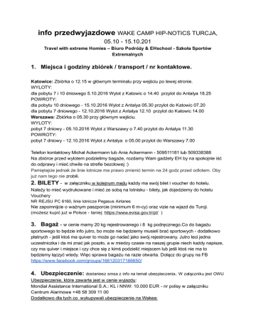 info przedwyjazdowe W AKE CAMP HIPNOTICS TURCJA, 05.10 15.10.201 Travel with extreme Homies – Biuro Podróży & EHschool Szkoła Sportów Extremalnych 1. Miejsca i godziny zbiórek / transport / nr kontaktowe. Katowice: Zbiórka o 12.15 w głównym terminalu przy wejściu po lewej stronie. WYLOTY: dla pobytu 7 i 10 dniowego 5.10.2016 Wylot z Katowic o 14.40 przylot do Antalya 18.25 POWROTY: dla pobytu 10 dniowego 15.10.2016 Wylot z Antalya 05.30 przylot do Katowic 07.20 dla pobytu 7 dniowego 12.10.2016 Wylot z Antalya 12.10 przylot do Katowic 14.00 Warszawa: Zbiórka o 05.30 przy głównym wejściu. WYLOTY: pobyt 7 dniowy 05.10.2016 Wylot z Warszawy o 7.40 przylot do Antalya 11.30 POWROTY: pobyt 7 dniowy 12.10.2016 Wylot z Antalya o 05.00 przylot do Warszawy 7.00 Telefon kontaktowy Michał Ackermann lub Ania Ackermann 509511181 lub 509338388 Na zbiórce przed wylotem podzielimy bagaże, rozdamy Wam gadźety EH by na spokojnie iść do odprawy i mieć chwile na strefie bezcłowej :) Pamiętajcie jednak że linie lotnicze ma prawo zmienić termin na 24 godz przed odlotem. Oby już nam tego nie zrobili. 2. BILETY w załączniku w kolejnym mejlu każdy ma swój bilet i voucher do hotelu. Należy to mieć wydrukowane i mieć ze sobą na lotnisku bilety, jak dojedziemy do hotelu Vouchery NR REJSU PC 6160, linie lotnicze Pegasus Airlanes Nie zapomnijcie o ważnym paszporcie (minimum 6 mcy) oraz vizie na wjazd do Turcji . (możesz kupić już w Polsce taniej: https://www.evisa.gov.tr/pl/ ) 3. Bagaż w cenie mamy 20 kg rejestrowanego i 8 kg podręcznego.Co do bagażu sportowego to będzie info jutro, bo może nie będziemy musieli brać sportowych dodatkowo płatnych jeśli ktoś ma quiver to może go nadać jako swój rejestrowany. Jutro leci jedna uczestniczka i da mi znać jak poszło, a w miedzy czasie na naszej grupie niech każdy napisze, czy ma quiver i miejsce i czy chce się z kimś podzielić miejscem lub jeśli ktoś nie ma to będziemy łączyć wtedy. Więc sprawa bagażu na razie otwarta. Dołącz do grupy na FB https://www.facebook.com/groups/166120317166650/ 4. Ubezpieczenie: d ostaniesz smsa z info na temat ubezpieczenia . W załączniku jest OWU Ubezpieczenie, które zawarte jest w cenie wyjazdu : Mondial Assistance International S.A.: KL i NNW: 10.000 EUR nr polisy w załączniku Centrum Alarmowe +48 58 309 11 00 Dodatkowo dla tych co wykupywali ubezpieczenie na Wakea: ubezpieczenie Hestia Podróże pakiet pełny: w zakresie Koszty leczenia (KL), assistance i koszty ratownictwa (KR) 500 000 pln, następstw nieszczęśliwych wypadków (NNW) 30 000 pln, odpowiedzialność cywilna (OC) 1 000 000 pln, Bagaż 5 000 pln – pakiet sport plus:(sporty rekreacyjne i ryzykowne: wakeboard, narty wodne ) Całodobowe centrum alarmowe 0048 585507012 , nr polisy: 903010101742 5. Zakwaterowanie / pokoje lista w załączniku :) Wszystkie rezerwacje dla naszej grupy są połączone, więc powinni nas zakwaterować obok siebie. 6. Wypożyczalnia aut Mamy zarezerwowane auta i mamy je dostępne na 9 dni od czwartku do przedostatniego dnia pobytu lub na 6 dni. info konkretnie kto z kim w załączniku. Koszt za wypożyczenie auta z paliwem: 9 dni 60 euro za osobę (300 euro za auto) 6 dni 50 euro na osobę ( 250 euro za auto) 7. Ramowy plan Dnia 9 śniadanie 10 wyjazd na wakepark, rozgrzewka, szkolenie, testy sprzętu wakeboardowego i kamer Go Pro 14 lunch w hotelu 15.30 wyjazd na popołudniowe sesje wakeboardowe, foto i wideo sesje 18.30 powrót do hotelu na kolacje, spa, animacje wieczorne, imprezy W hotelu mamy do dyspozycji, siłownię, boiska sportowe, kort tenisowy wiec pamiętajcie o odpowiednim ubraniu sportowym i obuwiu. Zagramy w Piłkę, kosza i tenisa :) 8. Co zabrać należy – o tym warto pamiętać: ● ● ● ● ● paszport, DO, i prawko do wypożyczalni potrzebne gotówkę: tygodniowy karnet na wake park 200 euro, każdy kolejny dzień 35 euro, na wypożyczenie auta 50euro6 dni/60 euro,9 dni.Ceny na wakeparku: Piwo, woda ok 3 euro, wino butelka 1012 euro. W hotelu prawie wszystko jest w cenie. sprawny sprzęt wakeboardowy, kask, kamizelka, dla chętnych pianka okulary słoneczne, krem z filtrem będziemy mieć kilka modeli okularów Neon w promocyjnych cenach dobry humor :) pozdrawiamy: Ania i Acker [email protected] 509511181 lub 509338388