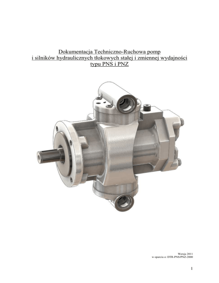 Dokumentacja Techniczno-Ruchowa pomp i silników hydraulicznych tłokowych stałej i zmiennej wydajności typu PNS i PNZ Wersja 2011 w oparciu o: DTR-PNS/PNZ-2000 1 Dokumentacja Techniczno-Ruchowa pomp i silników hydraulicznych tłokowych stałej i zmiennej wydajności typu PNS i PNZ 1. Wstęp Przedmiotem niniejszej dokumentacji techniczno-ruchowej są pompy i silniki hydrauliczne tłokowe osiowe stałej i zmiennej wydajności (chłonności) PNS i PNZ. Prawidłowa praca pompy czy silnika hydraulicznego w układach maszyn i urządzeń względem trwałości i niezawodności działania w duŜej mierze zaleŜy od stosowania się do wskazań i zaleceń zawartych w niniejszej dokumentacji. W interesie uŜytkownika leŜy stosowanie się do zawartych w niej zaleceń. 2. Przeznaczenie i charakterystyka techniczna 2.1 Przeznaczenie Pompy i silniki hydrauliczne tłokowe osiowe o stałej i zmiennej wydajności (chłonności) zwane dalej jednostkami, przeznaczone są do pracy w układach hydraulicznych napędu maszyn i urządzeń. Układy hydrauliczne, w których pracują omawiane jednostki winny być wyposaŜone w zawory przelewowe dla ich zabezpieczenia przed przeciąŜeniem. Jednostki przeznaczone są do pracy w warunkach klimatu umiarkowanego. 2.2. Oznaczenia Oznaczenie jednostki składa się z części literowej i wyróŜnika cyfrowego. Część literowa oznacza typ i odmianę konstrukcyjną, a wyróŜnik cyfrowy nominalną wydajność względnie chłonność w dm3/min. Jednostki o stałej wydajności mają oznaczenie PNS, a zmiennej wydajności mają oznaczenie PNZ. Dodatkowe litery i cyfry np. 2, A, D, S, K, M oznaczają odmiany konstrukcyjne. Przykład oznaczenia: PNS2-25D –oznacza jednostkę o stałej wydajności (chłonności), 2 –druga odmiana konstrukcyjna, D –projektowana do dźwigów, 25 –nominalna wydajność w dm3/min. Między pompą a silnikiem hydraulicznym nie występują róŜnice w oznaczeniu. 3. Opis techniczny 3.1. Praca jednostki Konstrukcja jednostki pokazana jest na rys.1. Podstawową częścią jednostki jest zespół wirujący. W skład zespołu wchodzi wał napędowy (1) ułoŜyskowany w łoŜyskach kulkowych, zakończony kołnierzem. W kołnierzu ułoŜyskowane są przegubowo tłoczyska (2) nurników. Na drugim końcu tłoczysk zamocowane są równieŜ przegubowo nurniki (3). Nurniki umieszczone są w otworach wirnika (4). Czoło wirnika przedstawia sobą powierzchnię kulistą (wklęsłą) współpracującą z podobnie ukształtowaną powierzchnią czołową (wypukłą) suwaka rozrządczego (5). Suwak rozrządczy jest ustalony względem korpusu pompy i w związku z tym nie bierze udziału w ruchu obrotowym elementów wirujących jednostki. Dzięki temu na powierzchni czołowej suwaka rozrządczego odbywa się rozdzielanie cieczy roboczej na wlocie i wylocie jednostki. Wirnik (4) osadzony jest na wałku środkowym (6) ułoŜyskowanym przegubowo w środkowym gnieździe kulistym wału 2 Dokumentacja Techniczno-Ruchowa pomp i silników hydraulicznych tłokowych stałej i zmiennej wydajności typu PNS i PNZ napędowego, pod pewnym kątem. W jednostkach o stałej wydajności kąt ten jest stały i wynosi 25°, a w jednostkach o zmiennej wydajności- zmienny w zakresie od 0° do 25°. Wskutek wychylonego połoŜenia wirnika z nurnikami względem osi wału, nurniki wykonują w otworach wirnika ruch posuwisto-zwrotny, a tym samym w pompie odbywa się proces ssania i tłoczenie cieczy roboczej. W zaleŜności od wielkości kąta wychylenia wirnika, w stosunku do osi wału, zmienia się skok nurników, a tym samym i wydajność pompy (przy stałej prędkości obrotowej wału). W pompach o zmiennej wydajności, bezstopniowa regulacja tej wydajności odbywa się drogą zmiany połoŜenia korpusu wychylnego pompy, za pomocą czopa znajdującego się na tym korpusie. Kierunek obrotów jednostki moŜe być lewy lub prawy. Od kierunku obrotów zaleŜy kierunek przepływu przez jednostkę cieczy roboczej, a tym samym podłączenie przewodów niskiego i wysokiego ciśnienia. W jednostce pracującej jako silnik hydrauliczny, doprowadzona pod ciśnieniem ciecz robocza działając na powierzchnię roboczą nurników wywołuje moment obrotowy na kołnierzu wału wprawiając go wraz z wirnikiem w ruch obrotowy. Wielkość momentu obrotowego uzaleŜniona jest od ciśnienia oleju i kąta wychylenia wirnika. Łączniki wlotowy i wylotowy winny być uszczelnione pierścieniami uszczelniającymi typu „O”. Jednostki o stałej wydajności (chłonności), obok wlotu i wylotu mają dodatkowo otwór gwintowany przeznaczony do odprowadzania przecieków wewnętrznych bezpośrednio do zbiornika. Łącznik przecieków wewnętrznych równieŜ winien być uszczelniony pierścieniem typu „O”. Jednostka zmiennej wydajności wymaga zabudowy w zbiorniku olejowym, a 3 Dokumentacja Techniczno-Ruchowa pomp i silników hydraulicznych tłokowych stałej i zmiennej wydajności typu PNS i PNZ uŜytkownik powinien wykonać mechanizm do zmiany kąta wychylenia korpusu w zaleŜności od miejsca zabudowy jednostki. 3.2. MontaŜ Bezpośrednio przed montaŜem jednostki naleŜy usunąć smar konserwujący oraz zaślepki transportowe z otworów przyłączeniowych. PołoŜenie robocze jednostki moŜe być dowolne pod warunkiem zapewnienia wypełnienia jej korpusu cieczą roboczą. Jednostka winna być mocowana do kołnierza za pomocą śrub. Odchyłka płaskości kołnierza nie moŜe być większa niŜ 0,1mm. Przed ostatecznym dociągnięciem śrub naleŜy wycentrować wał jednostki z wałem napędowym lub napędzanym. Wszystkie śruby mocujące winny być zabezpieczone przed samoczynnym odkręcaniem się. Połączenie wału jednostki z wałem napędowym (napędzanym) winno się odbywać za pomocą sprzęgła elastycznego. Dopuszcza się stosowanie napędu kołami zębatymi lub pasowymi. MontaŜ tarczy sprzęgła, koła zębatego lub koła pasowego na wał jednostki winien odbywać się za pomocą śruby, wkrę