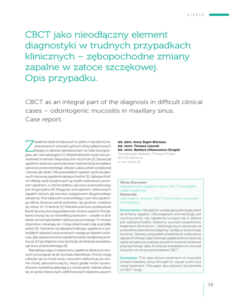 3 /2 015 CBCT jako nieodłączny element diagnostyki w trudnych przypadkach klinicznych – zębopochodne zmiany zapalne w zatoce szczękowej. Opis przypadku. CBCT as an integral part of the diagnosis in difficult clinical cases – odontogenic mucositis in maxillary sinus. Case report. Z apalenie zatok szczękowych to jedno z najczęściej rozpoznawanych schorzeń górnych dróg oddechowych będące w zakresie zainteresowań nie tylko laryngologów, ale i stomatologów [1]. Niejednokrotnie może ono powodować trudności diagnostyczne i lecznicze [2]. Zazwyczaj zapalenie zatok jest spowodowane niedrożnością kompleksu ujściowo-przewodowego, obszaru ujścia zatoki szczękowej i sitowej, ale około 10% przewlekłych zapaleń zatok szczękowych stanowią zapalenia zębopochodne [3]. Zębopochodne infekcje zatok szczękowych są zwykle izolowanym procesem zapalnym, a rola kompleksu ujściowo-przewodowego jest drugorzędna [4]. Mogą być one zejściem nieleczonych zapaleń ostrych, jak również następstwem długotrwałego zakażenia. Pod wpływem przewlekłego czynnika zapalnego błona śluzowa zatoki przerasta i jej grubośc zwiększa się nieraz 10-15-krotnie [3]. Wskutek przerostu podśluzówki tkanki łącznej powstają polipowate zmiany zapalne. Początkowo tworzą się na niewielkiej przestrzeni – zwykle w dnie zatoki ponad zębodołem zęba przyczynowego. Te zmiany stopniowo rozrastają się i mogą obejmować całą wyściołkę zatoki [5]. Szerzenie się zębopochodnego zapalenia w pozostałych zatokach przynosowych następuje dopiero wówczas, gdy zaawansowanie zapalenia zatoki szczękowej przekracza 2/3 jej objętości oraz dochodzi do blokady kompleksu ujściowo-przewodowego [6]. Największą wagę w rozpoznaniu zapalenia zatok przynosowych przywiązuje się do wywiadu lekarskiego. Chorzy mogą uskarżać się na nieżyt nosa z uczuciem zatkania go po stronie chorej, zaburzenia węchu, nieżyt gardła i krtani spowodowane wydzieliną spływającą z chorej zatoki. Jednak zdarza się, że oprócz klarownych, zdefiniowanych objawów, pacjent lek. dent. Anna Seget-Bieniasz lek. stom. Tomasz Lizurek lek. stom. Barbara Urbanowicz-Śmigiel Stomatologia Barbara i Tomasz Śmigiel 40-019 Katowice ul. św. Jacka 19 Słowa kluczowe: zębopochodne zapalenie zatok, CBCT (tomografia wiązki stożkowej) Keywords: odontogenic sinusitis, CBCT (cone beam computed tomography) Streszczenie: Naczęściej występujacą patologią zatok sa zmiany zapalne. Obowiązkiem stomatologa jest wychwycenie, czy zapalenie toczące się w zatoce jest zębopochodne. Staranny wywiad uzupełniony badaniem klinicznym i radiologicznym pozwala na postawienie prawidłowej diagnozy i podjęcie skutecznego leczenia. Opisany przypadek przedstawia wyleczenie zębopochodnego ograniczonego zapalenia blony śluzowej zatoki szczękowej poprzez powtórne leczenie kanałowe przyczynowego zęba. W artykule przedstawiono również korzyśsci ze stosowania badania CBCT. Summary: This case shows treatment of mucositis limited maxillary sinus through re-causal tooth root canal treatment. The paper also presents the benefits of CBCT study. 19 E N D O D O N CJA W P R AKT YCE 1 Ryc. 1. Zdjęcie pantomograficzne. Widoczne zmiany okołowierzchołkowe w okolicy zęba 26 oraz zaciemnienie zachyłka zębodołowego lewej zatoki szczękowej może zgłaszać dolegliwości, które trudno powiązać z zapaleniem zatok. Możliwe, że jedynymi objawami będą: bóle głowy umiejscowione najczęściej w okolicy czołowej, stałe uczucie zmęczenia, ociężałość, senność i niechęć do pracy [5]. W przypadku gdy podejrzewamy chorobę zatok, oprócz rutynowo wykonywanego zdjęcia pantomograficznego można rozszerzyć dokumentację radiologiczną o CBCT (tomografię wiązki stożkowej). Jest to najbardziej czuła metoda w wykrywaniu stanów zapalnych zatok [7]. CBCT wykrywa zmiany zapalne już na poziomie dyskretnego pogrubienia błony śluzowej wyścielającej zatokę szczękową. Dostarcza mnóstwa informacjii na temat umiejscowienia tych zmian i ich wielkości, jest najlepszą metodą do wizualizacji erozji części kostnych. Obrazuje kompleksy ujściowo-przewodowe, a także stosunki anatomiczne struktur zawartych pomiędzy przednim dołem czaszki i jamą nosową [1]. Przebieg oraz postępowanie lecznicze u chorych z zębopochodnym zapaleniem zatoki szczękowej różnią się od klasycznego odnosowego i ściśle wiążą się z odmienną etiologią i patomechanizmem [8]. W przypadku zębopochodnej etiologii zapalenia obowiązuje triada postępowania leczniczego obejmująca: leczenie zmian odzębowych, drenaż chirurgiczny, leczenie przeciwbakteryjne [2]. Istnieje pogląd, że przy niewielkim zaawansowaniu zapalenia toczącego się w zatoce szczękowej w przypadku drożnego jej ujścia wystarczy usunąć zębopochodną przyczynę zapalenia [9]. Przedstawiony poniżej przypadek pokazuje, że prawidłowe chemomechaniczne opracowanie oraz szczelne wypełnienie systemu kanałowego zębów tworzy warunki do samoistnego gojenia się zmian w tkankach okołowierzchołkowych oraz śluzowce zatoki szczękowej. 20 Opis przypadku Pacjentka S.S., lat 36, zgłosiła się w celu sanacjii jamy ustnej. Zdjęcie pantomograficzne wykonane w dniu pierwszej wizyty uwidoczniło m.in. obecność zmian okołowierzchołkowych przy korzeniach zęba 26 oraz zaciemnienie okolicy zachyłka zębodołowego lewej zatoki szczękowej (ryc. 1). W wywiadzie pacjentka zgłaszała okresowe bóle głowy, nasilające się przy zmianach pogody o różnym charakterze i nasileniu. Ból ten utrzymywał się od kilku lat, a jego przyczyna nie została jak dotąd zdiagnozowana. Ze względu na to, że objawy kliniczne wskazywały na zębopochodne zapalenie blony śluzowej lewej zatoki szczękowej zalecono pilne powtórne leczenie kanałowe zęba 26. Powtórne leczenie kanałowe rozpoczęto od wykonania zdjęcia przylegającego (ryc. 2). Po podaniu znieczulenia nasiękowego odizolowano 