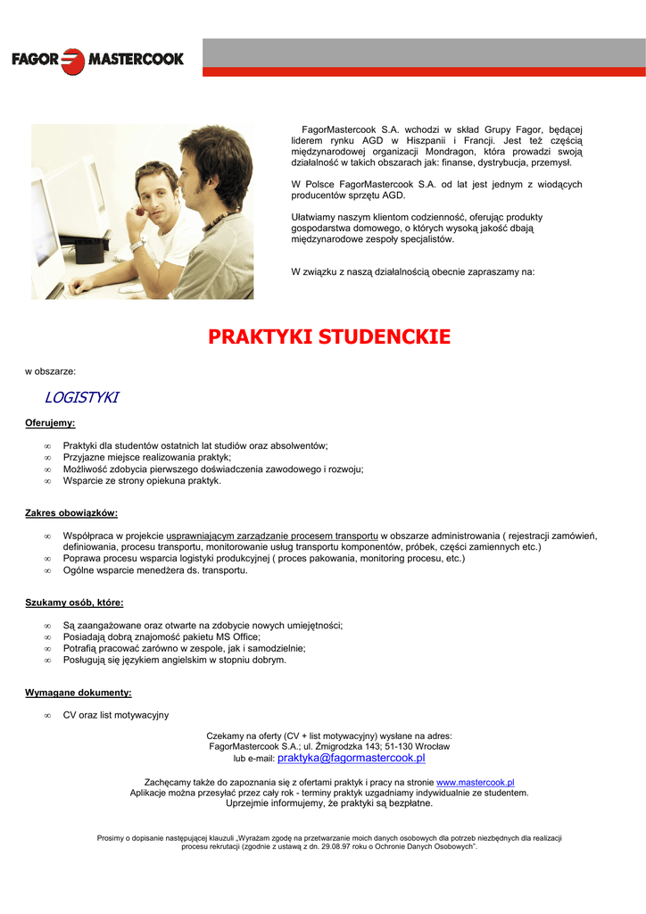 FagorMastercook S.A. wchodzi w skład Grupy Fagor, będącej liderem rynku AGD w Hiszpanii i Francji. Jest teŜ częścią międzynarodowej organizacji Mondragon, która prowadzi swoją działalność w takich obszarach jak: finanse, dystrybucja, przemysł. W Polsce FagorMastercook S.A. od lat jest jednym z wiodących producentów sprzętu AGD. Ułatwiamy naszym klientom codzienność, oferując produkty gospodarstwa domowego, o których wysoką jakość dbają międzynarodowe zespoły specjalistów. W związku z naszą działalnością obecnie zapraszamy na: PRAKTYKI STUDENCKIE w obszarze: LOGISTYKI Oferujemy: • • • • Praktyki dla studentów ostatnich lat studiów oraz absolwentów; Przyjazne miejsce realizowania praktyk; MoŜliwość zdobycia pierwszego doświadczenia zawodowego i rozwoju; Wsparcie ze strony opiekuna praktyk. Zakres obowiązków: • • • Współpraca w projekcie usprawniającym zarządzanie procesem transportu w obszarze administrowania ( rejestracji zamówień, definiowania, procesu transportu, monitorowanie usług transportu komponentów, próbek, części zamiennych etc.) Poprawa procesu wsparcia logistyki produkcyjnej ( proces pakowania, monitoring procesu, etc.) Ogólne wsparcie menedŜera ds. transportu. Szukamy osób, które: • • • • Są zaangaŜowane oraz otwarte na zdobycie nowych umiejętności; Posiadają dobrą znajomość pakietu MS Office; Potrafią pracować zarówno w zespole, jak i samodzielnie; Posługują się językiem angielskim w stopniu dobrym. Wymagane dokumenty: • CV oraz list motywacyjny Czekamy na oferty (CV + list motywacyjny) wysłane na adres: FagorMastercook S.A.; ul. śmigrodzka 143; 51-130 Wrocław lub e-mail: [email protected] Zachęcamy takŜe do zapoznania się z ofertami praktyk i pracy na stronie www.mastercook.pl Aplikacje moŜna przesyłać przez cały rok - terminy praktyk uzgadniamy indywidualnie ze studentem. Uprzejmie informujemy, Ŝe praktyki są bezpłatne. Prosimy o dopisanie następującej klauzuli „WyraŜam zgodę na przetwarzanie moich danych osobowych dla potrzeb niezbędnych dla realizacji procesu rekrutacji (zgodnie z ustawą z dn. 29.08.97 roku o Ochronie Danych Osobowych”.