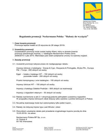 Neckermann Polska Biuro PodróŜy Sp. z o.o. Ul. Dubois 9 00-182 Warszawa Tel. (4822) 536 9898 Fax: (4 22) 635 9694 Regulamin promocji Neckermann Polska "Rabaty do wycięcia” 1. Czas trwania promocji. Promocja będzie trwała od 25 stycznia do 28 lutego 2010r. 2. Uczestnicy promocji Uczestnikiem promocji moŜe zostać kaŜdy Klient, który w okresie trwania promocji zarezerwuje imprezę z katalogów Neckermann Polska Zima 2009/2010 i Lato 2010. Miarodajny jest dzień podpisania umowy na wybrany wyjazd. 3. Zasady promocji 3.1. Uczestnik promocji nabywa prawo do następującego rabatu: Imprezy lotnicze z katalogów: Grecja & Cypr, Hiszpania & Portugalia, Afryka Płn., Europa Płd. i Turcja - 200 złotych od osoby Egipt – hotele z katalogu HIT – 150 złotych od osoby pozostałe hotele - 200 złotych od osoby Przelot trampingowy z w/w katalogów - 100 złotych od osoby Imprezy lotnicze HIT – 150 złotych od osoby Imprezy z katalogu Dalekie PodróŜe – 600 złotych za rezerwację Imprezy z dojazdem własnym – 50 złotych od osoby 3.2. Rabaty wymienione w pkt.3.1 otrzymują jedynie pełnopłatni uczestnicy wyjazdów. W przypadku imprez lotniczych rabat dotyczy tylko wylotów z portów lotniczych w Polsce. 3.3. Na jedną rezerwację moŜe być wykorzystany tylko jeden kupon. 3.4. Rabaty nie dotyczą imprez typu Last Minute i Joker. 3.5. Warunkiem uzyskania rabatu jest przesłanie oryginalnego kuponu pocztą do dnia 15.03.2010r. na adres: Neckermann Polska BP Sp. z o.o. Ul. Dubois 9 00-182 Warszawa Zarząd Prezes Krzysztof Piątek Siedziba: Warszawa Regon: 012238347 NIP 525-15-56-861 Wysokość kapitału: 4.874.000 PLN Sąd Rejonowy dla M.ST. Warszawy XII Wydział Gospodarczy KRS Numer KRS: 0000162234