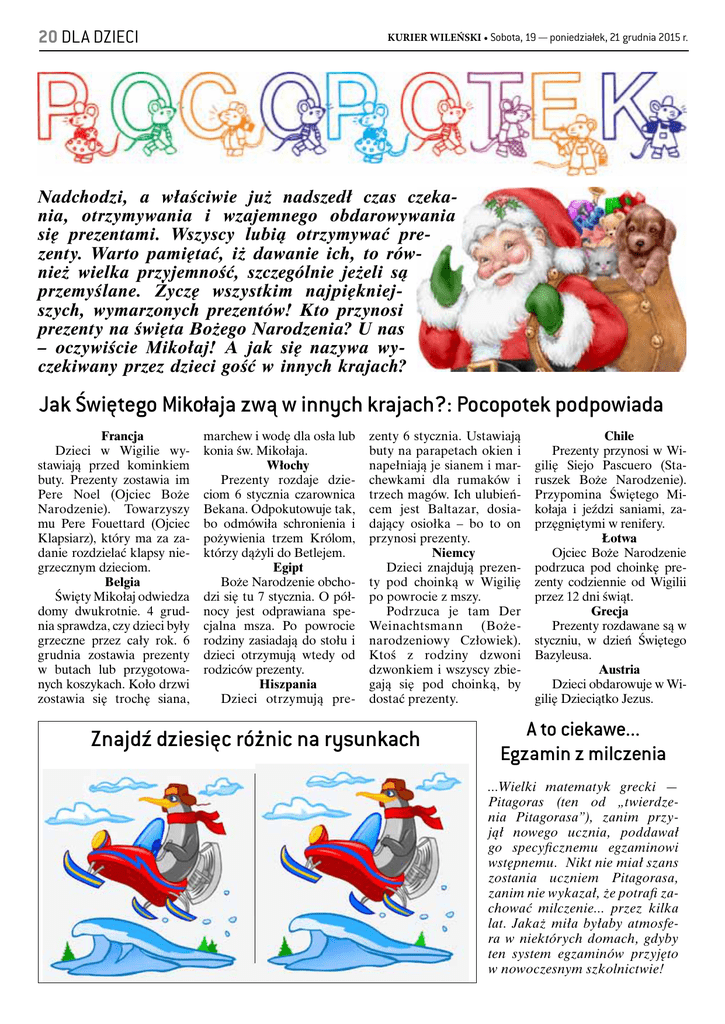 20 DLA DZIECI KURIER WILEŃSKI • Sobota, 19 — poniedziałek, 21 grudnia 2015 r. Nadchodzi, a właściwie już nadszedł czas czekania, otrzymywania i wzajemnego obdarowywania się prezentami. Wszyscy lubią otrzymywać prezenty. Warto pamiętać, iż dawanie ich, to również wielka przyjemność, szczególnie jeżeli są przemyślane. Życzę wszystkim najpiękniejszych, wymarzonych prezentów! Kto przynosi prezenty na święta Bożego Narodzenia? U nas – oczywiście Mikołaj! A jak się nazywa wyczekiwany przez dzieci gość w innych krajach? Jak Świętego Mikołaja zwą w innych krajach?: Pocopotek podpowiada Francja Dzieci w Wigilie wystawiają przed kominkiem buty. Prezenty zostawia im Pere Noel (Ojciec Boże Narodzenie). Towarzyszy mu Pere Fouettard (Ojciec Klapsiarz), który ma za zadanie rozdzielać klapsy niegrzecznym dzieciom. Belgia Święty Mikołaj odwiedza domy dwukrotnie. 4 grudnia sprawdza, czy dzieci były grzeczne przez cały rok. 6 grudnia zostawia prezenty w butach lub przygotowanych koszykach. Koło drzwi zostawia się trochę siana, marchew i wodę dla osła lub konia św. Mikołaja. Włochy Prezenty rozdaje dzieciom 6 stycznia czarownica Bekana. Odpokutowuje tak, bo odmówiła schronienia i pożywienia trzem Królom, którzy dążyli do Betlejem. Egipt Boże Narodzenie obchodzi się tu 7 stycznia. O północy jest odprawiana specjalna msza. Po powrocie rodziny zasiadają do stołu i dzieci otrzymują wtedy od rodziców prezenty. Hiszpania Dzieci otrzymują pre- zenty 6 stycznia. Ustawiają buty na parapetach okien i napełniają je sianem i marchewkami dla rumaków i trzech magów. Ich ulubieńcem jest Baltazar, dosiadający osiołka – bo to on przynosi prezenty. Niemcy Dzieci znajdują prezenty pod choinką w Wigilię po powrocie z mszy. Podrzuca je tam Der Weinachtsmann (Bożenarodzeniowy Człowiek). Ktoś z rodziny dzwoni dzwonkiem i wszyscy zbiegają się pod choinką, by dostać prezenty. Znajdź dziesięc różnic na rysunkach Chile Prezenty przynosi w Wigilię Siejo Pascuero (Staruszek Boże Narodzenie). Przypomina Świętego Mikołaja i jeździ saniami, zaprzęgniętymi w renifery. Łotwa Ojciec Boże Narodzenie podrzuca pod choinkę prezenty codziennie od Wigilii przez 12 dni świąt. Grecja Prezenty rozdawane są w styczniu, w dzień Świętego Bazyleusa. Austria Dzieci obdarowuje w Wigilię Dzieciątko Jezus. A to ciekawe... Egzamin z milczenia ...Wielki matematyk grecki — Pitagoras (ten od „twierdzenia Pitagorasa”), zanim przyjął nowego ucznia, poddawał go specyficznemu egzaminowi wstępnemu. Nikt nie miał szans zostania uczniem Pitagorasa, zanim nie wykazał, że potrafi zachować milczenie... przez kilka lat. Jakaż miła byłaby atmosfera w niektórych domach, gdyby ten system egzaminów przyjęto w nowoczesnym szkolnictwie! KURIER WILEŃSKI • Sobota, 19 — poniedziałek, 21 grudnia 2015 r. Pokoloruj rysunek DLA DZIECI 21 Gry i zabawy: Jak w Filmie Podzielcie się na drużyny – nie mniejsze niż po trzech graczy. Każda drużyna wymyśla gatunki filmów i rysuje ich symbole na kartkach, np. serce oznacza romans, pistolet – kryminał, klaun to komedia, a kapelusz kowbojski – western. Połóżcie gotowe kartki jedna na drugiej pomalowana strona do dołu. Oprócz tego zapiszcie na osobnych karteczkach kilka haseł oznaczających czynności lub sytuacje, np.: „podwieczorek”, „spacer”, „praca”, „odpoczynek” itp.Teraz zbierzcie wszystkie karteczki i dobrze je wymieszajcie. Drużyny losują kolejno kartkę z rodzajem filmu i haseł, ale uwaga, nie wolno zdradzać, co Wam przypadło! A teraz krótka narada i czas na przedstawienie: odegrajcie krótką scenkę albo opowiedzcie historię pasującą do tematu. Ciekawe, czy ktoś z Was posiada talent aktorski… Zbliża się najbardziej uroczysta kolacja w roku... Zbliża się najbardziej uroczysta kolacja w roku… Bądźmy do niej przygotowani. Postarajmy się, żeby wszystko wypadło tego wieczoru jak najlepiej. Żeby móc wymagać tego od innych swoich domowników, najpierw sprawdźmy, czy sami jesteśmy w porządku. Czy wiecie, że... słowo „moment” wcale nie oznaczało pierwotnie jakiegoś nieokreślonego, lecz krótkiego odcinka czasu. Moment jest starą angielską miarą czasu, równą dokładnie 1 minucie i 30 sekundom. Świąteczny rebus dla bystrzaków SPRAWY OCZYWISTE • Przed jedzeniem należy zawsze pójść do toalety i umyć ręce. • Przy stole należy zachować właściwą postawę: również w przerwach między daniami powinno się siedzieć wyprostowanym. Łokcie nie mogą dotykać stołu. • Odgłosy związane z trawieniem są niedopuszczalne, i to nie tylko przy jedzeniu; jest to podstawowy element dobrego wychowania. • Powszechnie naganne są również takie przyzwyczajenia jak ssanie palców i obgryzanie paznokci. • Dozwolone jest oczywiście wycieranie nosa chusteczką, trzeba jednak odwrócić się od stołu i nie może to trwać zbyt długo. Najzręczniej jest wstać na chwilę i odejść parę kroków os stołu. • Mlaskanie i siorbanie wcale nie oznaczają, że potrawy nam szczególnie smakują; takie odgłosy uważane są za wielki nietakt wobec innych osób siedzących przy stole. • Między poszczególnymi daniami nie wolno żuć gumy.